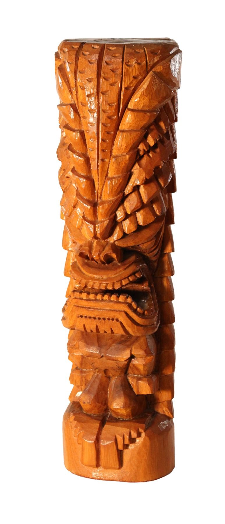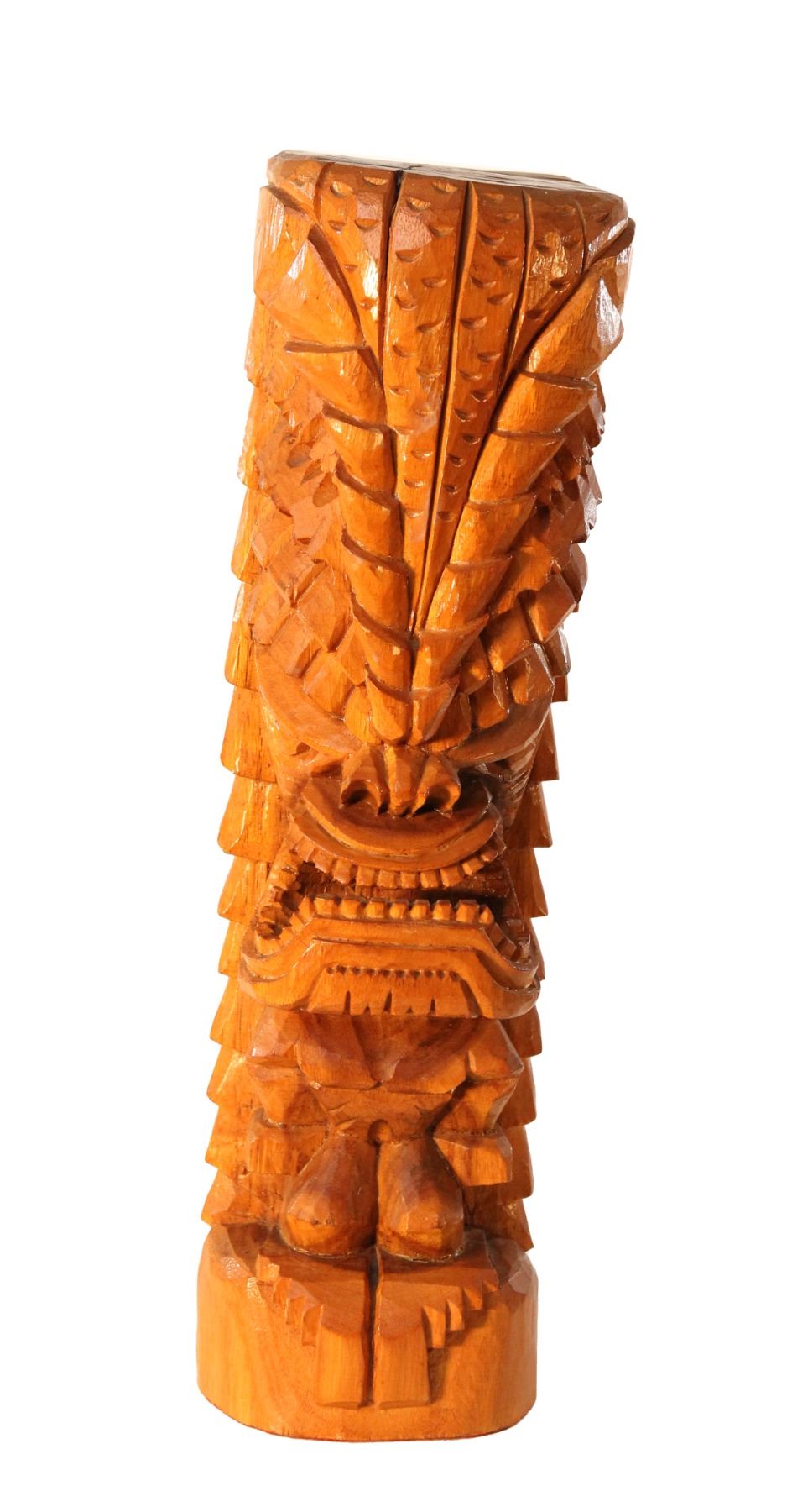 CARVED KAULANI STATE PRISON TIKI FIGURE WITH LONG HEADDRESS ON BASE.