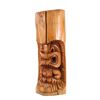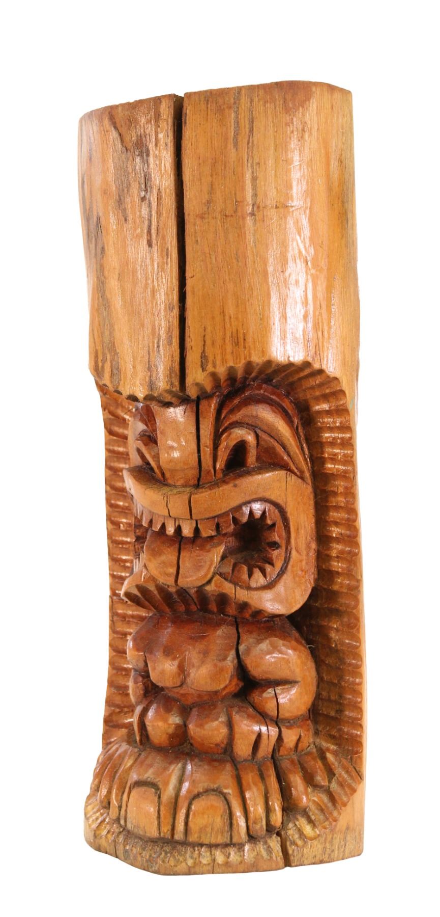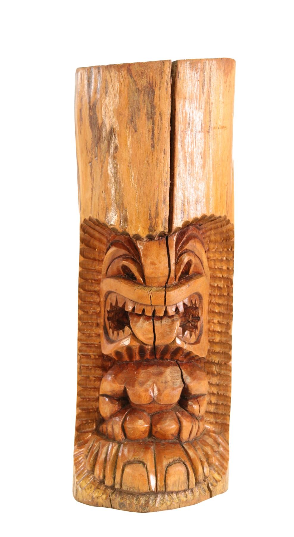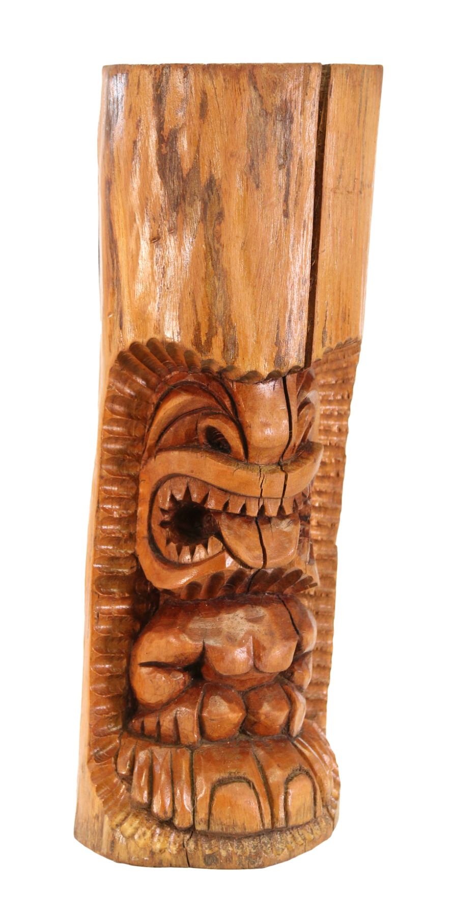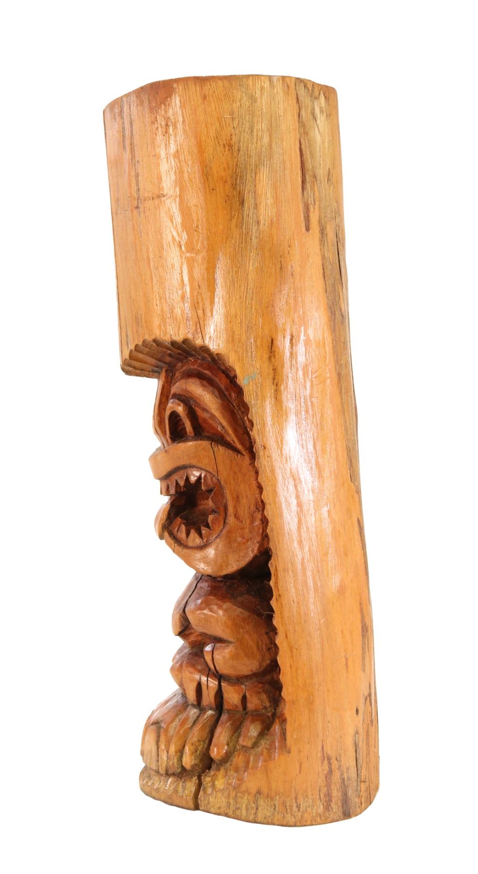 (1960s) Impressive full wood log deep carved Tiki God KU features exceptional craftsmanship with its open mouth and hanging tongue. Combined with the natural splits in the wood, and defined grains, this is an attention grabber. 13.75"x5". VG small blue paint spot on side of item.
