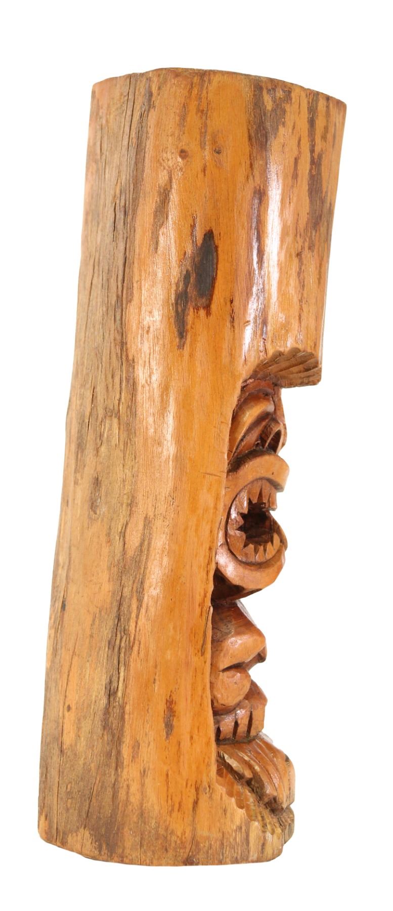 CARVED KAULANI STATE PRISON TIKI FIGURE WITH NATURAL LOG DETAIL.
