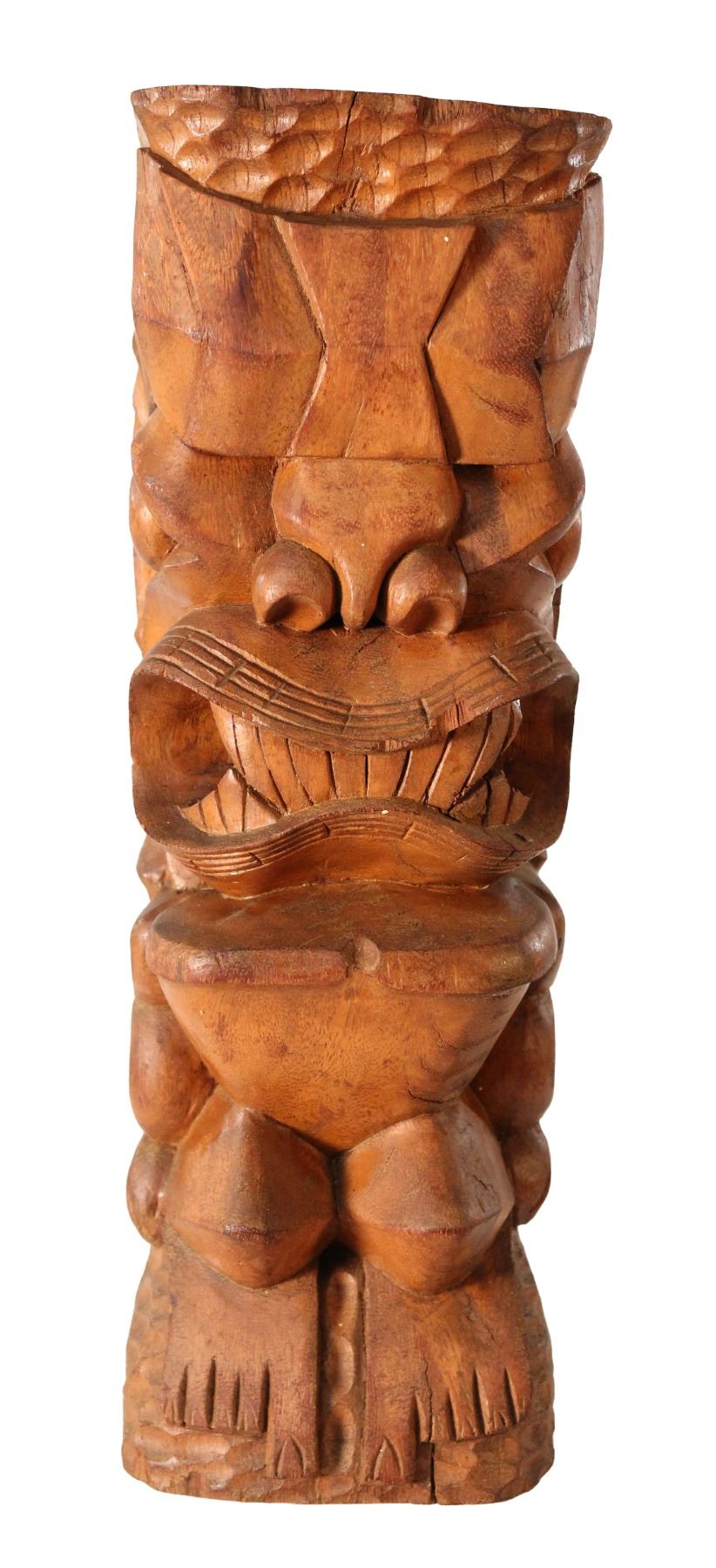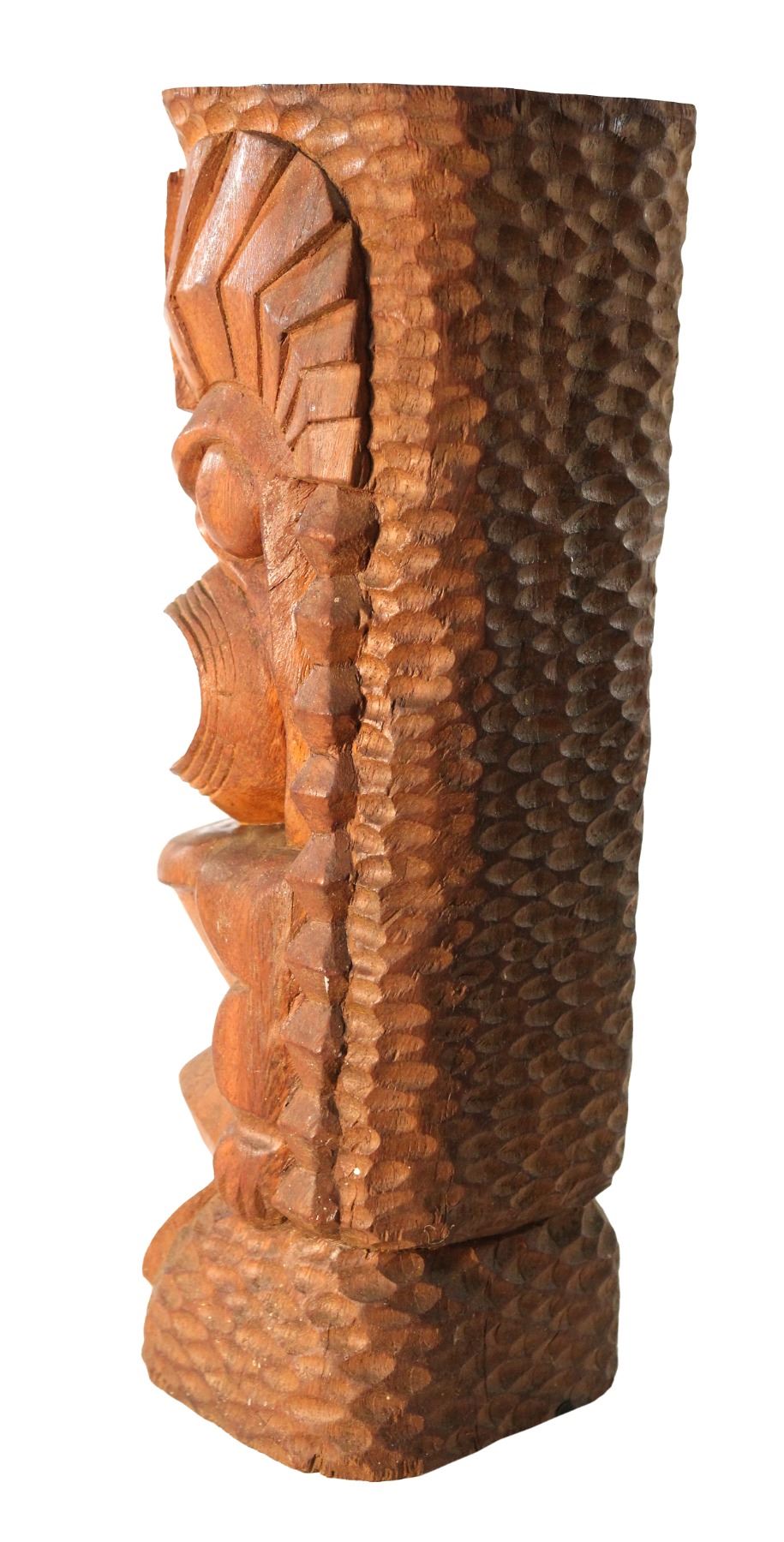 (1960s) A prime figure of the infamous Tiki statues created within the penal system of Hawaii. Bulging eyes, big hanging toes and fanciful design. Solid wood. 18.25"x6". VG some minor chipping.