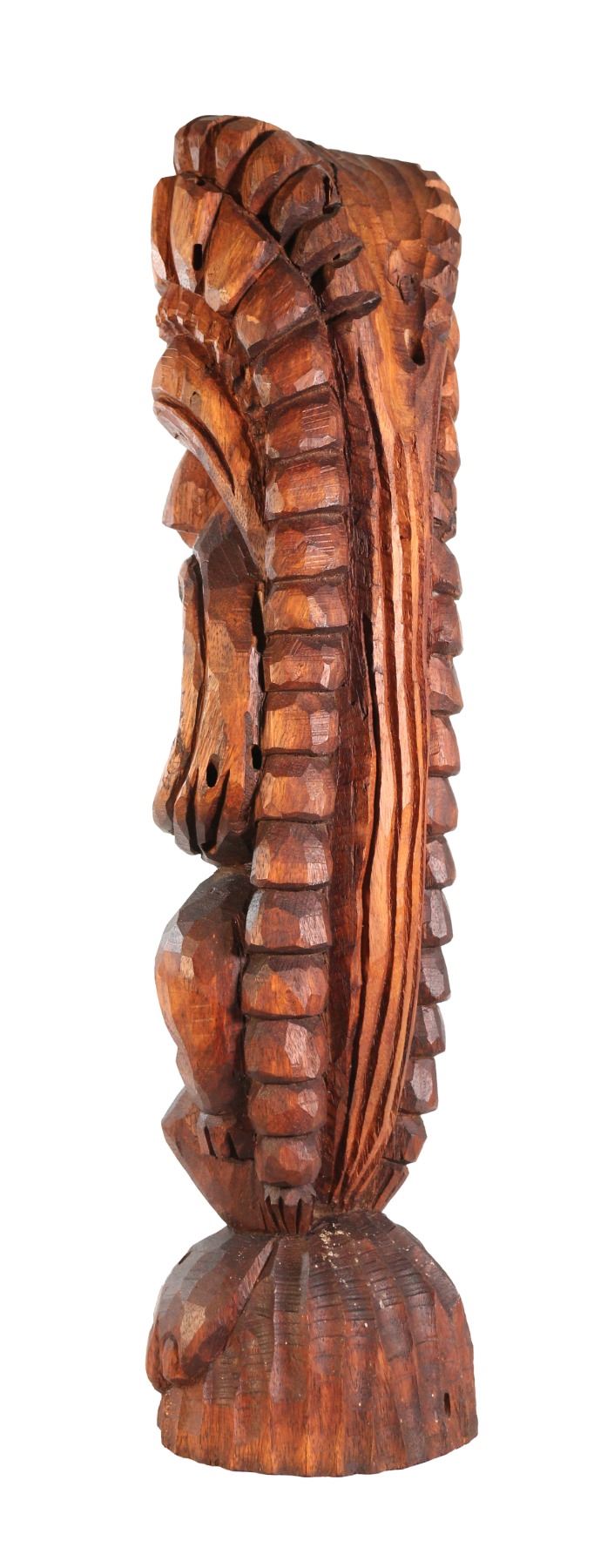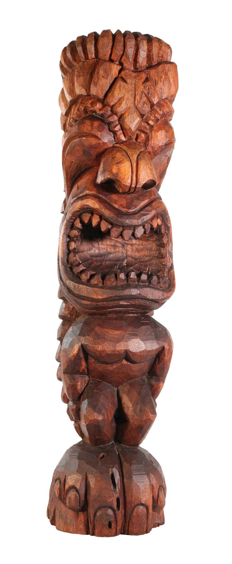 (1960s) Prime example of the famed "Prison Tiki" figures created in Hawaii. This substantial hand carved Tiki, standing over 2 ft tall features the iconic "Big Toes" hanging over the base. Solid wood. 26.75"x7". VG+.