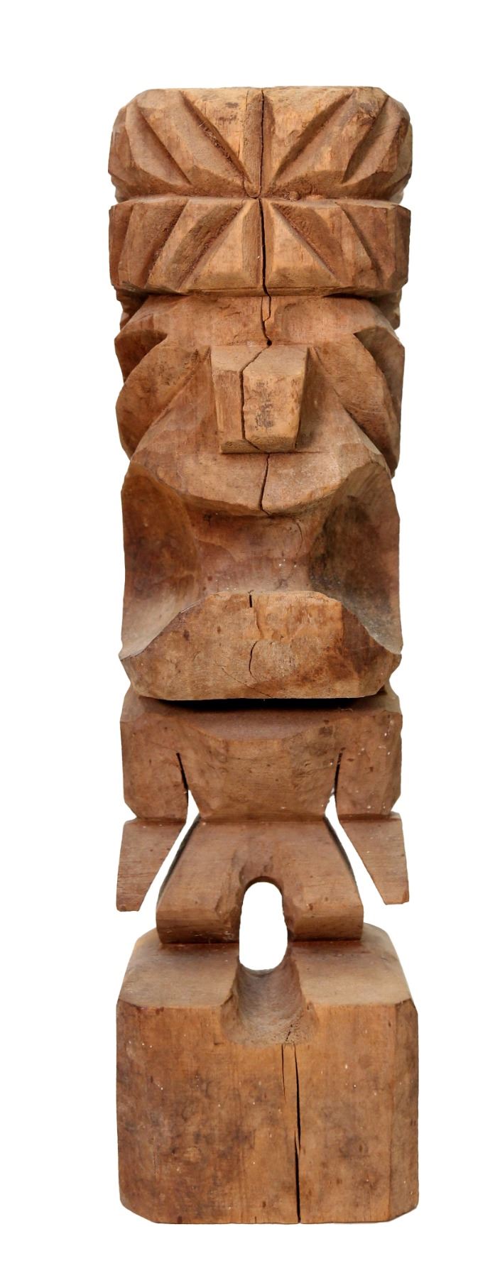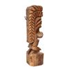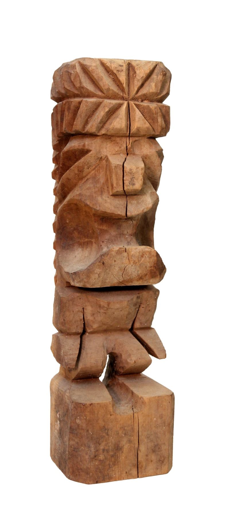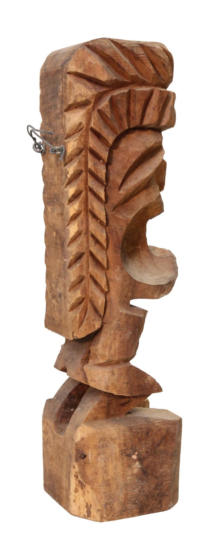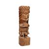 (1960s) A highly unusual carving featuring a fierce warrior with a massively large head with wide mouth and sharp teeth atop a extremely small body. Solid wood on tall base. Nice sizable Tiki.16.75"x5". VG Some minor wear.