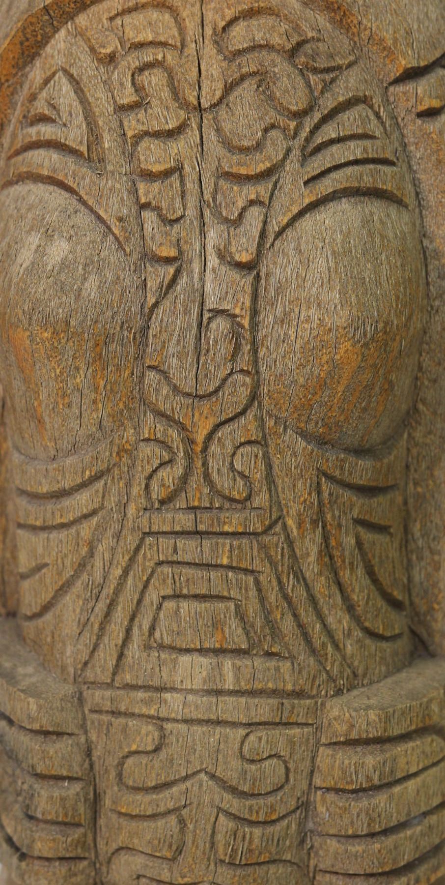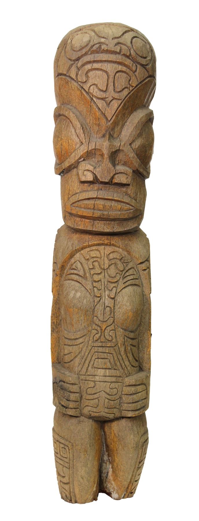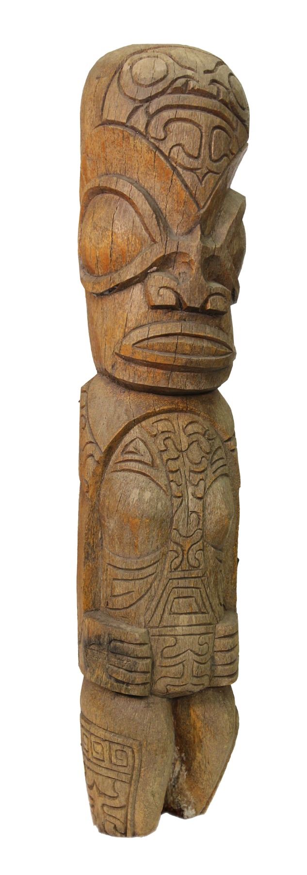 (1990s) Hand carved Maori Tiki statue features tribal tattoo patterns on body. Solid wood on base. 36"x8". GOOD condition overall with wood deterioration on bottom from display outdoors.
