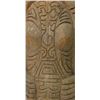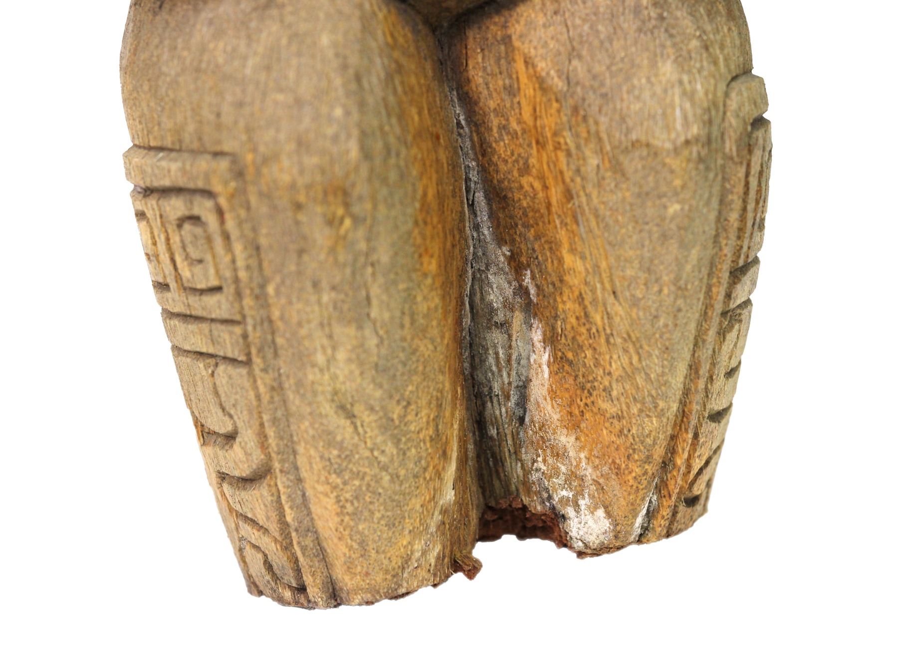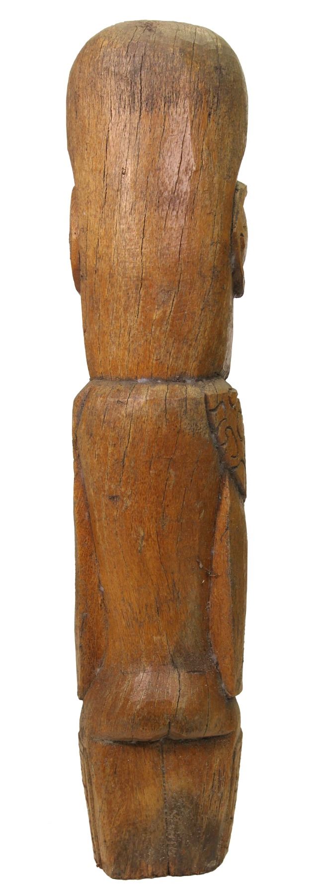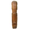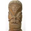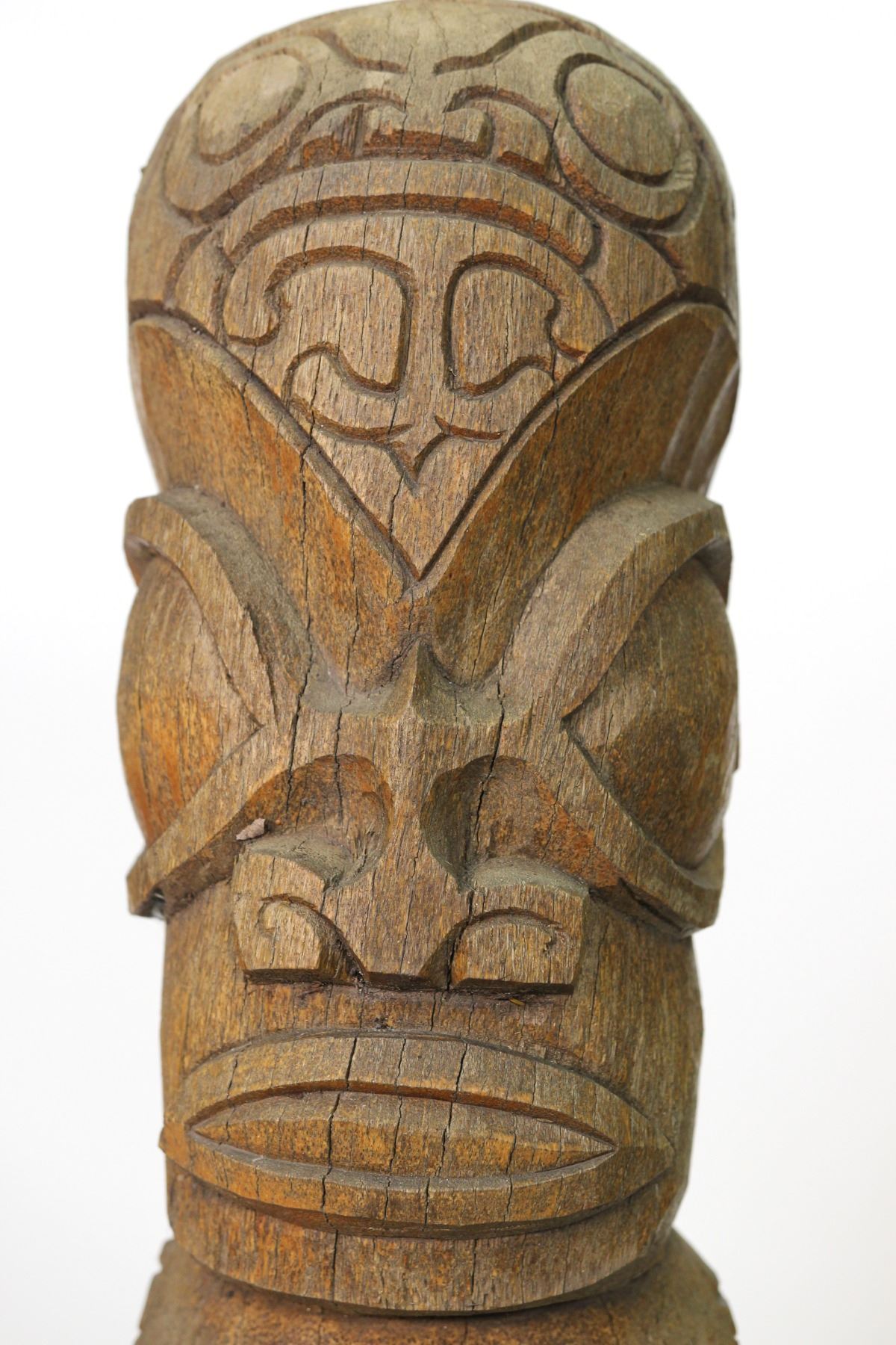 (1990s) Hand carved Maori Tiki statue features tribal tattoo patterns on body. Solid wood on base. 36"x8". GOOD condition overall with wood deterioration on bottom from display outdoors.