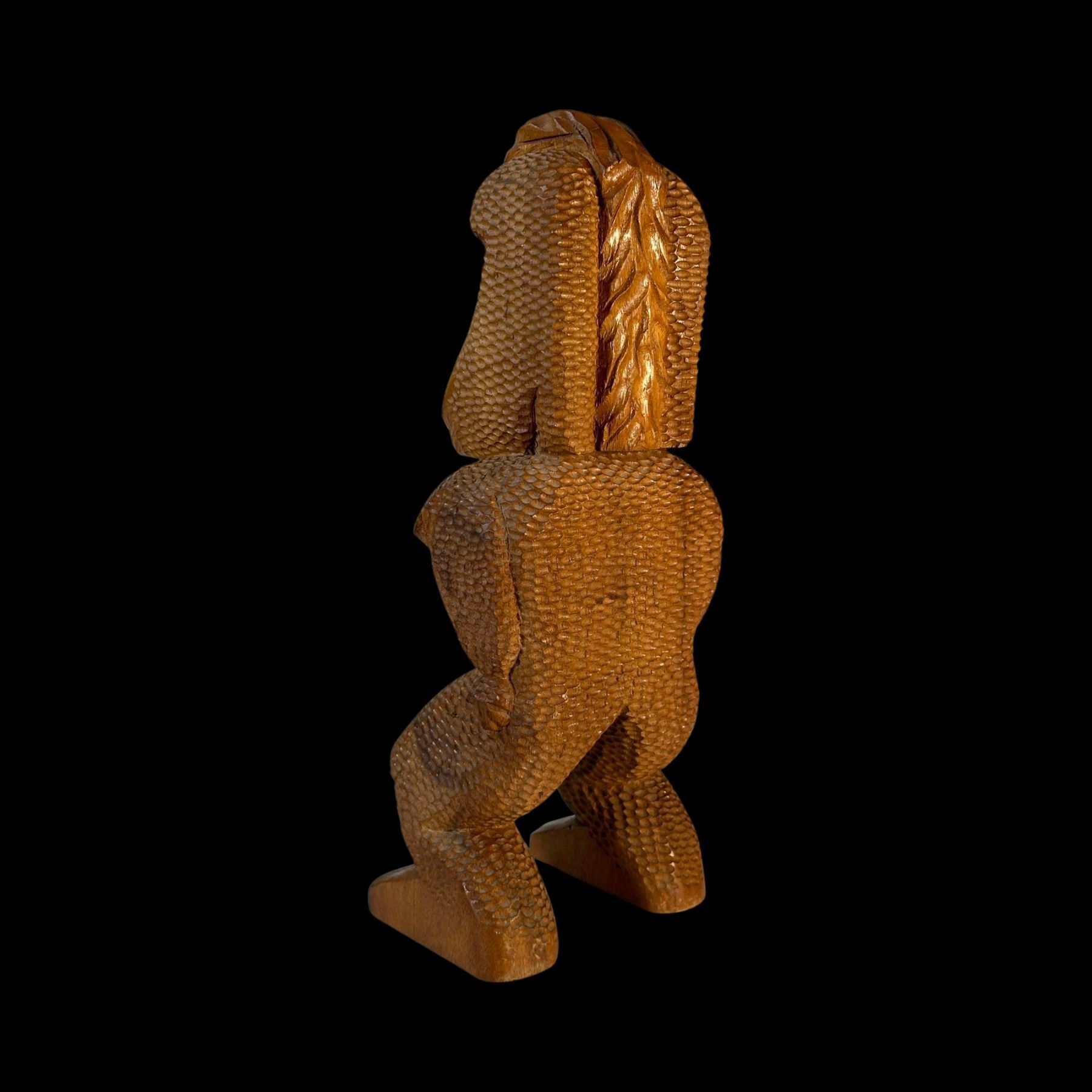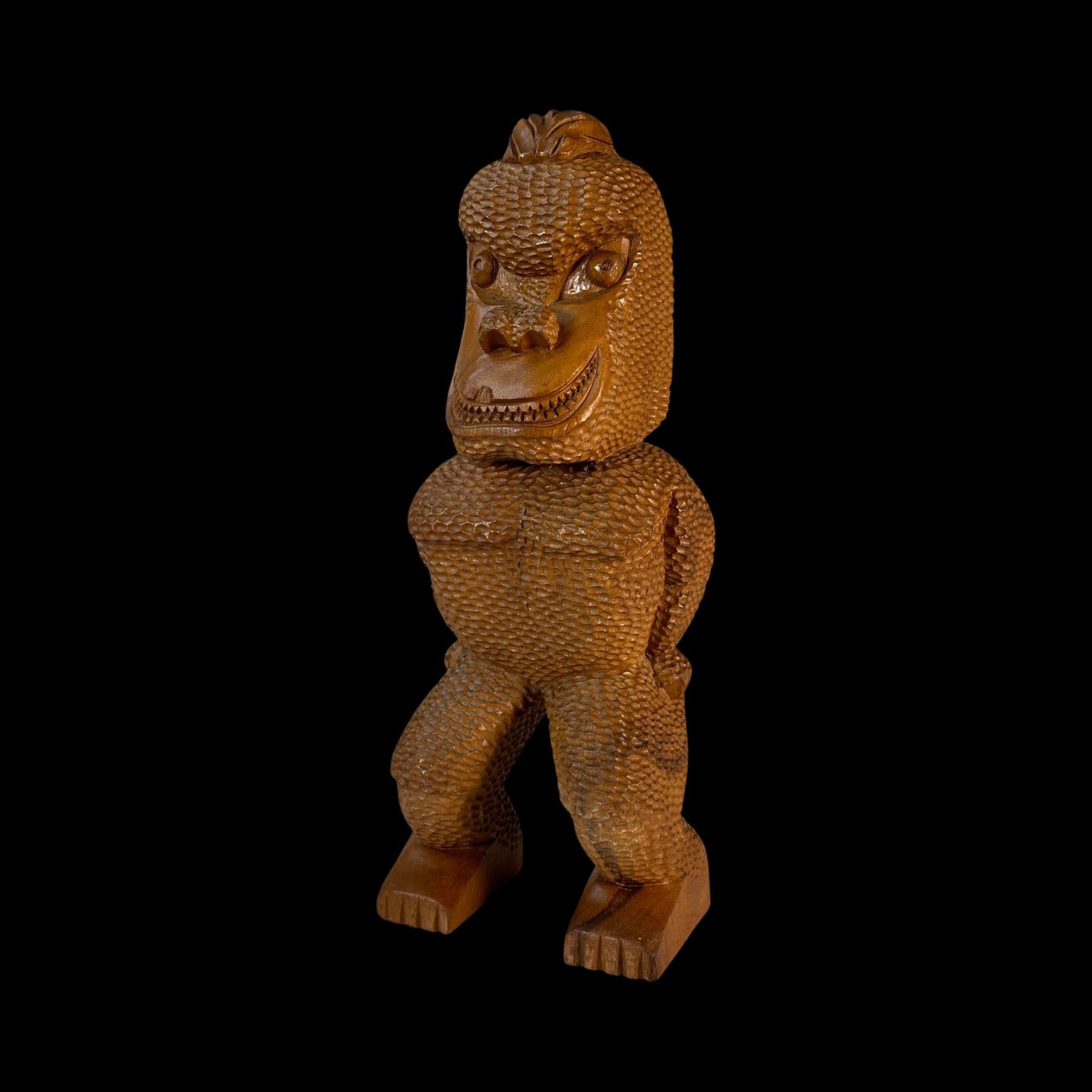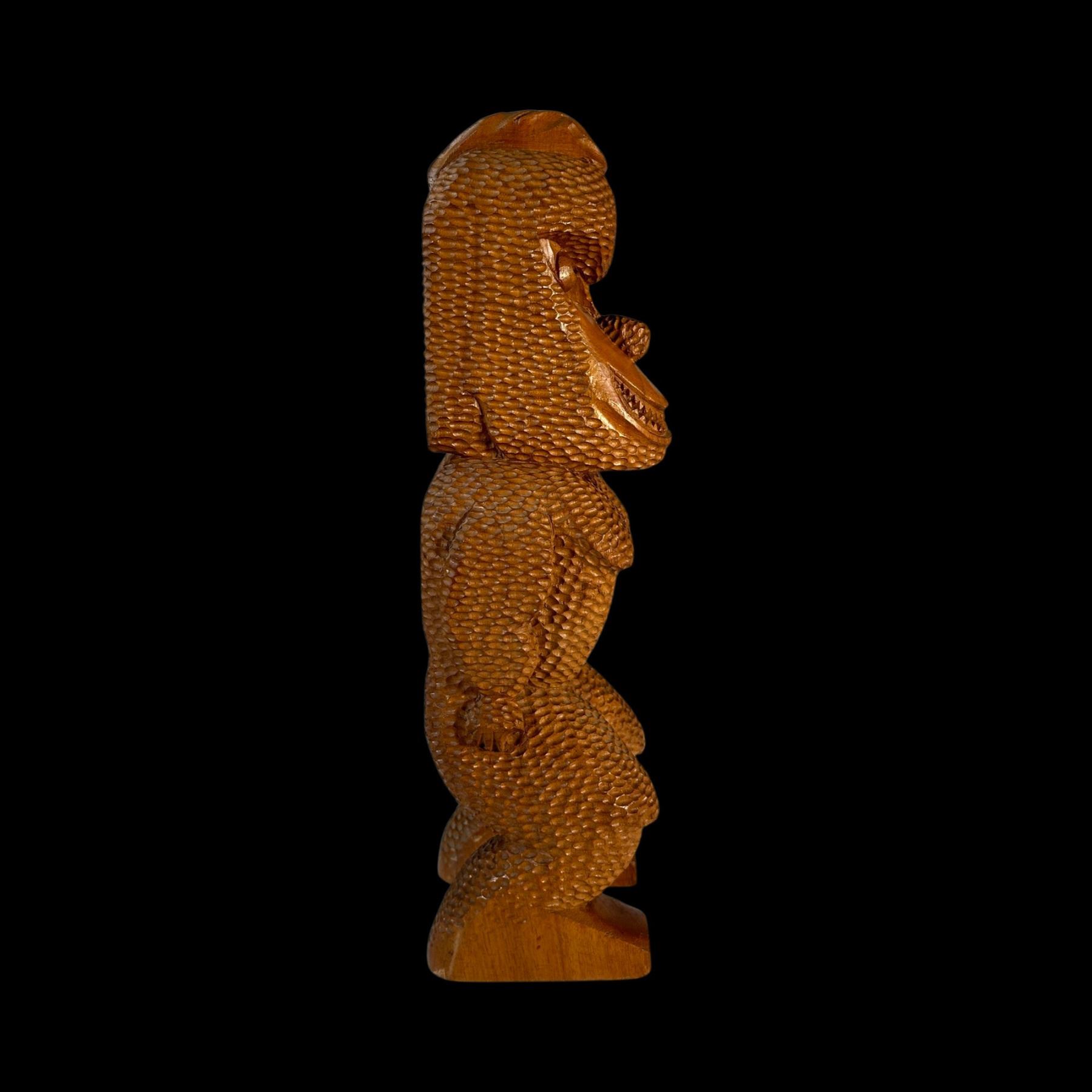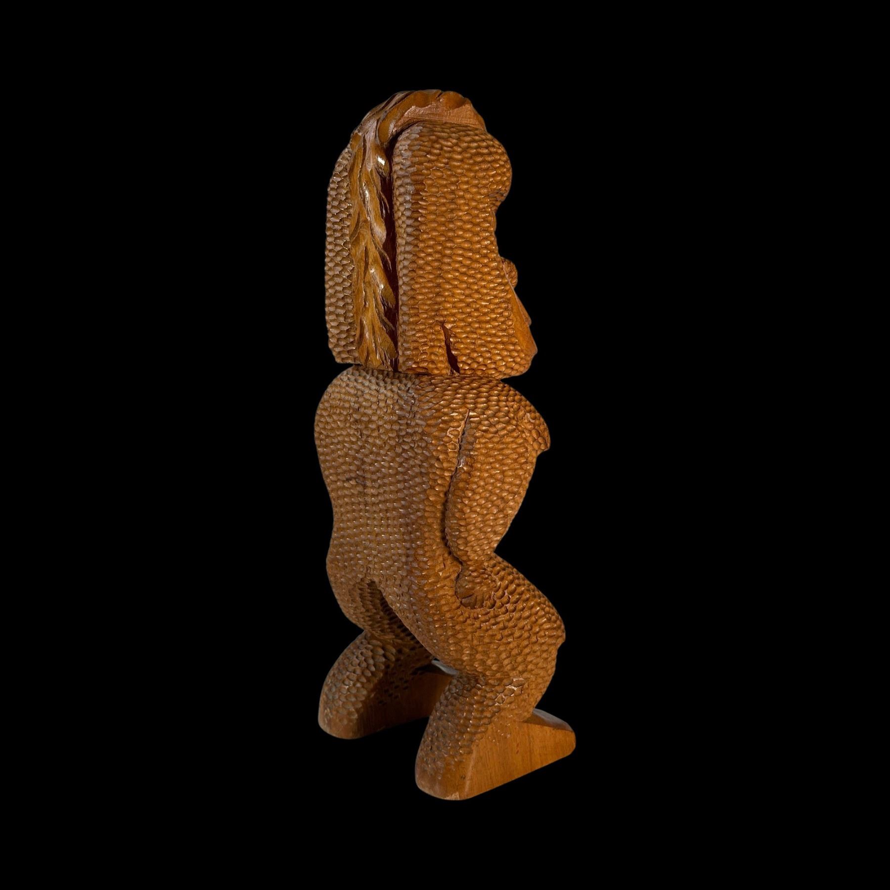 (1962) A unique Hawaiian design Tiki with a carved "fur" surface. Stamped under the base and dated 1962. VG+ with small chip out of upper lip. 7"x18.5"x5".