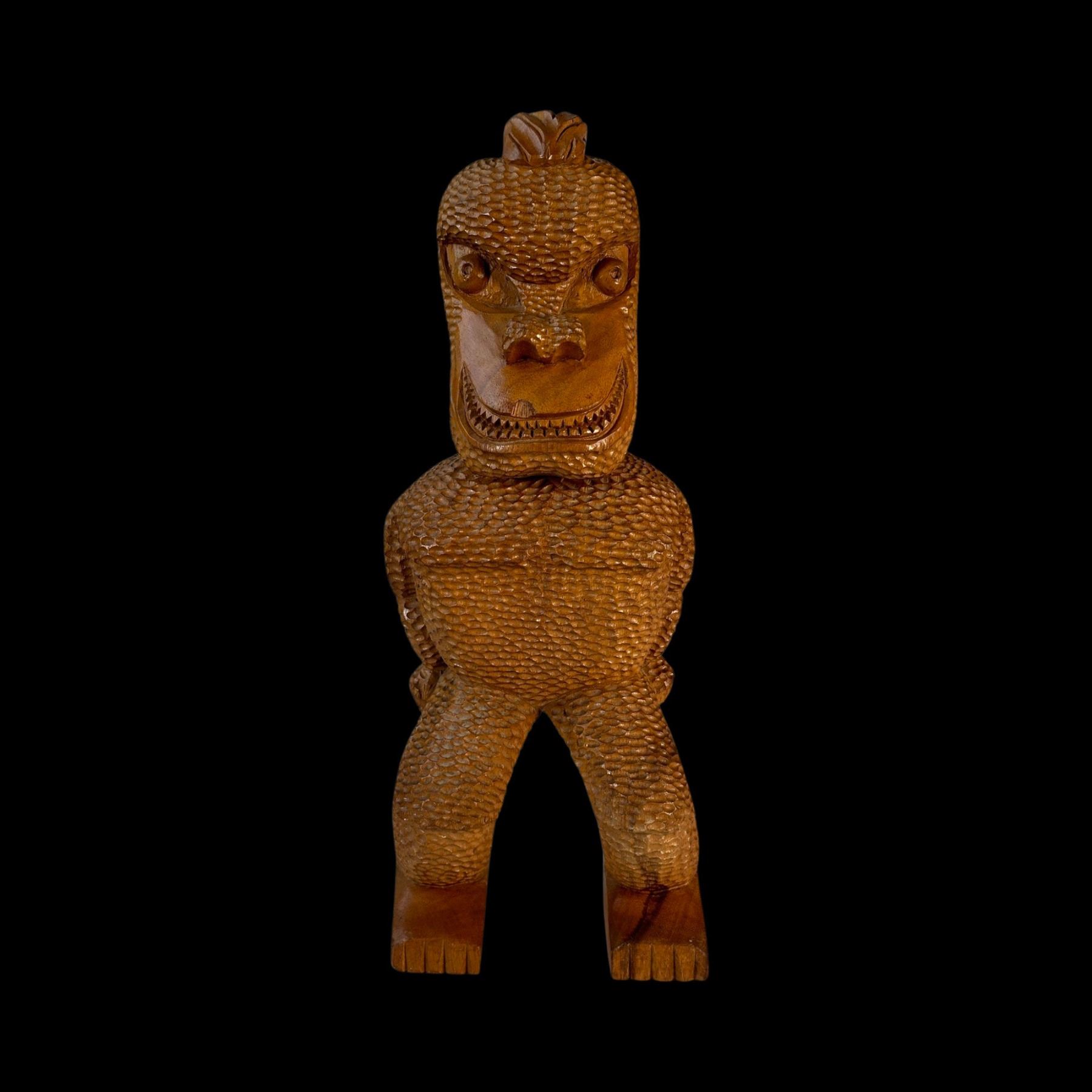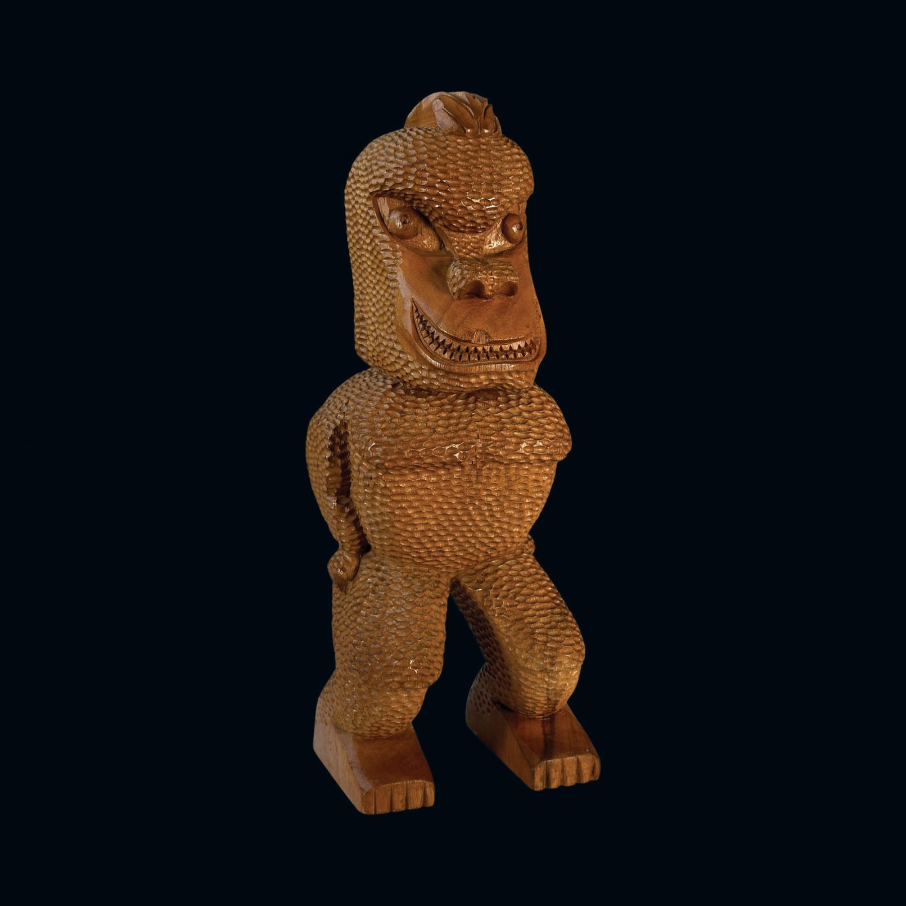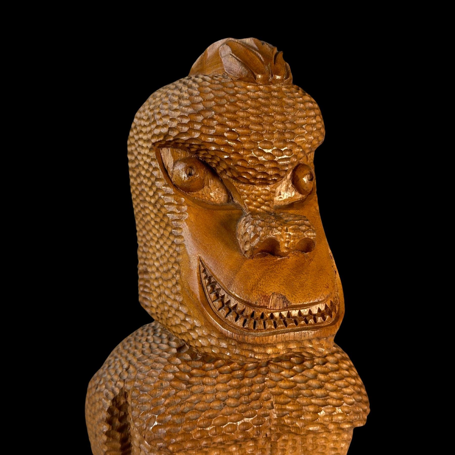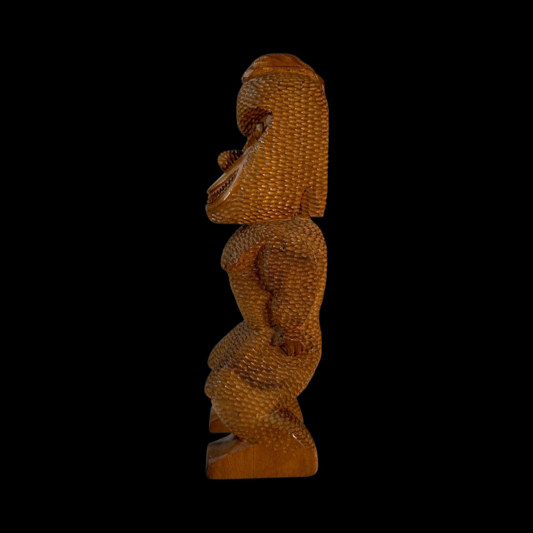 (1962) A unique Hawaiian design Tiki with a carved "fur" surface. Stamped under the base and dated 1962. VG+ with small chip out of upper lip. 7"x18.5"x5".