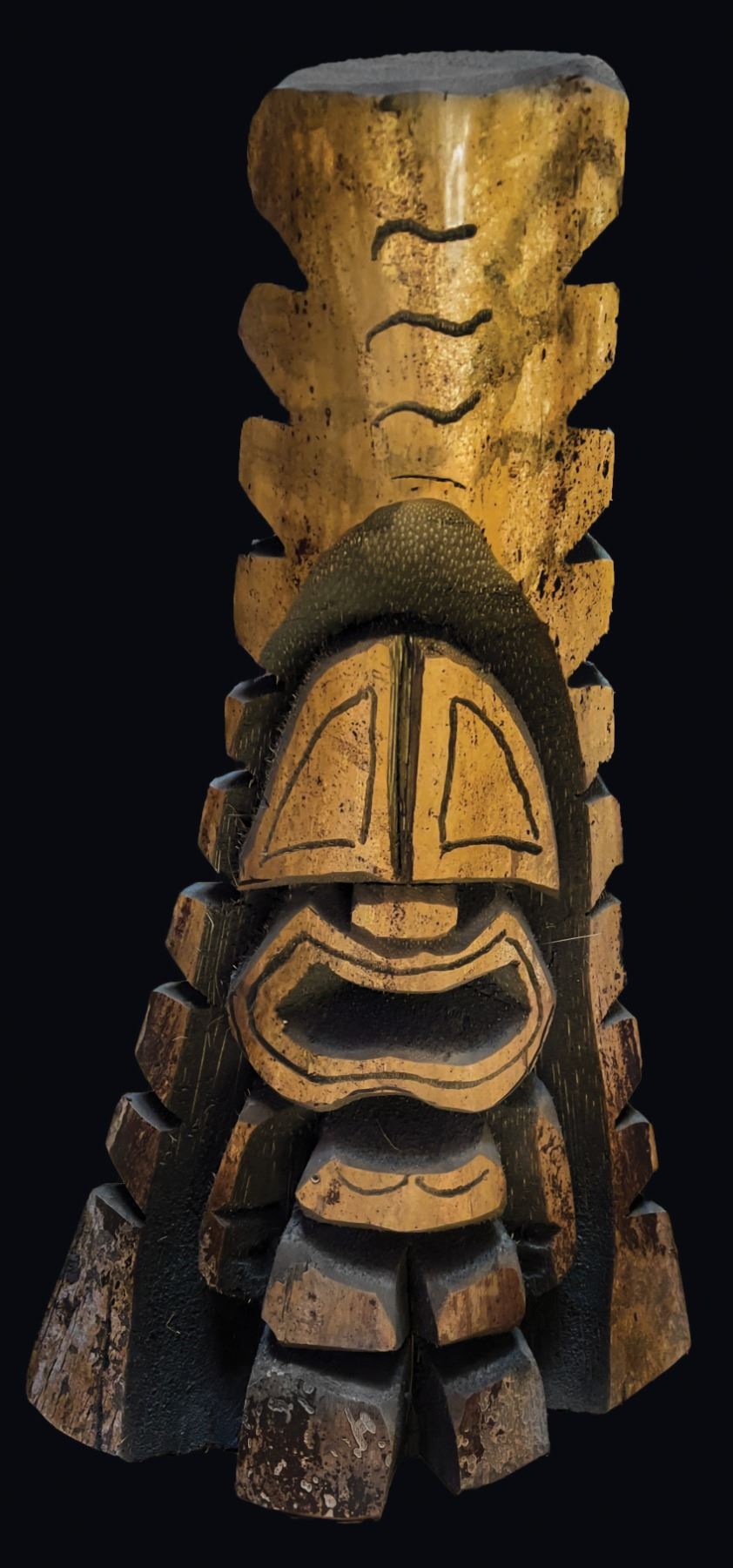 (1960-90s) OA began making these in the late 1950s out of a particular part of the palm frond where its stout construction allowed for more figural, self standing tikis. These were eventually farmed out to carvers in Mexico who would cross the border with a carload of these for OA's wholesale purchase. This practice continued into the late 1990s. Here is a sample of a gold sprayed palm tiki idol that according to Bob, was never put into production. 16"x8". VG+.