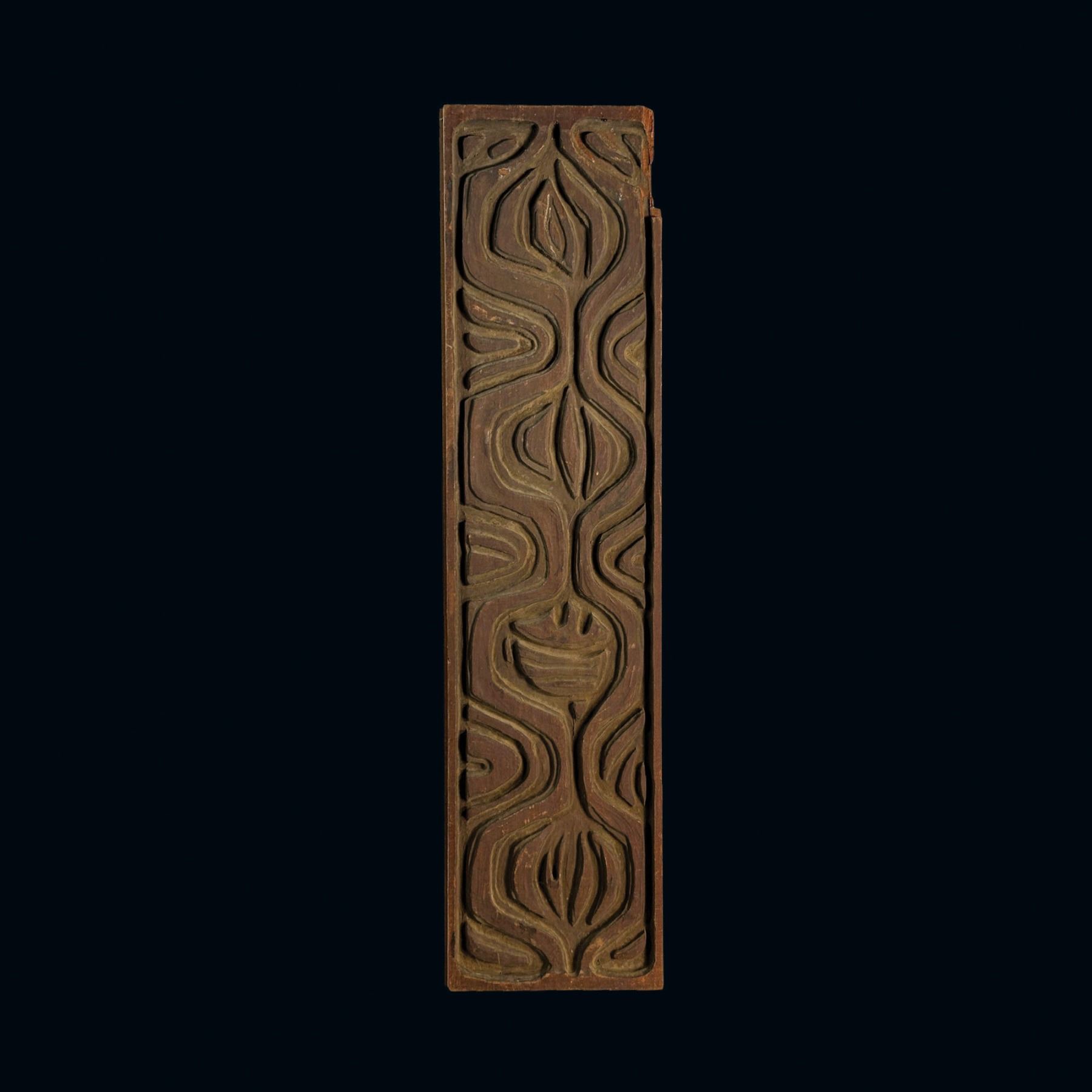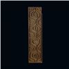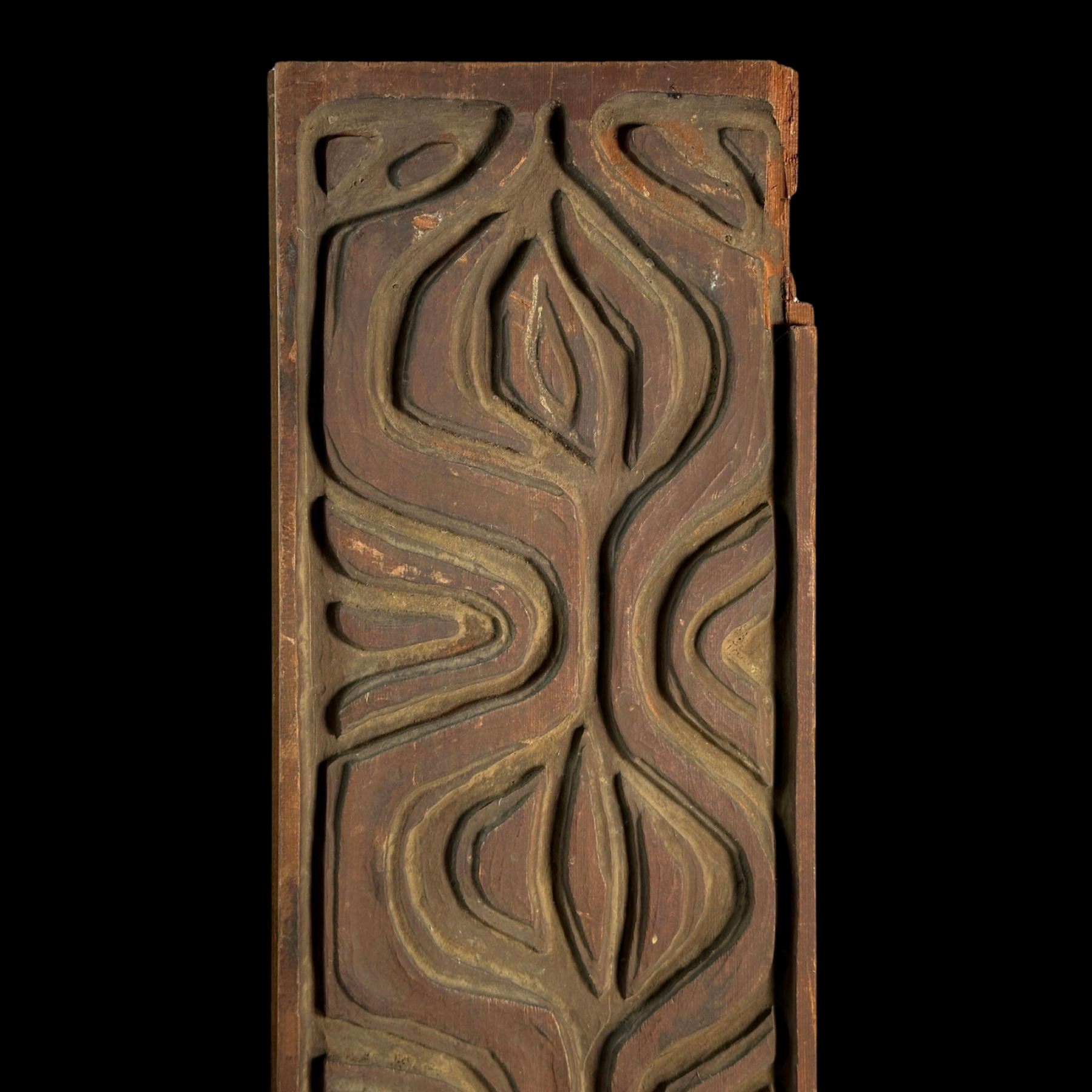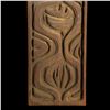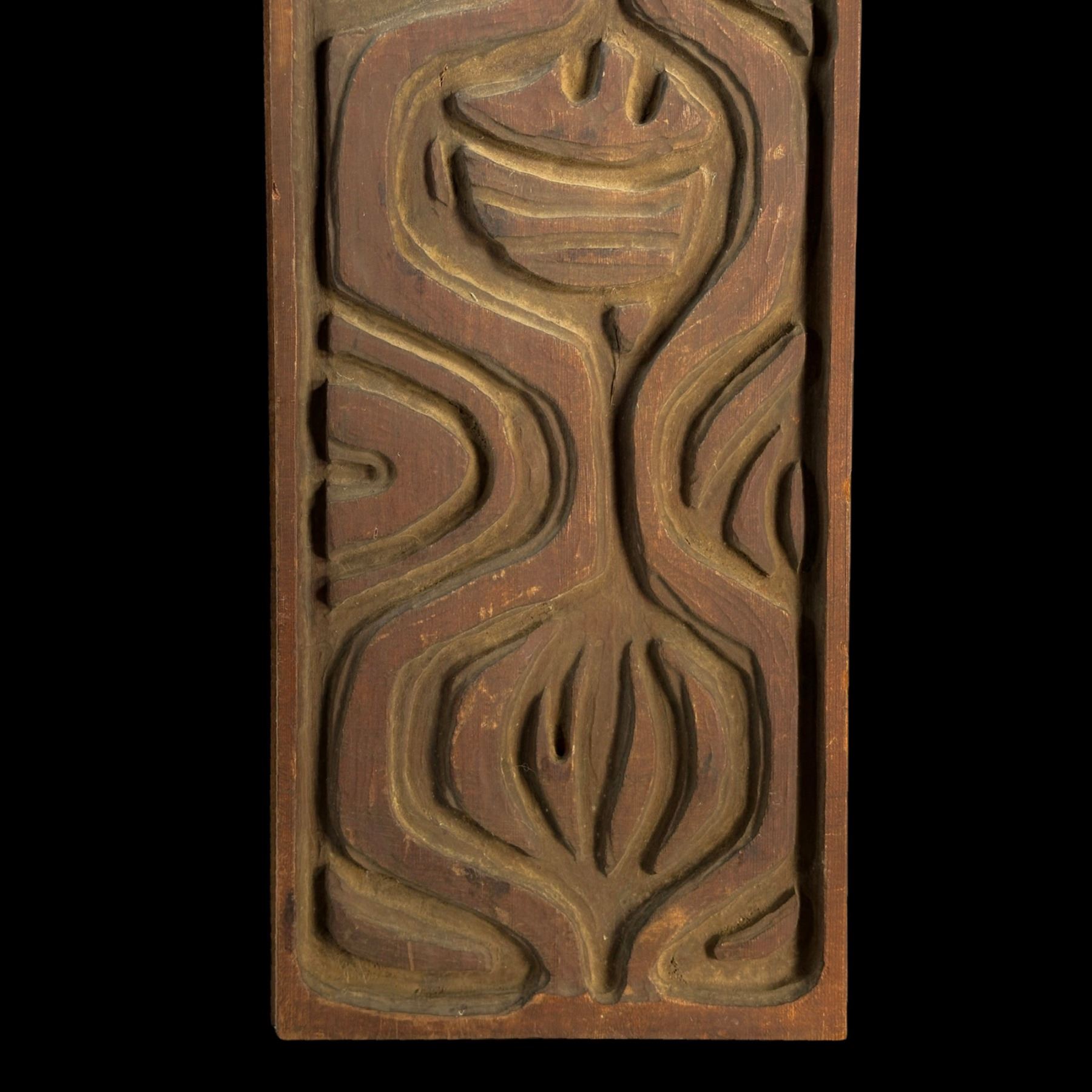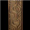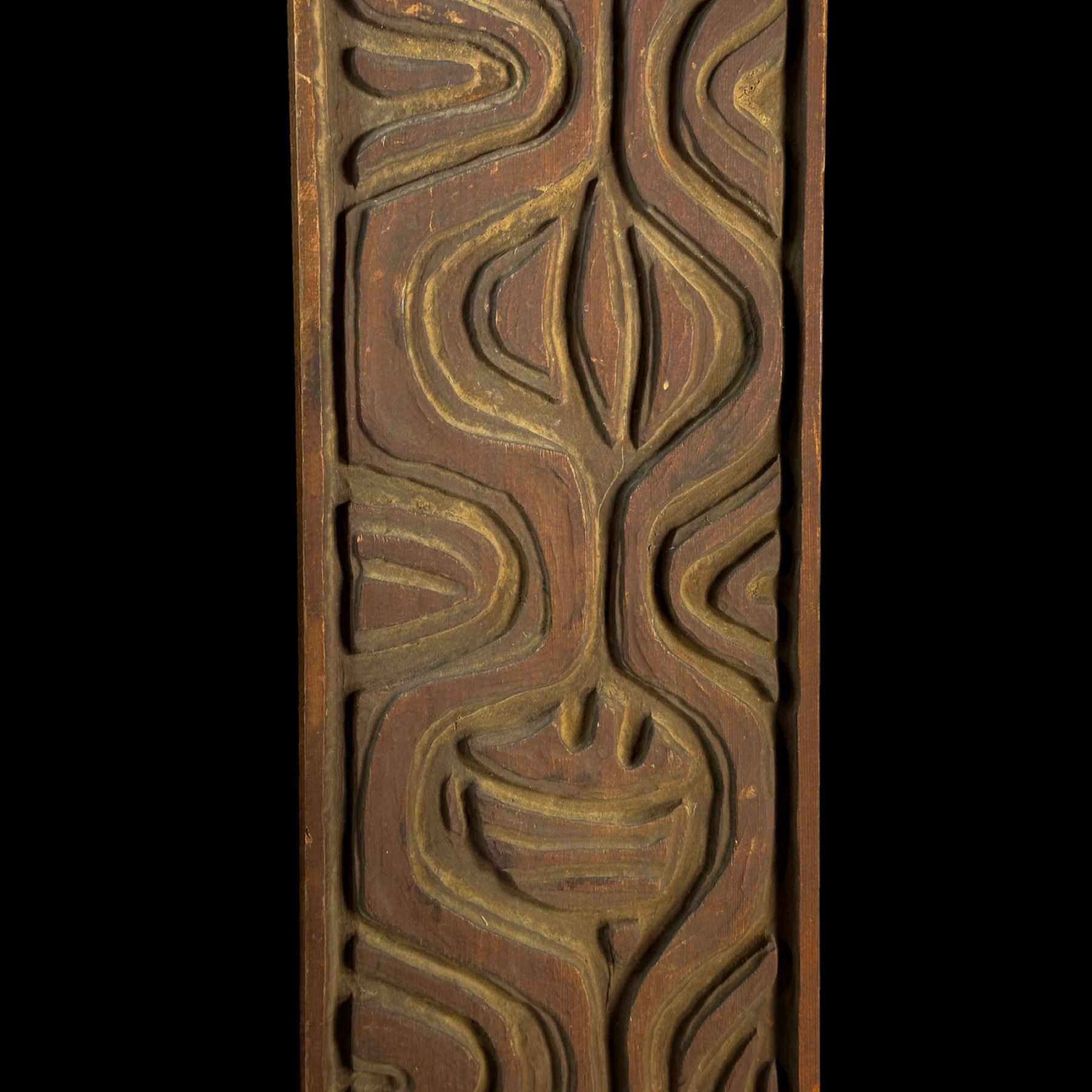 (1960s) Gorgeous primitive-moderne panel carving. These were produced in numbers for commercial jobs across the country. Stamped "Copyright Panelcarve" it is possible this was produced by Cass Carving in Downtown Los Angeles, a competitor to Oceanic Arts. VG+ with a side piece of trim missing. See photos. 35.75"x9.25".