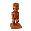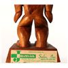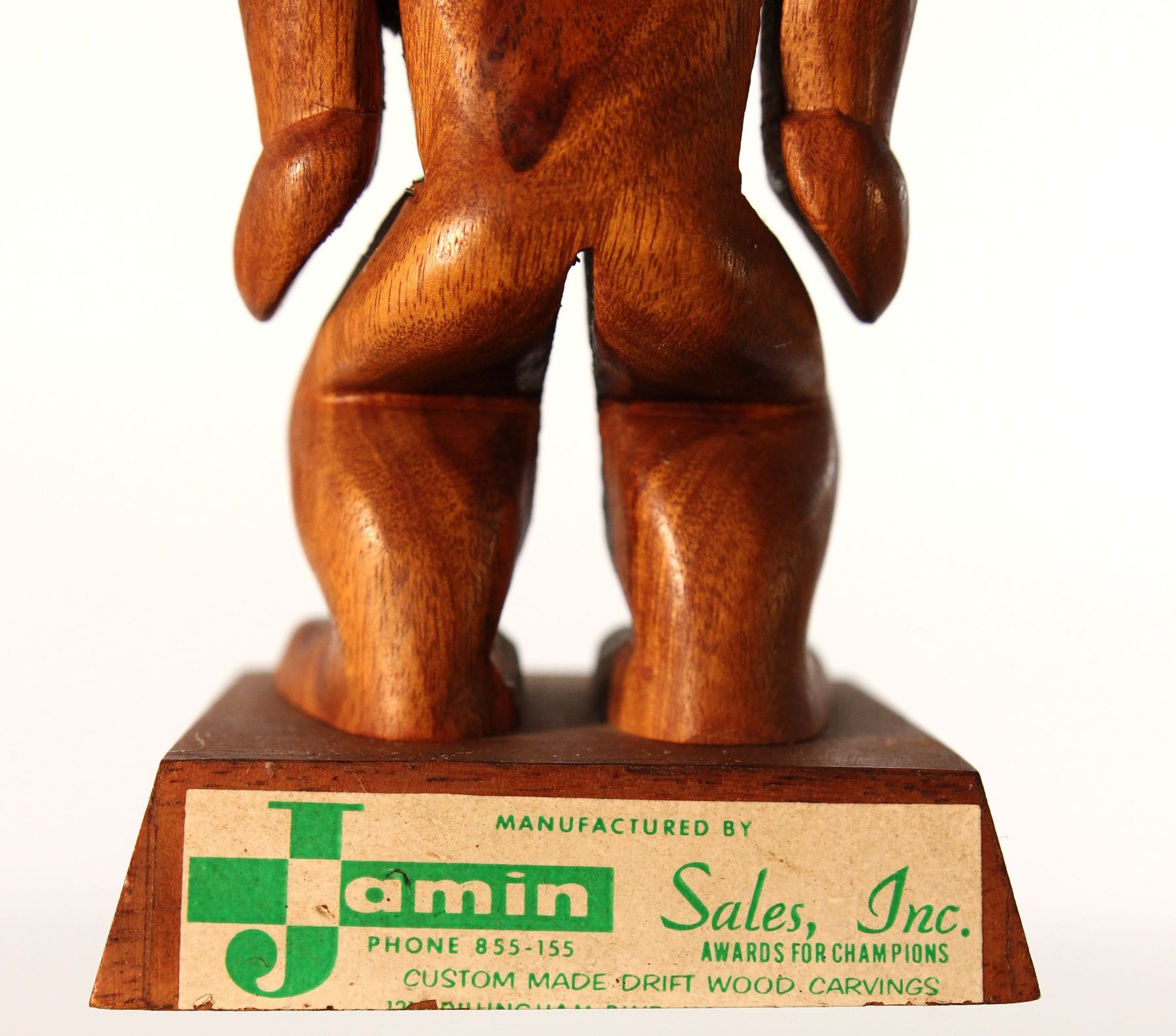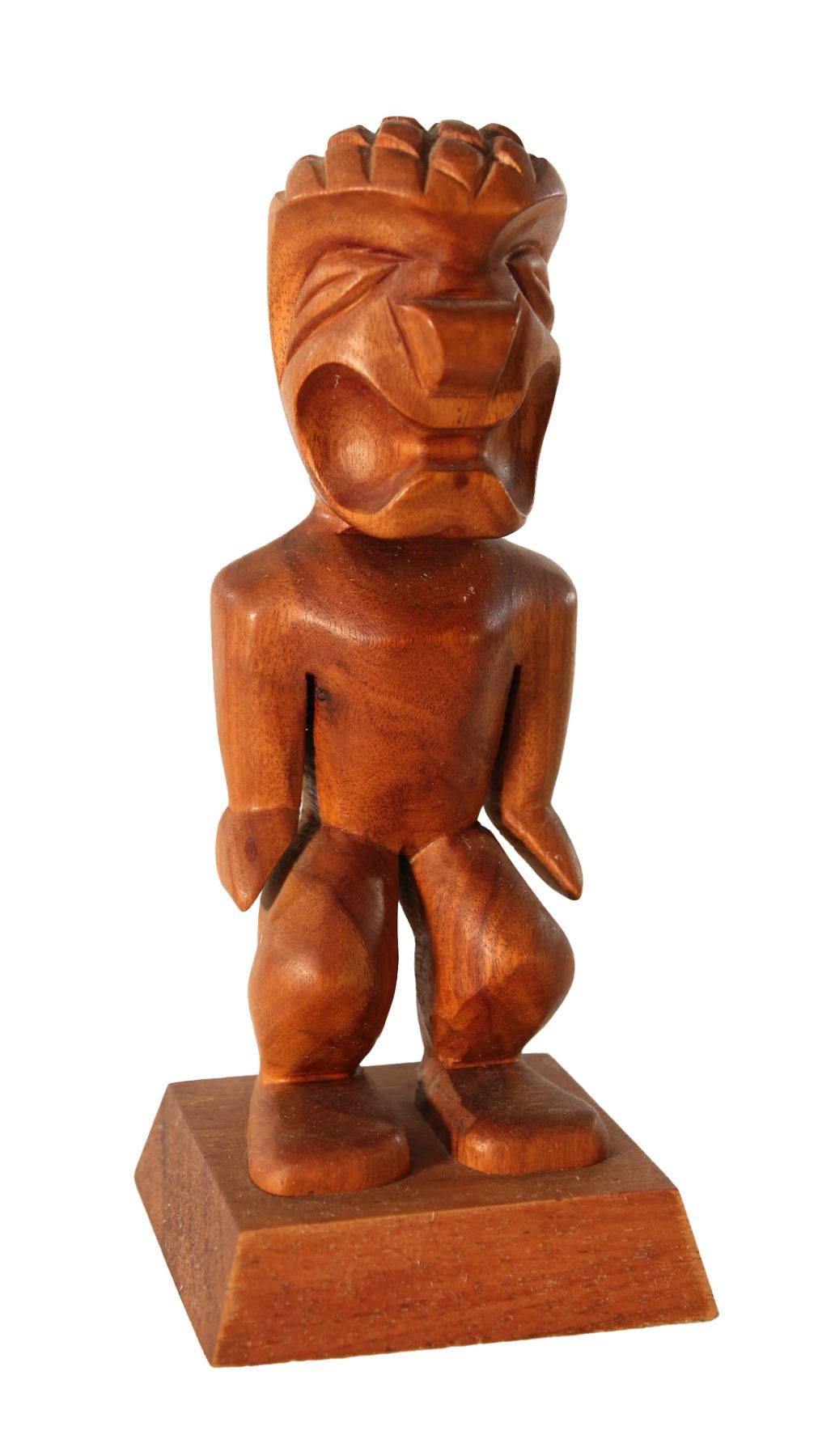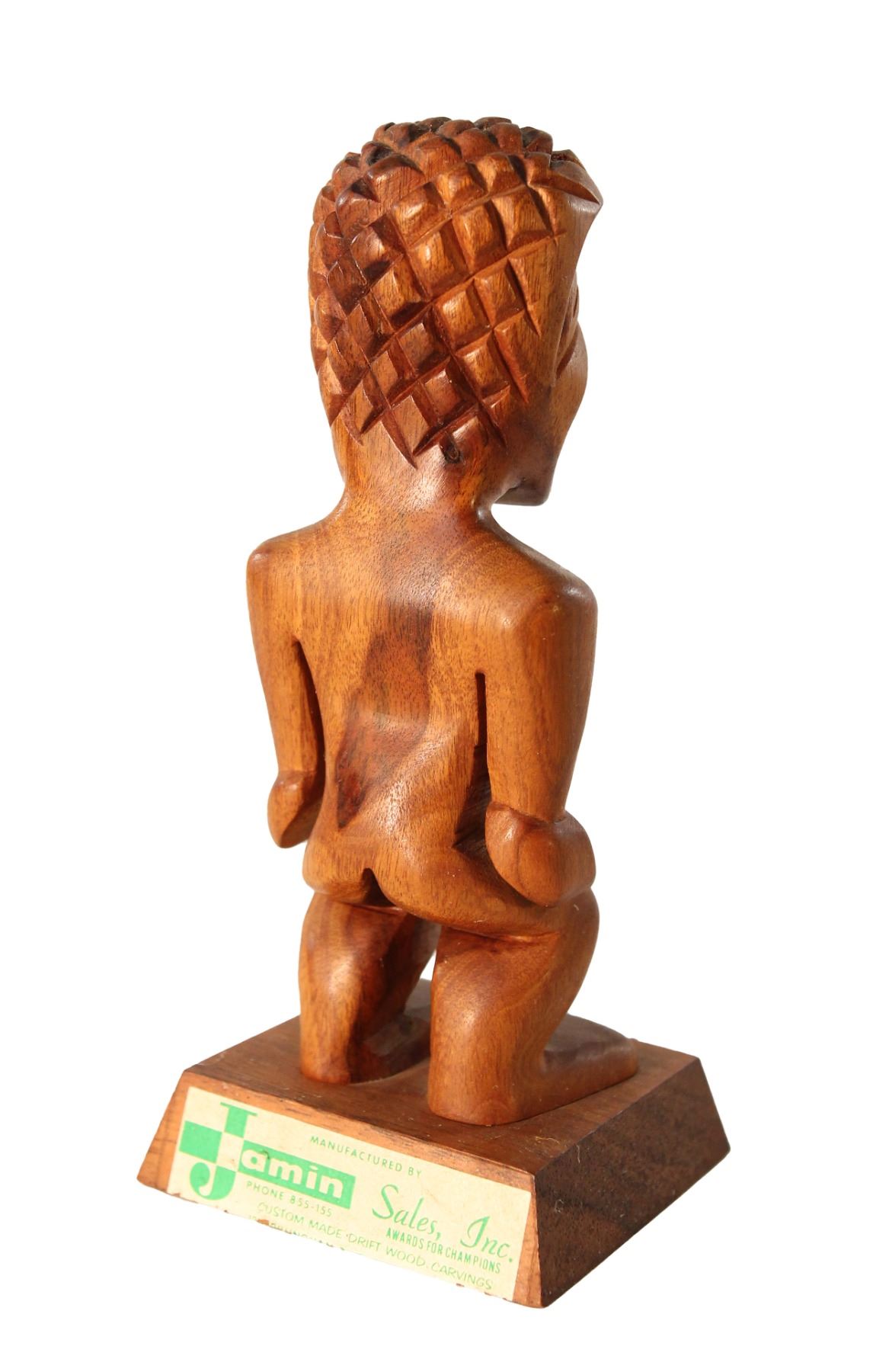 (1960s) The pineapple was a welcome symbol of good fortune and fellowship. This stylized representation of a Pele Tiki figure features a carved pineapple headdress atop a wonderfully crafted face. Created as a promotional sales sample of the work of Jamin Sales, Inc, a manufacturer of Polynesian styled wood carvings for awards and trophies. Solid koa wood figure on square wood base. Includes manufacturer's label. 8"x3.5"x3.25". VG+.