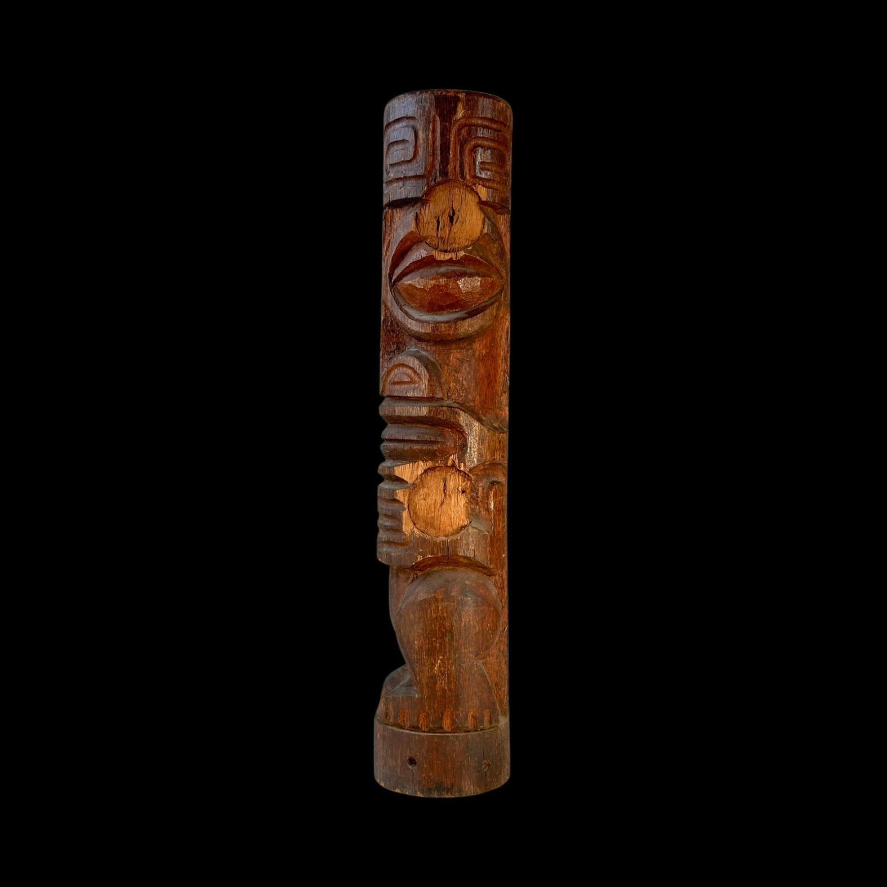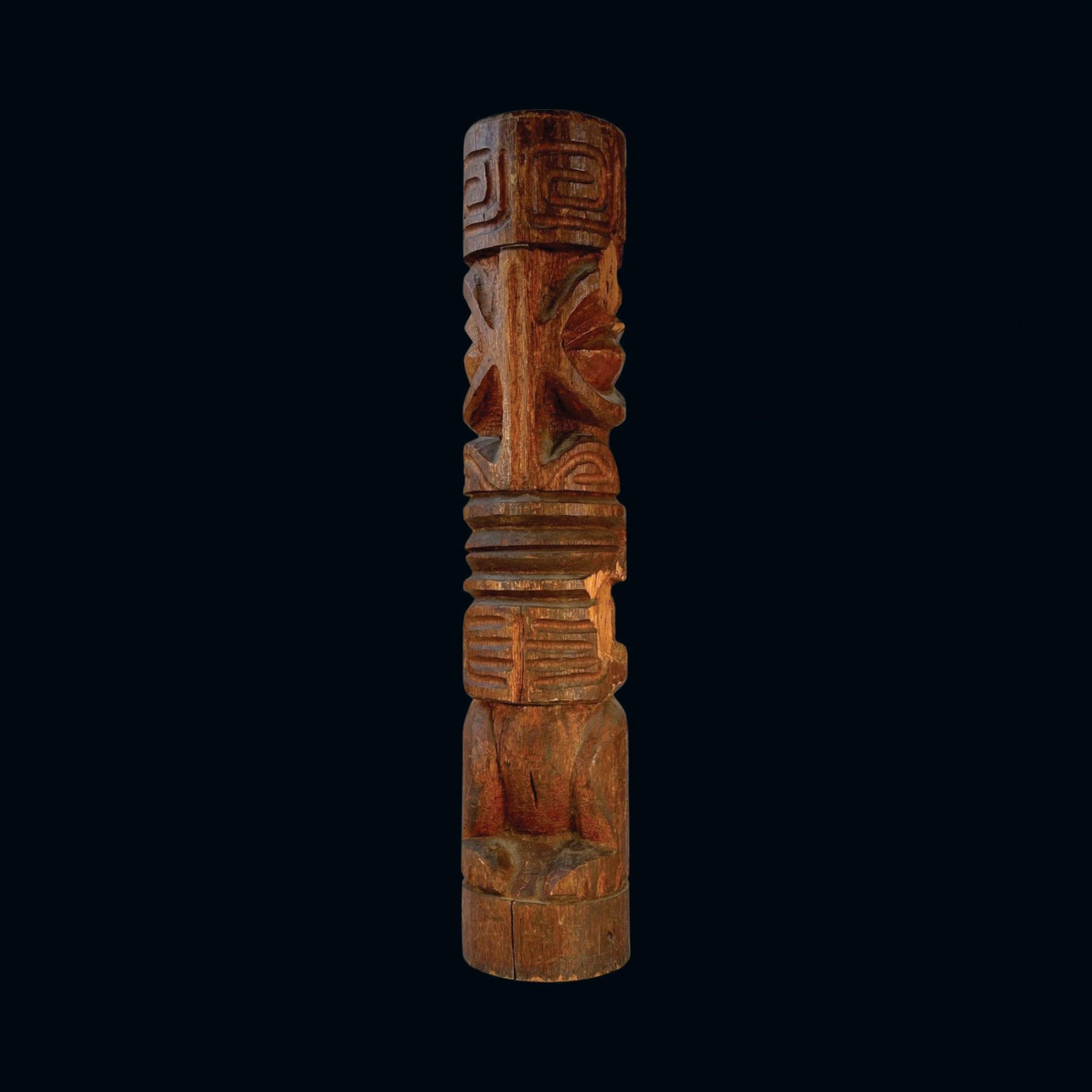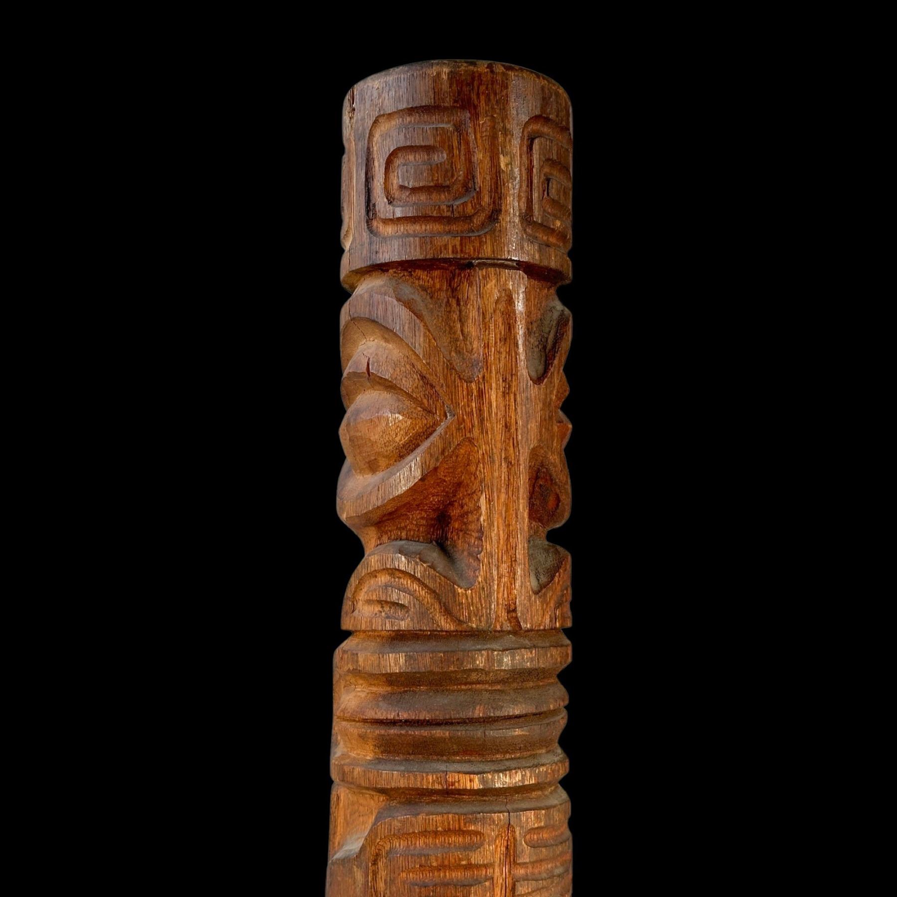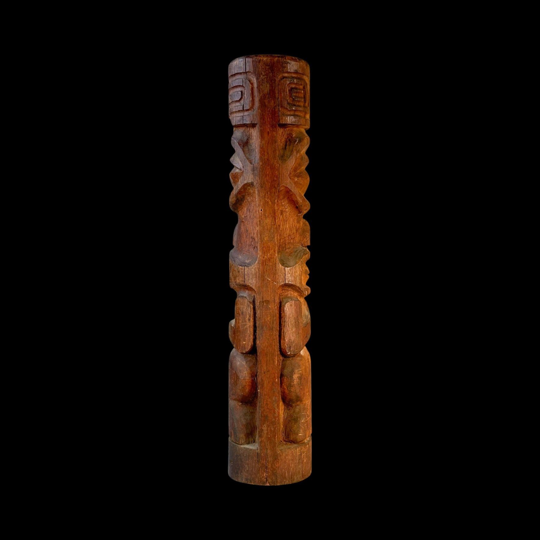 (1950s) A terrific Tahitian post carving salvaged from The Polynesian Room in Boston. There are railing attachment holes in four places: two above and two below from installation. Otherwise, VG+ with typical wear. Nice patina. 6.25"dia x 31.5".