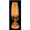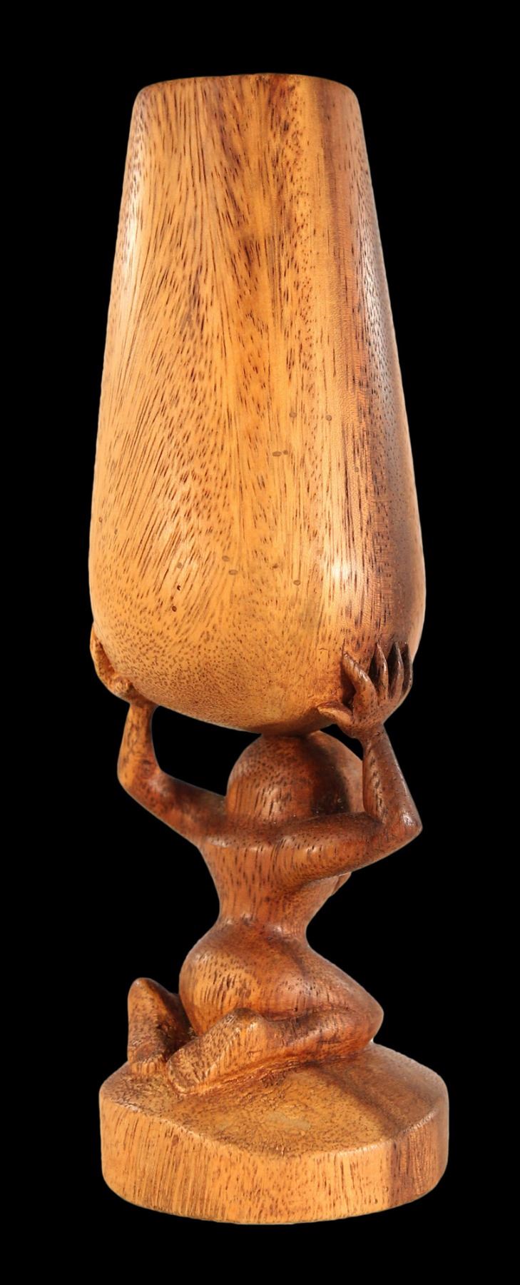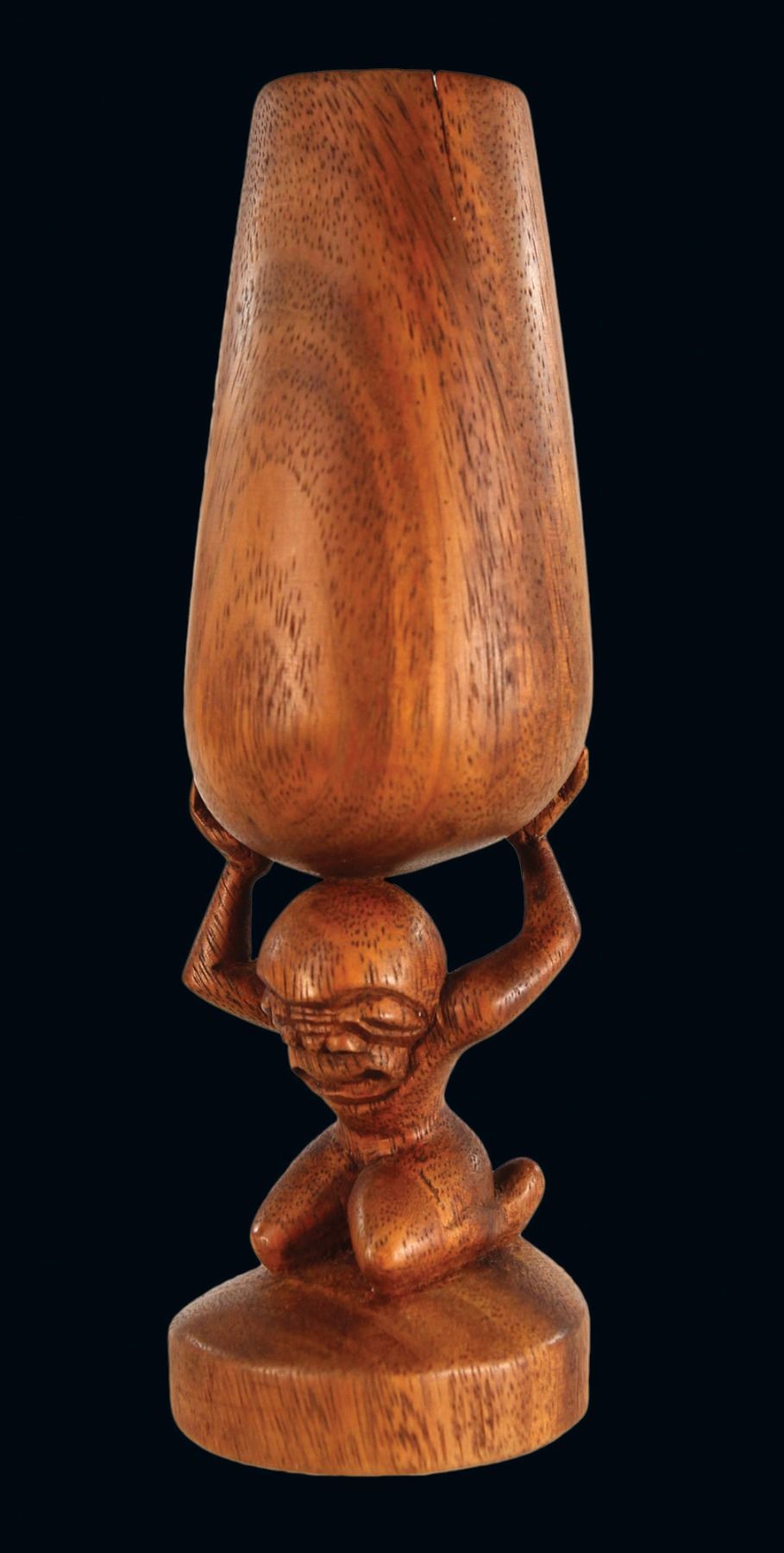 (2004). Atlas held the world, Maui held the sky. Just as the Hawaiian legend, the Maui Tiki figure holds a goblet. Unique piece features a small bodied, kneeling figure holding a goblet twice his size above his head. Hand carved wood on base. Truly beautiful carving as well as unique. Signed by "Rocky Vargas". VG+. 9.5"x3".