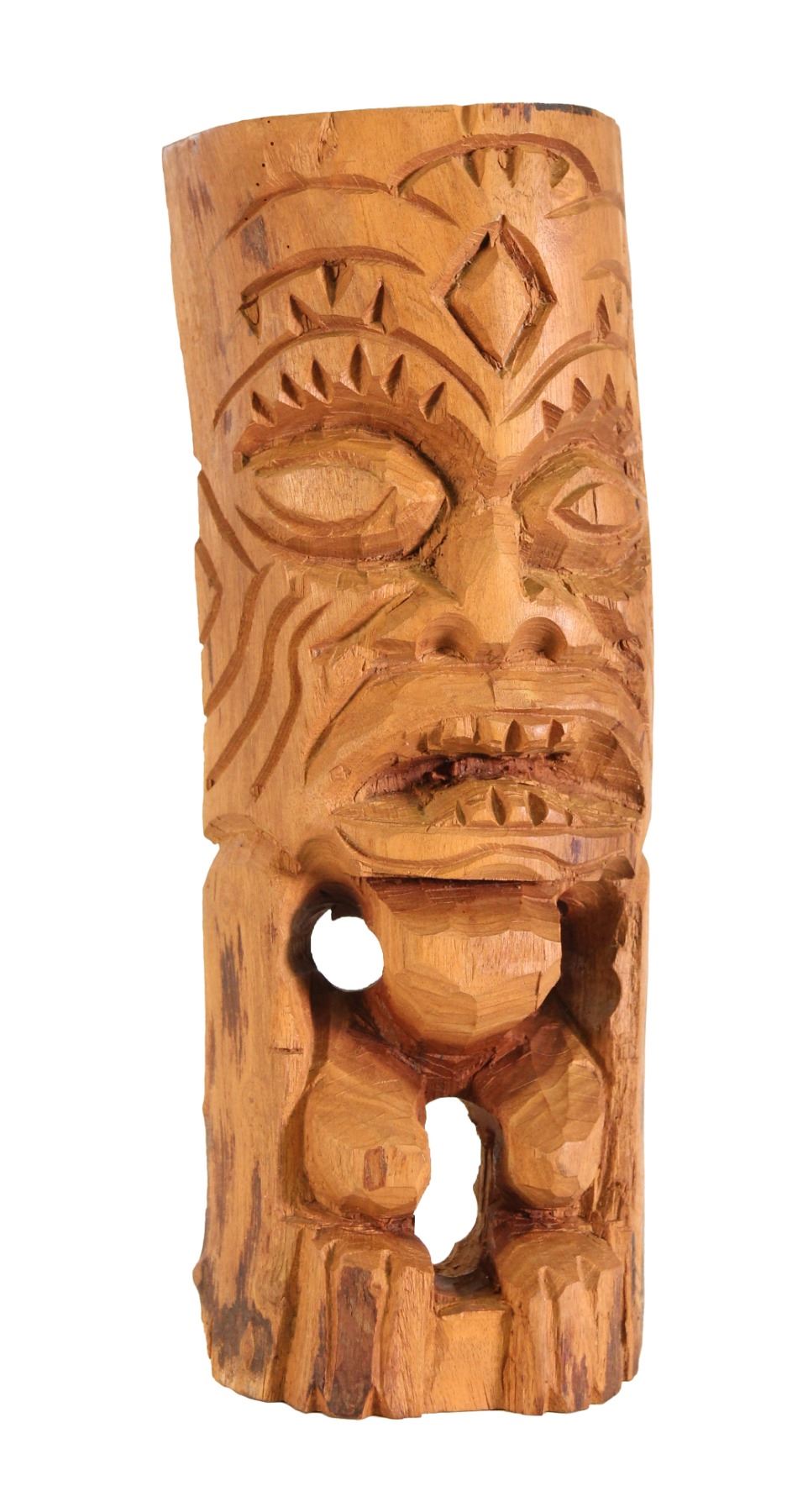 (1996) Jerry Maui was a prolific Tiki carver on, no surprise, Maui! He maintained a cult following for his Tiki art and this is a prime example. Jerry passed away recently. Deeply carved details with an Asian influence. Signed on the back: "Jerry Maui 96". 15.25"x5.5". VG+ with small mount holes on the back.
