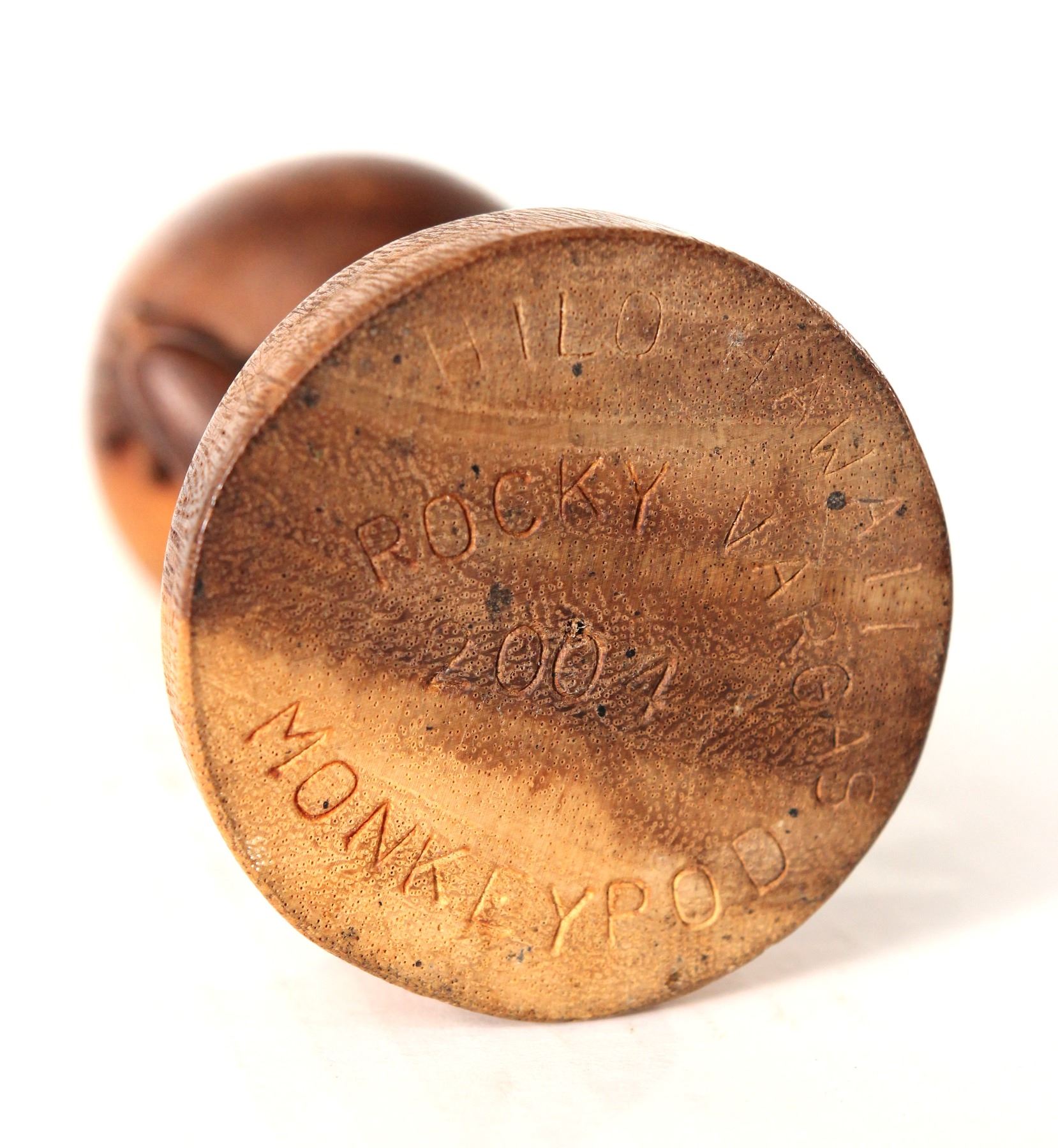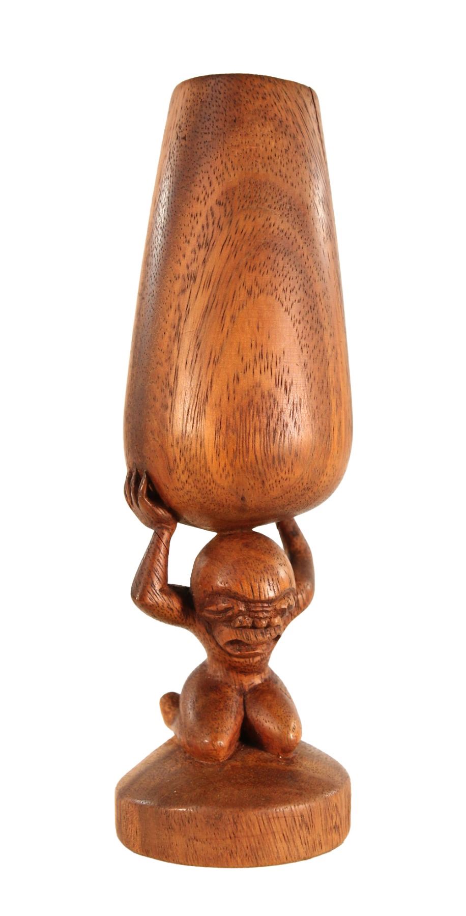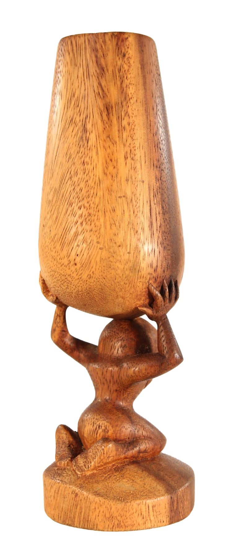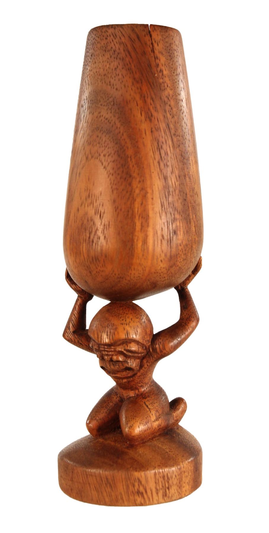 (2004). Atlas held the world, Maui held the sky. Just as the Hawaiian legend, the Maui Tiki figure holds a goblet. Unique piece features a small bodied kneeling figure holding a goblet twice his size above his head. Hand carved wood on base. Truly beautiful carving as well as unique. Signed by "Rocky Vargas". 9.5"x3". VG+.
