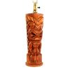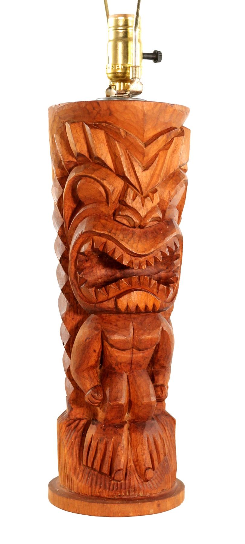 (1960s) Very possible AKRON stores carried this product, supplied by the prisoner/carvers of kaulani State Correctional Facility on the Big Island of Kona. Hawaiian Tiki Kanaloa is represented in this wooden table lamp. Fully functional with electric cord, lamp shade hoop and bamboo finial. Solid wood base. No shade-choose your own! 27"x6". VG+.