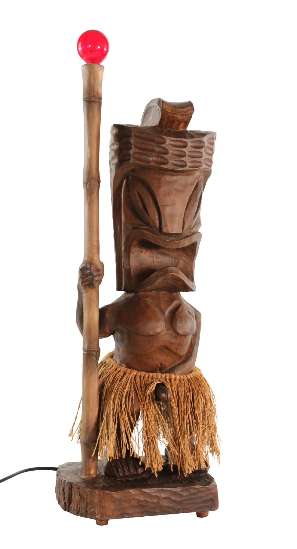 (2006). "Hold my ...spear"? This whimsical, hand carved Tiki table lamp by Geckoz features a red bulb atop the spear and full raffia grass skirt which answers the question, "Where did the waters of the ocean come from?" Solid wood with bulb fully functional. 21"x7.5"x5.25". VG+.