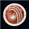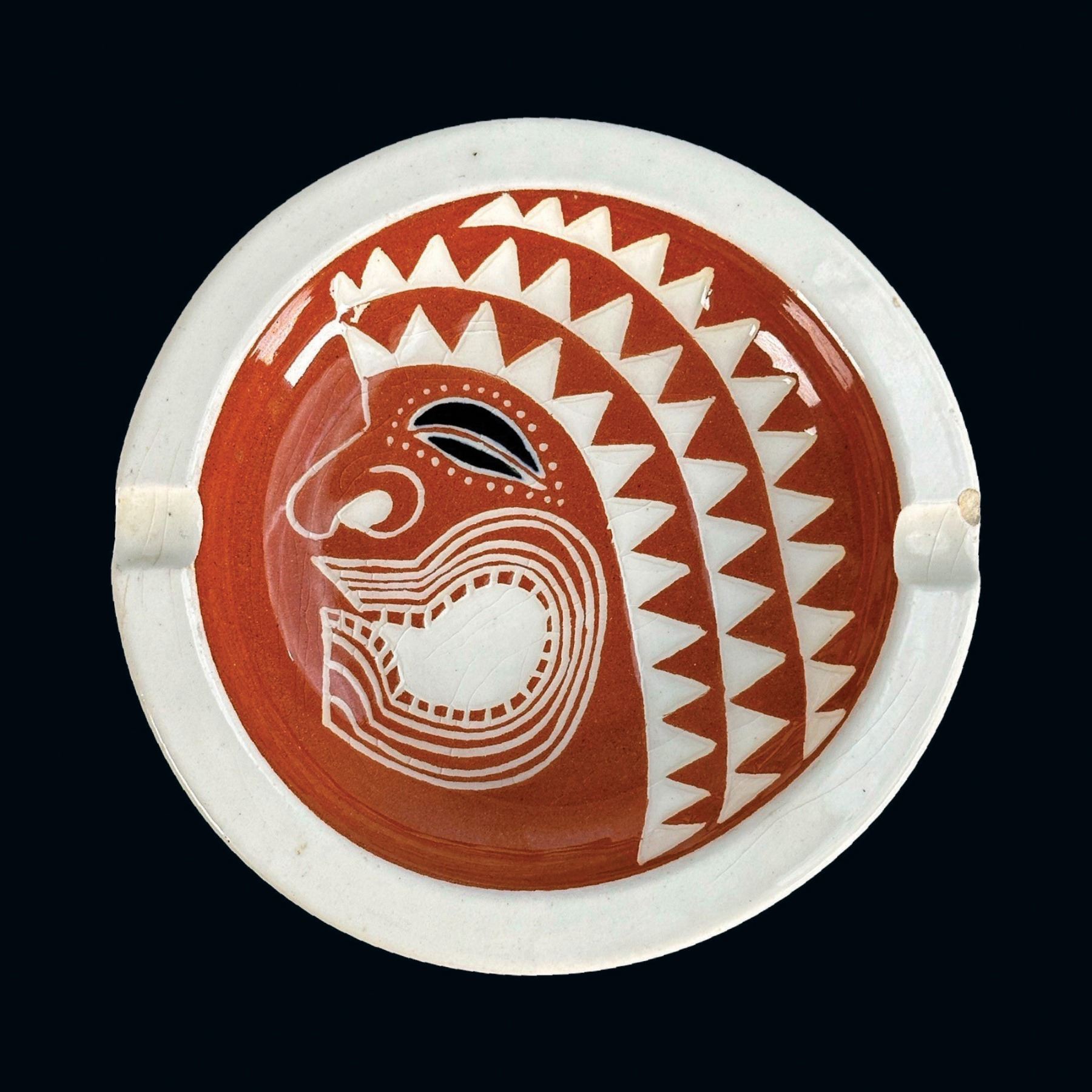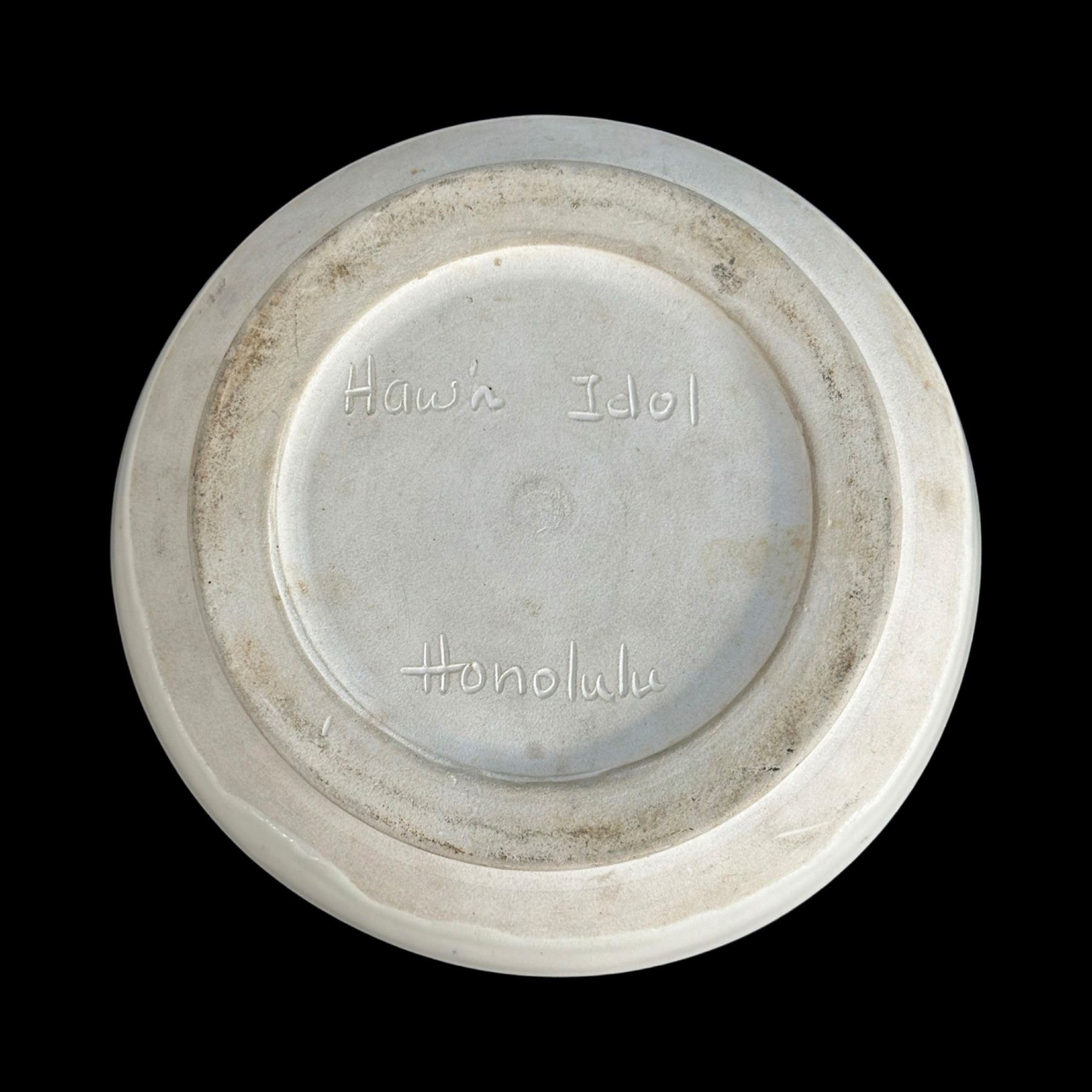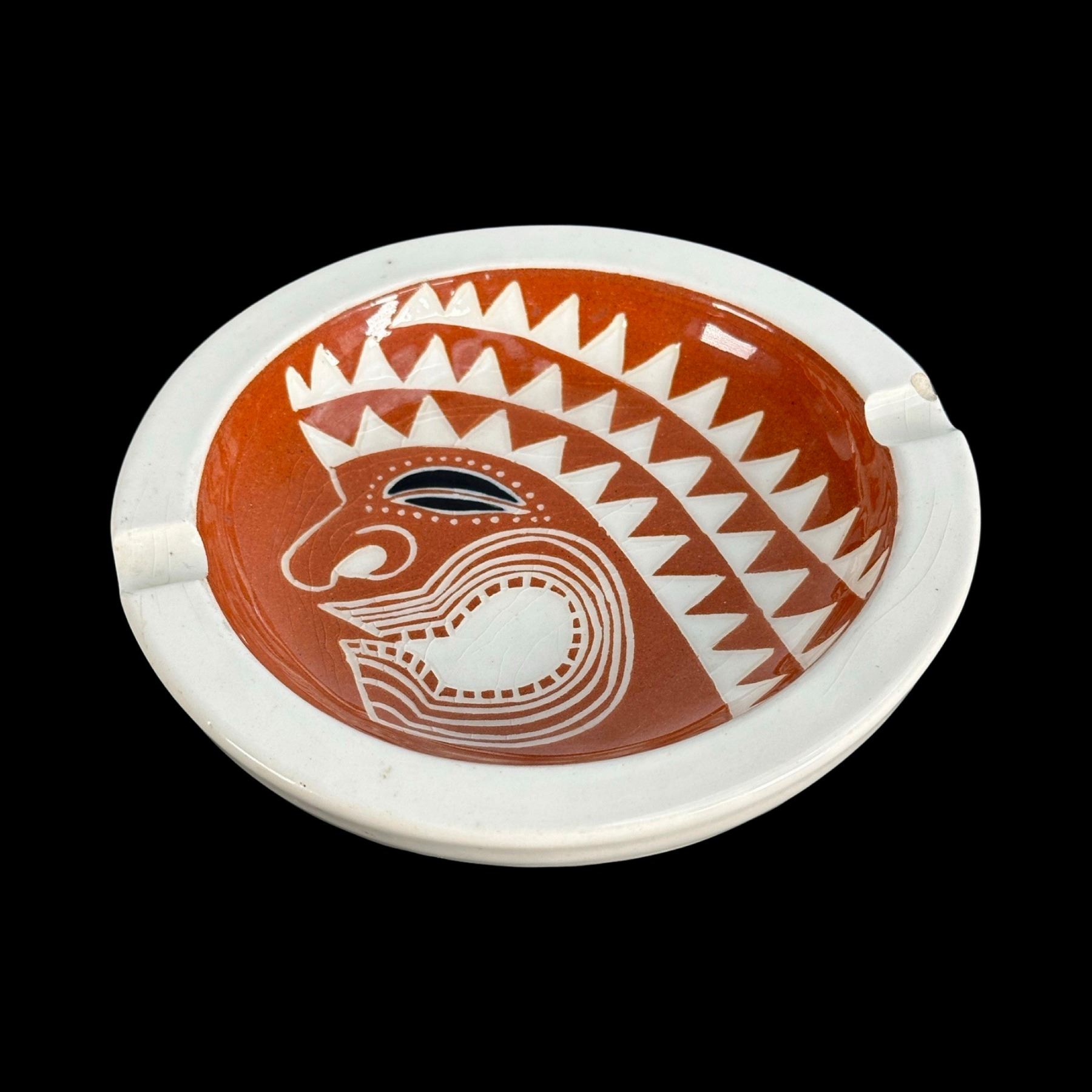 (1950s)* A second by the same manufacturer of a stylized Hawaiian KU war god as a graphic ashtray. VG+ with light crazing and a small glaze chip on the right cigarette rest indentation. 6"dia x 1.5".