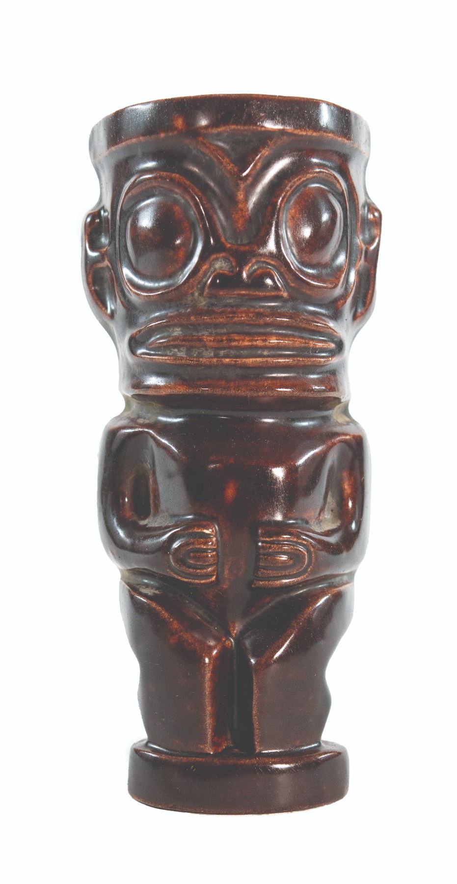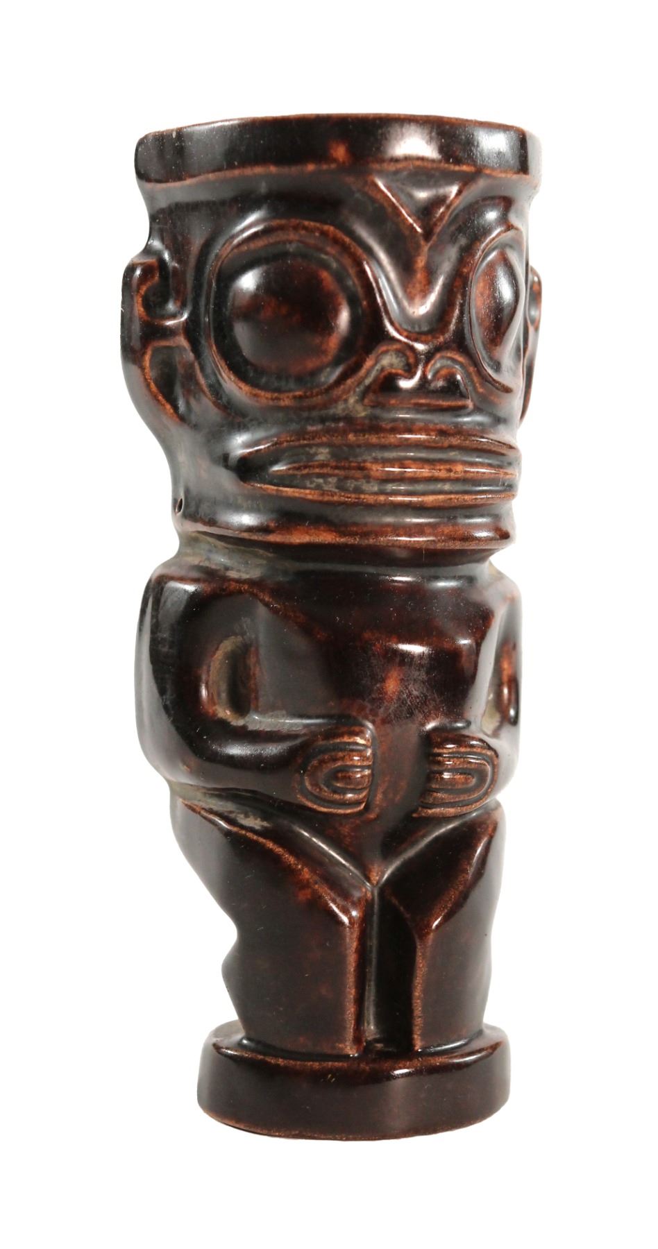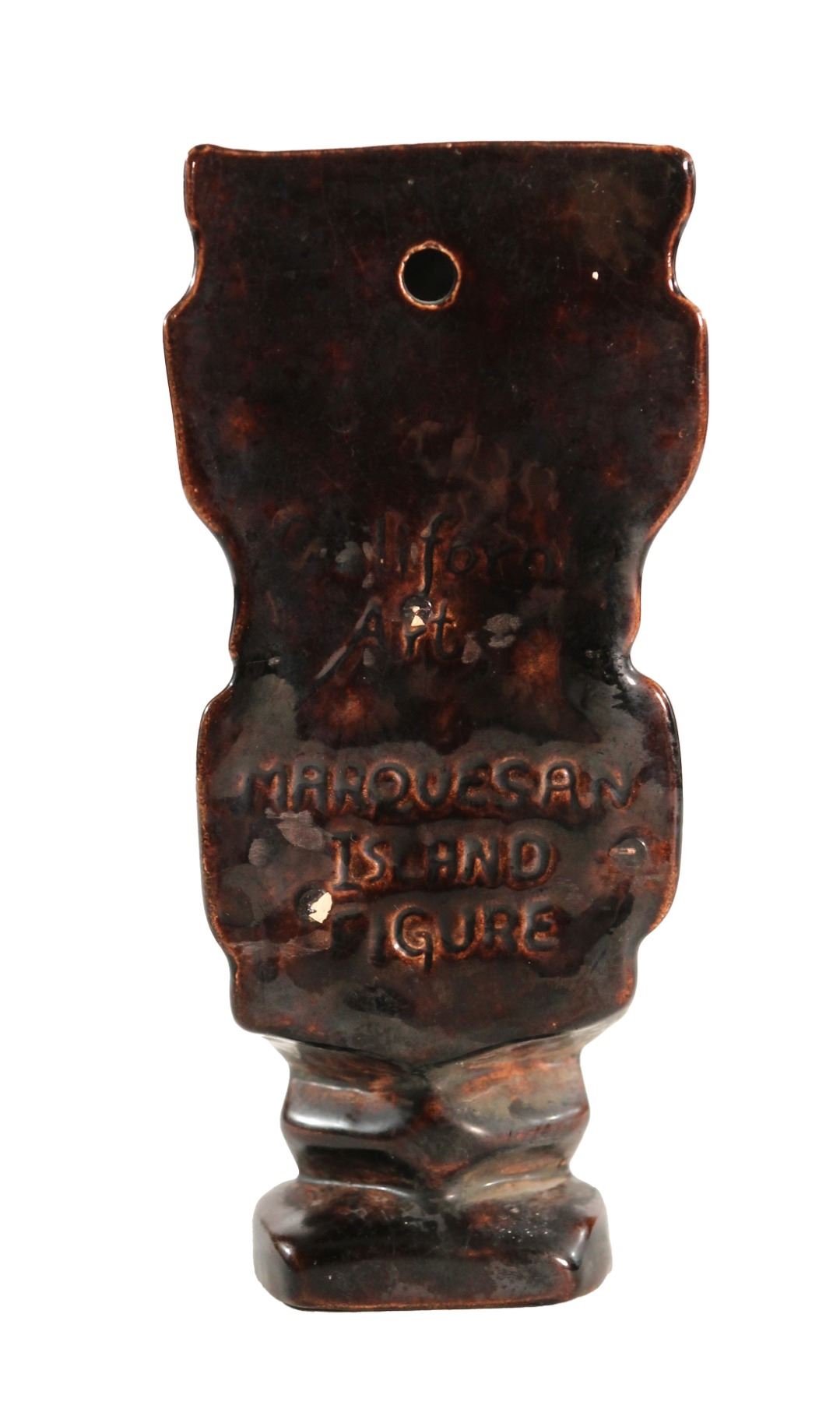 (1970s) The French Polynesian Marquesan Island were noted for their very unique style. This is very apparent in this ceramic wall pocket figure based on Marquesan tattoo style Tiki. It has a gloss finish with exceptional detail. Ceramic with dark glaze. 7.5"x3.5". VG+.