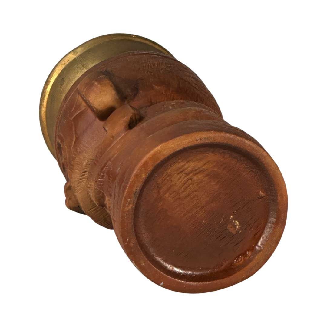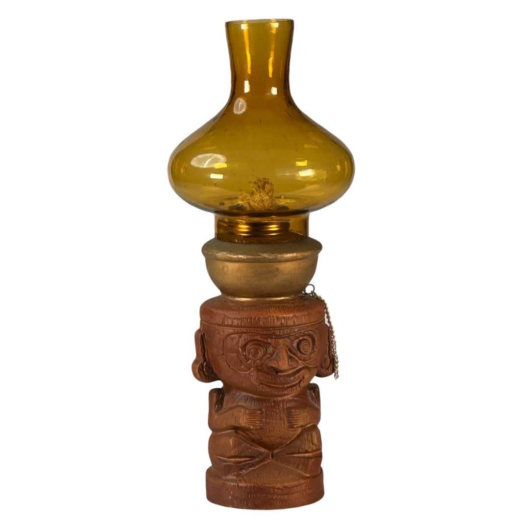 (1960s) A novel figural Tiki oil table lamp with reservoir and wick. 6.5"x3". VG+.