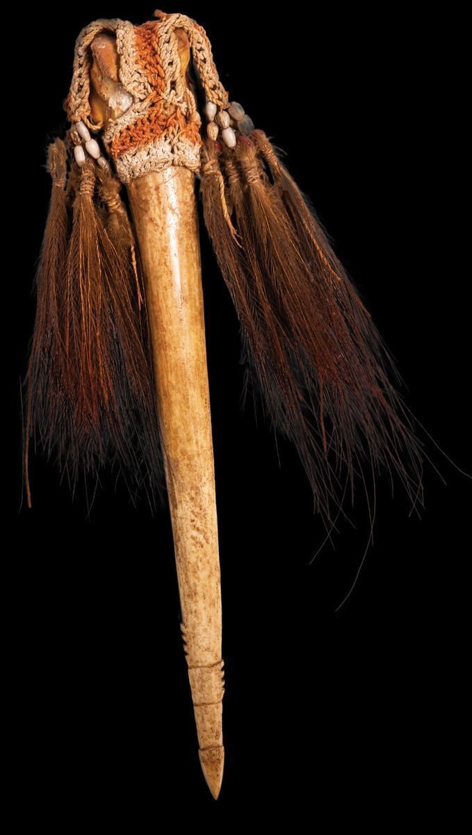 (Mid-Century) A classic Asmat ceremonial Bone Dagger with cassowary feathers, possibly human or cassowary bone woven fiber and job’s tear seeds.14"x5".VG+ with typical wear .