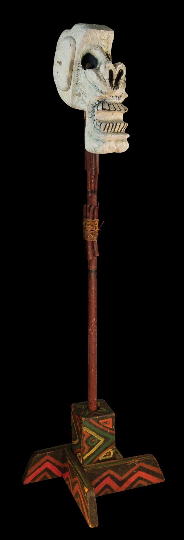 (1970s) Carved skull post with polychromed base. 74" tall - head 19"x7"x12". VG+ with typical wear.