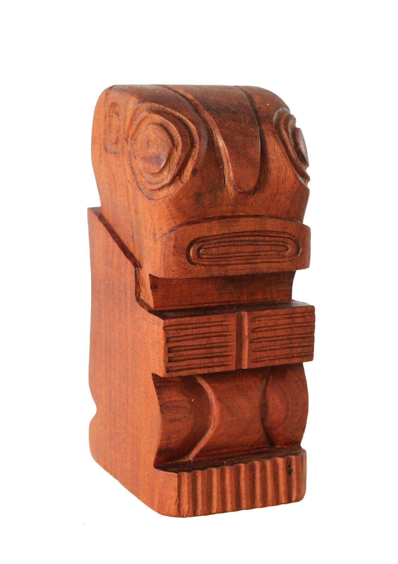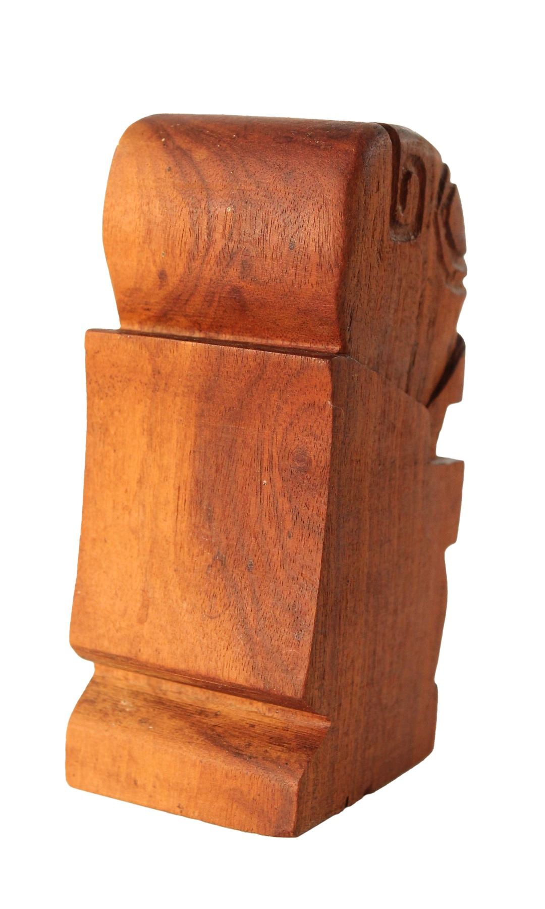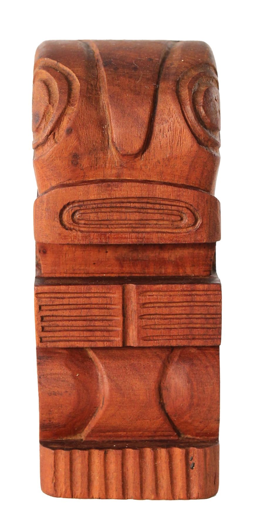 (1960s) Great things come in small packages with this Maori Tiki god.Huge, round eyes and carved circular arm patterns enhance the squared basic foundation of this figure. Solid wood. 6"x2.5"x3". VG+.