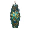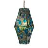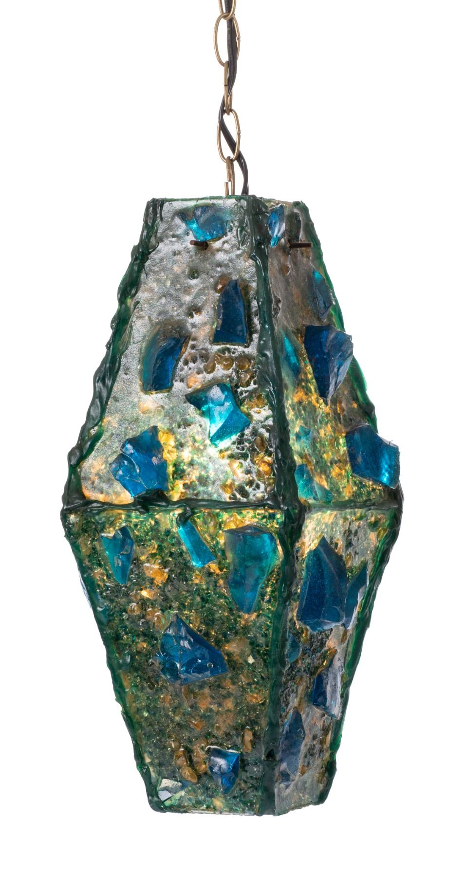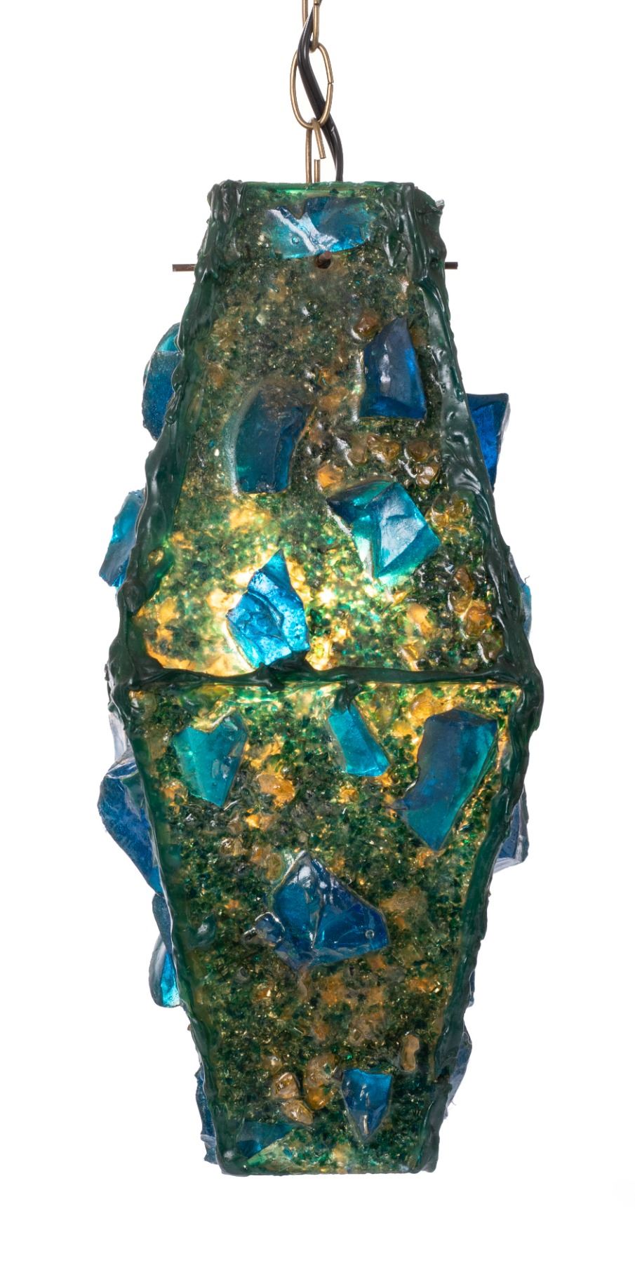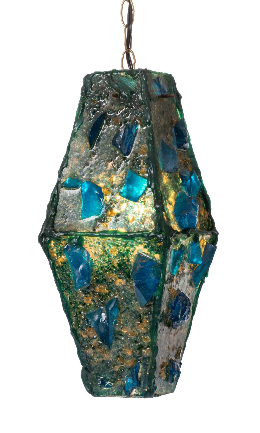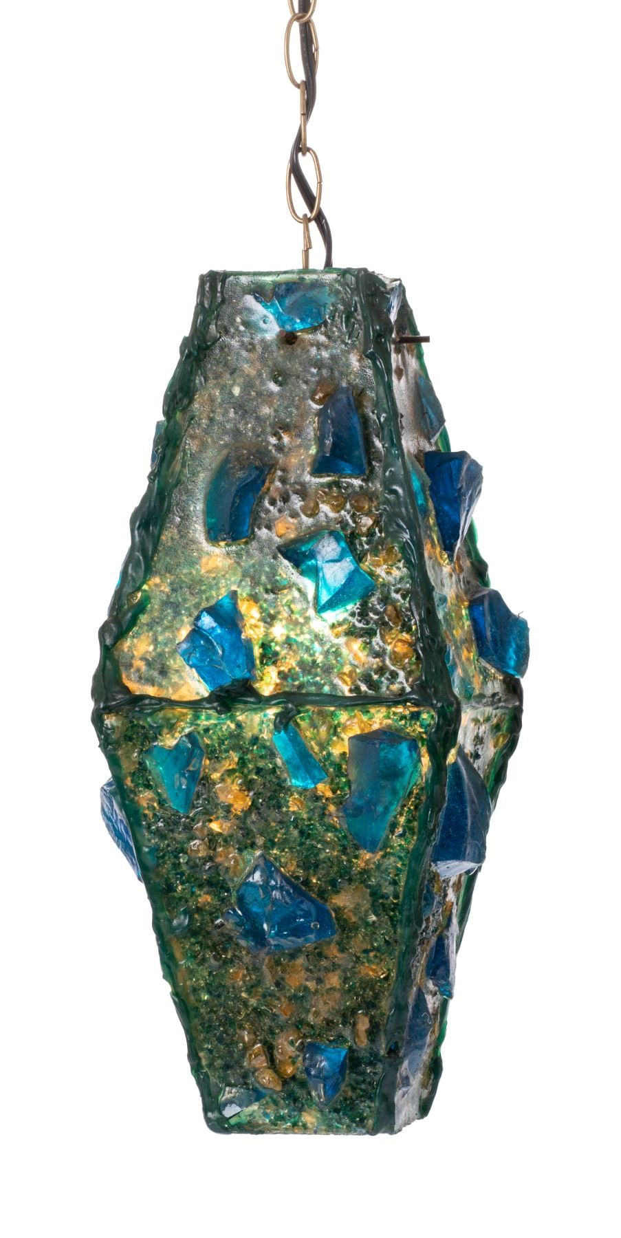(1960s) One of the more unusual shapes created of a hanging lamp. This trapezoid crafted lamp features large chunks of deep blue and green acrylic pieces which creates a deep sea ocean effect when illuminated. Original hardware shows oxidation but is intact and was kept. Lamps have been checked and where necessary sockets and/or electrical cord and hanging chain is newly replaced.17.25"x7.5"x7.5". VG.