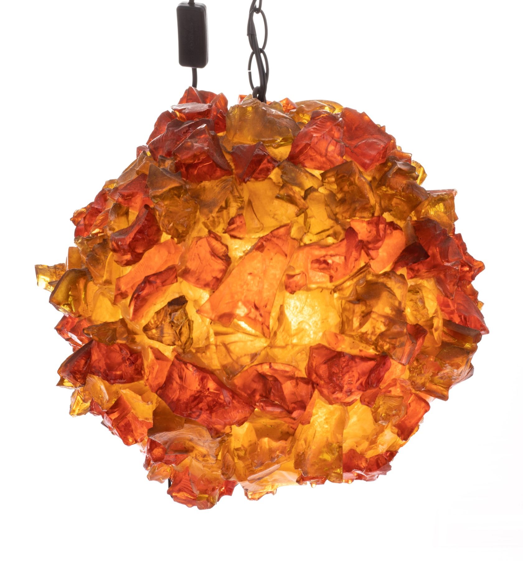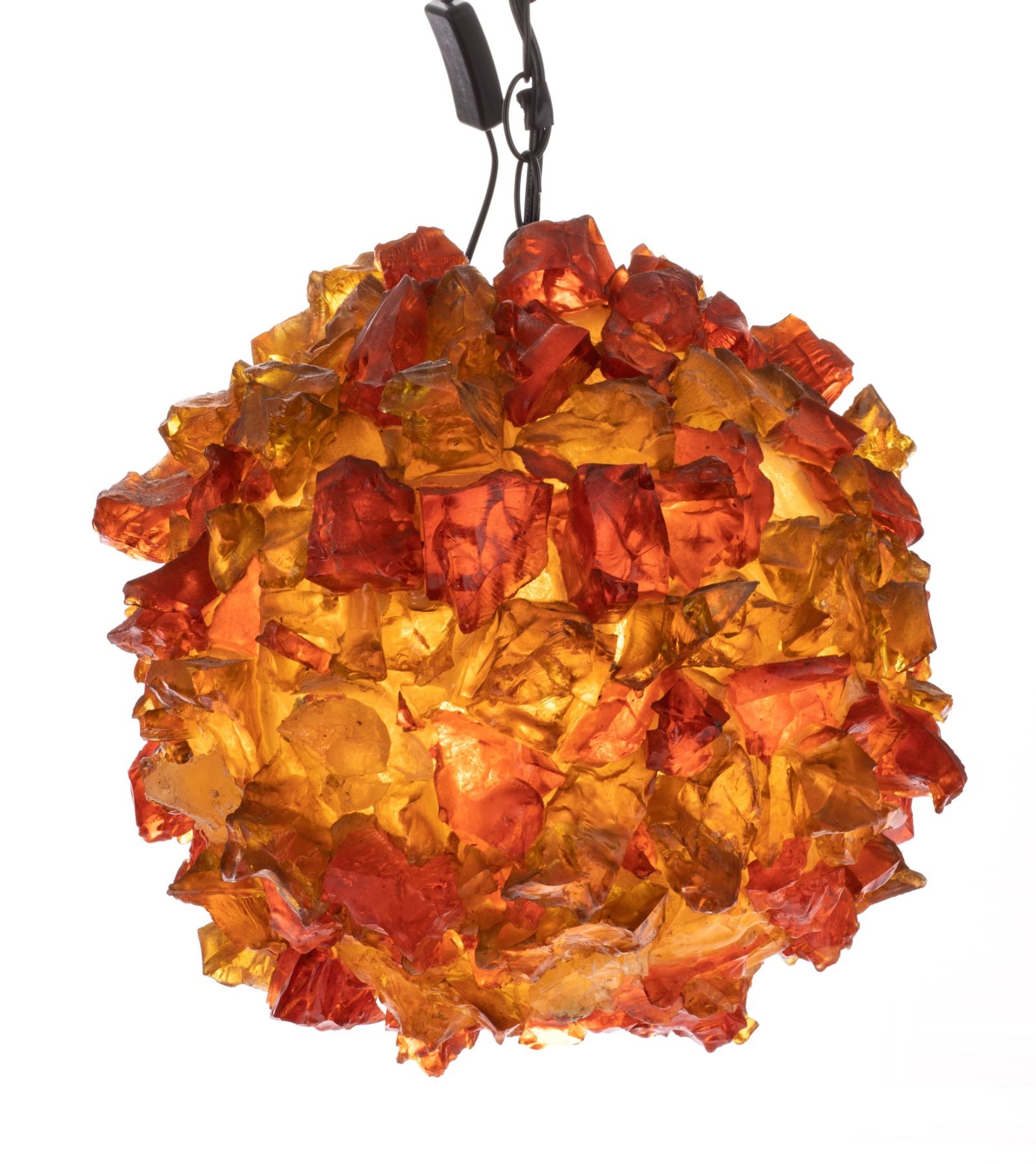 (1960s) Awesome acrylic hanging globe lamp features large red, orange,and yellow chunks to create a glowing fireball. Lamps have been checked and where necessary sockets and/or electrical cord and hanging chain is newly replaced. 16"x16". VG