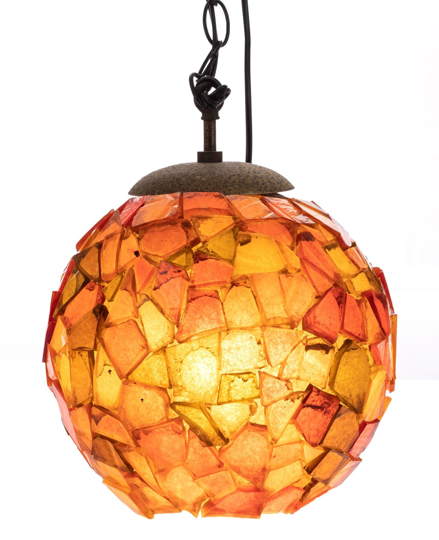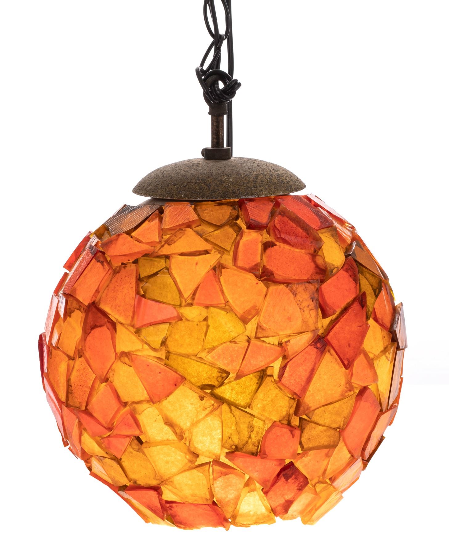 (1960s) Classic acrylic hanging globe lamp features large, layered red, orange, and yellow shards for a fiery glow. Lamps have been checked and where necessary sockets and/or electrical cord and hanging chain is newly replaced. 13"x11". VG