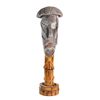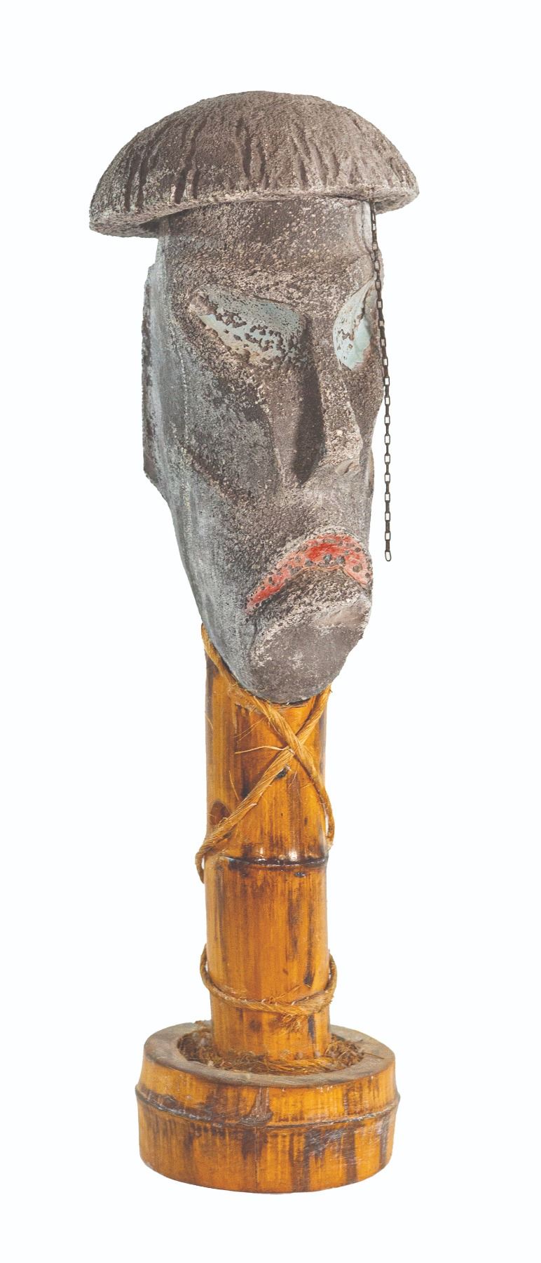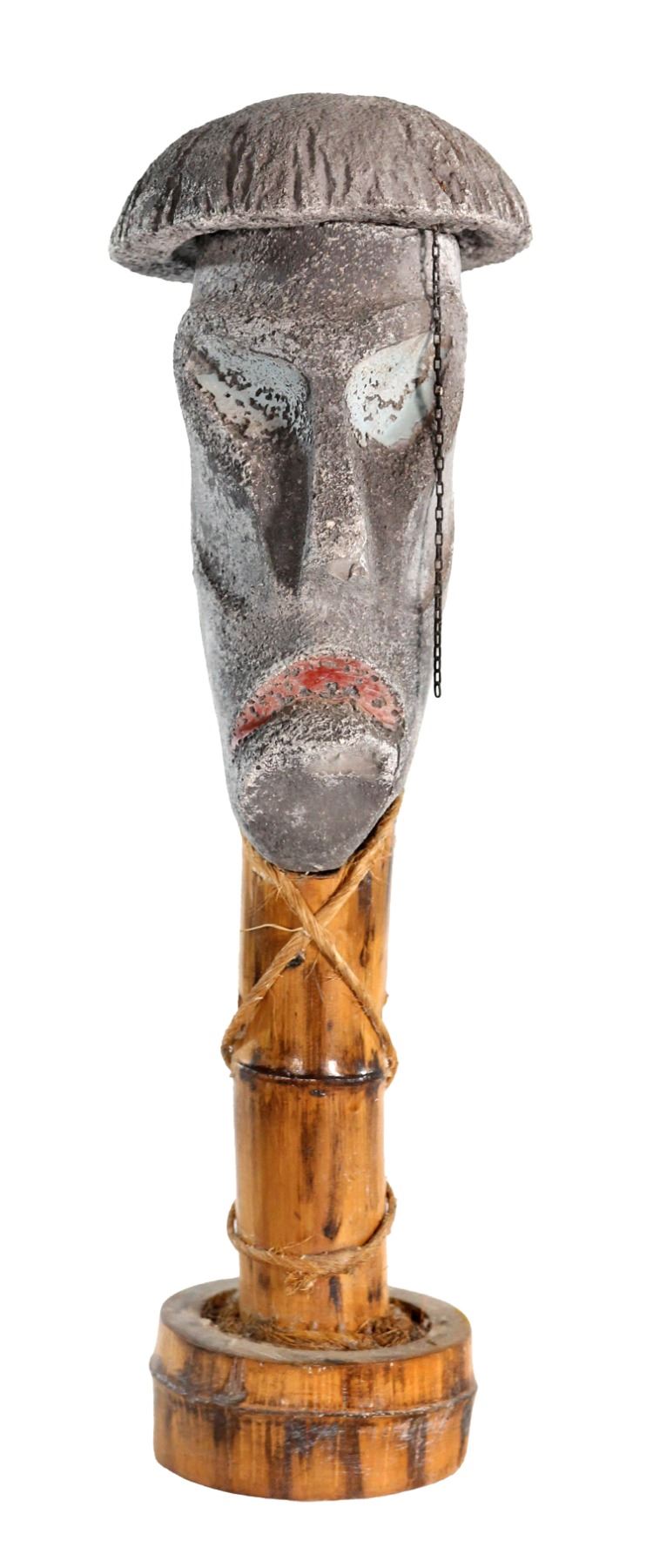 (1960s) Wonderfully original stone crafted Tiki torch features a stylized idol face atop a bamboo pole and base with twine rope wrappings and base nesting. Removable stone hat with attached chain. These were used at outdoor commercial venues such as luau grounds, hotel resorts, restaurants and bars. Very Polynesian Pop! 17"x4.5". VG+.