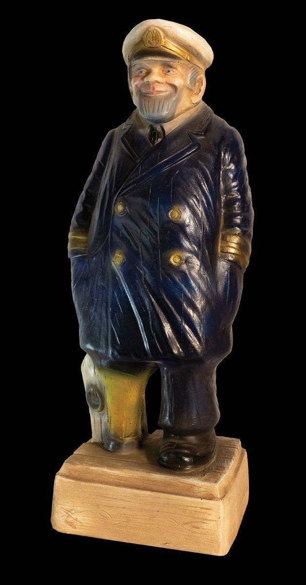 (1970s) Ye token peacoat-clad sea captain stautuette. Made of some type of resin or plastic composition. Over two feet tall...perfect bar size!25"x8.5"x7".VG+.