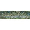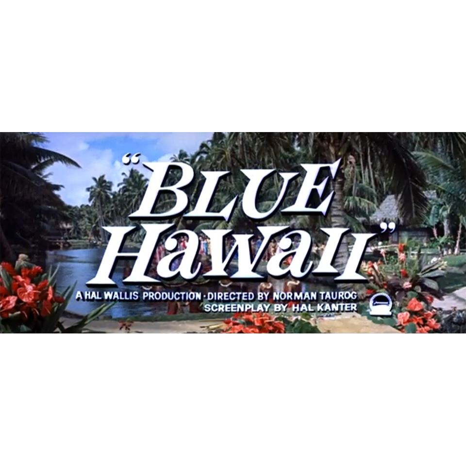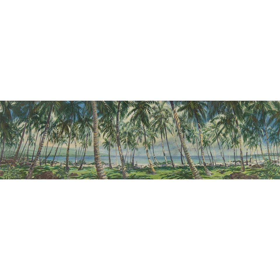 (1960) Here is an incredible piece of Hollywood and Rock and Roll history, not to mention Hawaiiana and Tiki! Here is an original Panavision storyboard concept for the opening credits of Elvis Presley's BLUE HAWAII feature film. Produced by Hal Wallis and Art directed by Hal Pereira, the film took advantage of the beauty of the natural islands as much as possible. In the opening sequence, upon Elvis' character, Chad Gates' return from the Army, he drives through Waikiki passing scenic areas as the credits roll. Here is a shot of a palm strewn beach area which matches a shot in the film. This art was sold many years ago with other artwork from the art department which could have come from the hand of Dave Constable or Robert Ayres whom both worked on the film yet are uncredited. See enclosed screen grabs. The art is gorgeous and comes in its original presentation pitch mat. The mat is in poor condition and the painting would benefit from new mat and framing. 35"x10". VG+ with minor tears and wear.