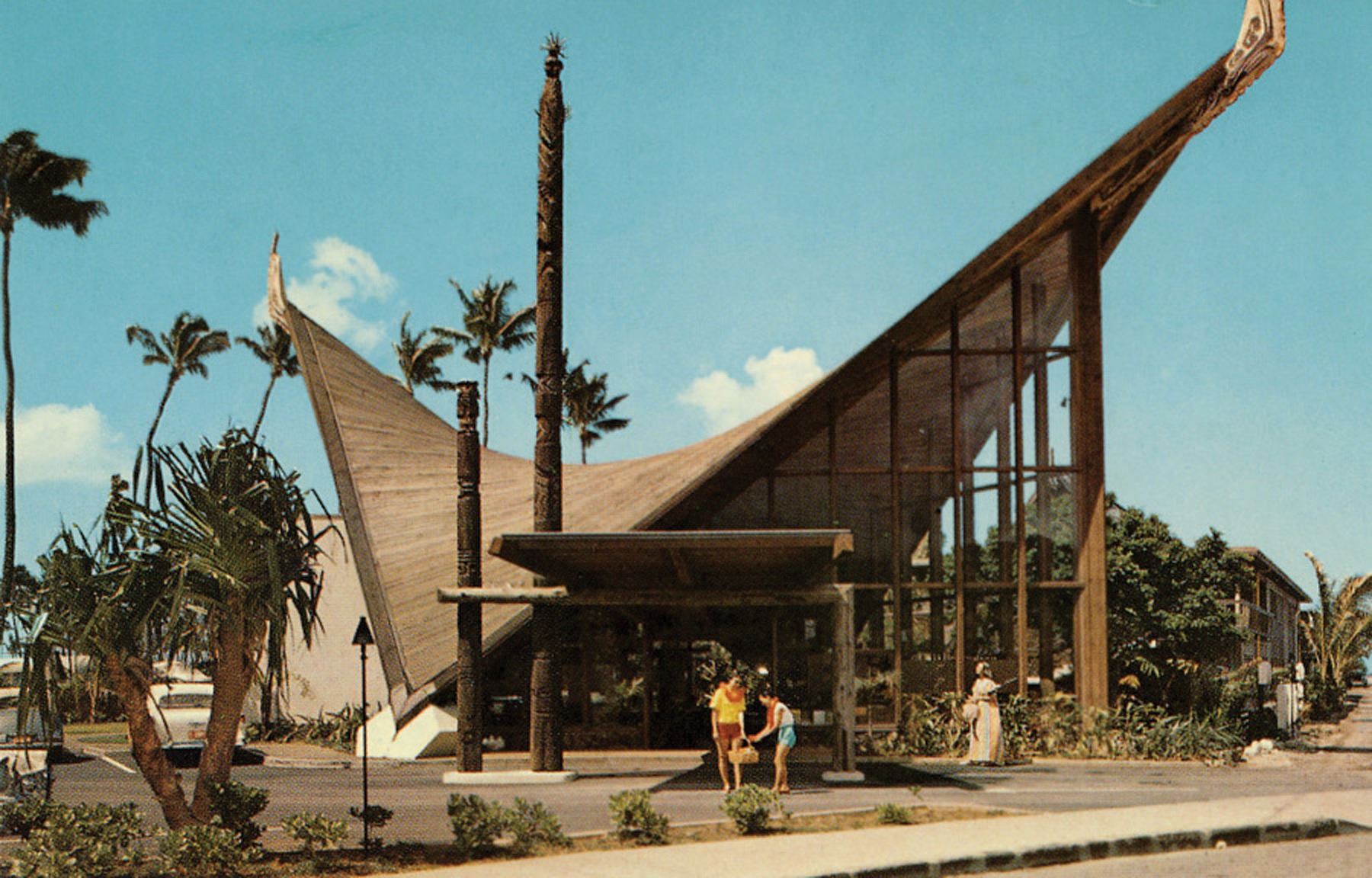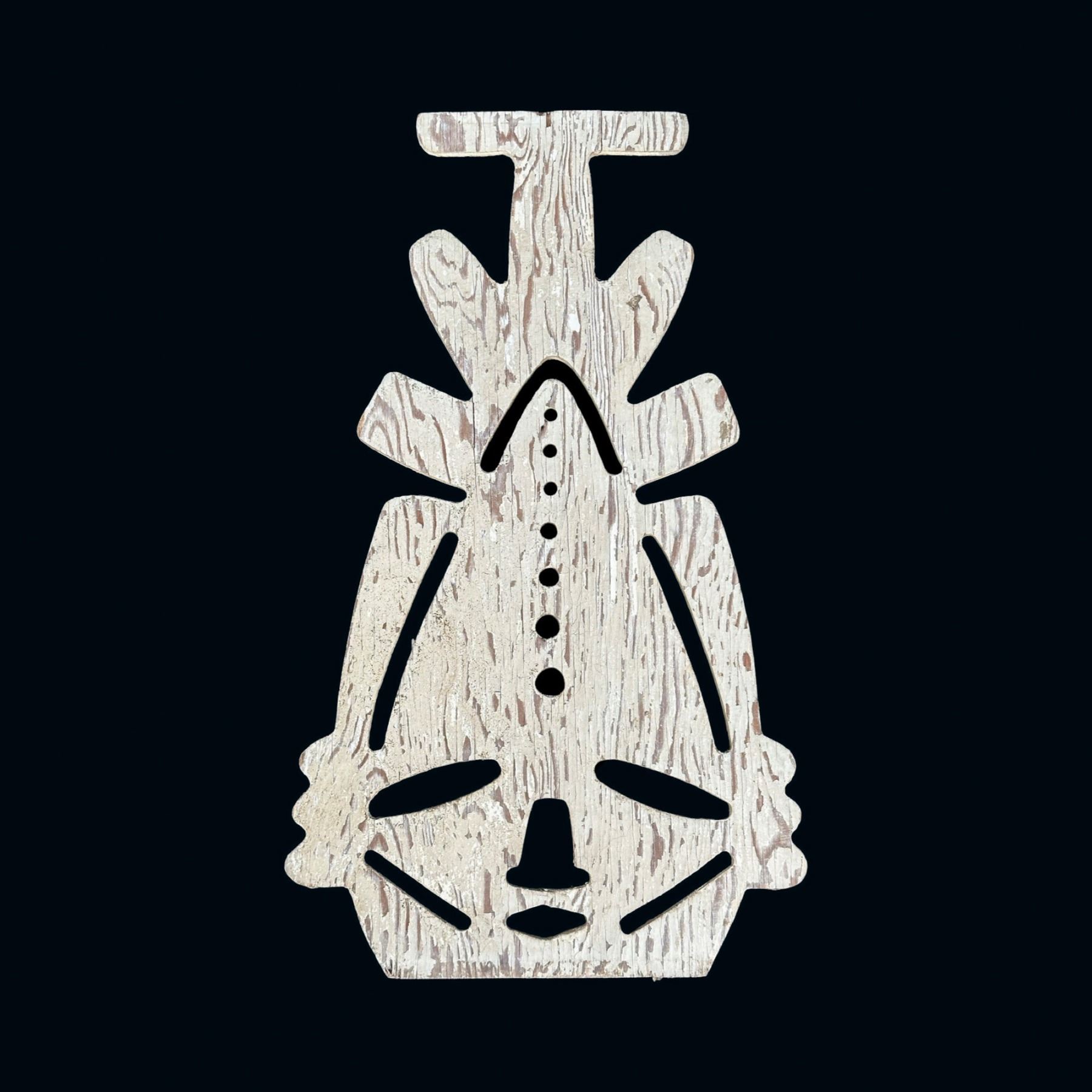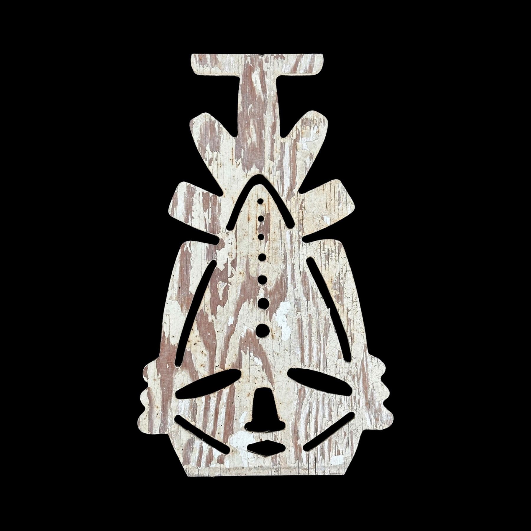 (1956) Here is a stunning artifact salvaged from the famed, Waikikian Hotel in Honolulu. Perhaps no commercial venture of the Poly-Pop era was more influential and forward thinking as the Waikikian. Designed by star architect Pete Wimberley with installation art by Ed Brownlee, the hotel and it's Tahitian Lanai bar and restaurant were trendsetting to say the least. These were installed in the guest rooms throughout the hotel as breezeway shutter screens that framed the hotel room balconies. They can be seen in the brochures of the period and several designs were randomly placed throughout the resort. These were rescued from the demolition of the complex which made way for a modern timeshare tower. This is a single of the "Cross-Head" breezeway mask. VG+ with weathered original paint. 8.25"x14.25".