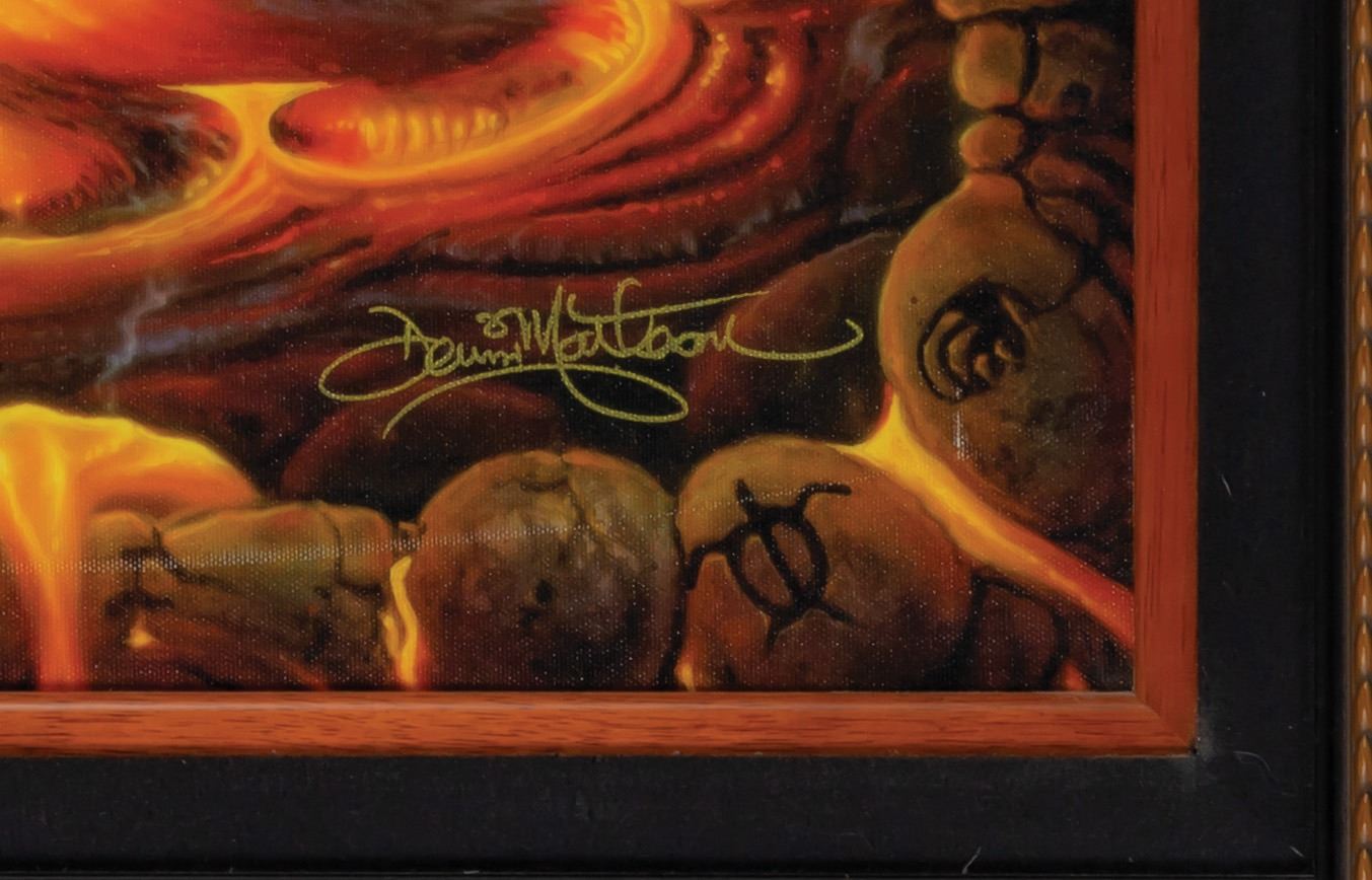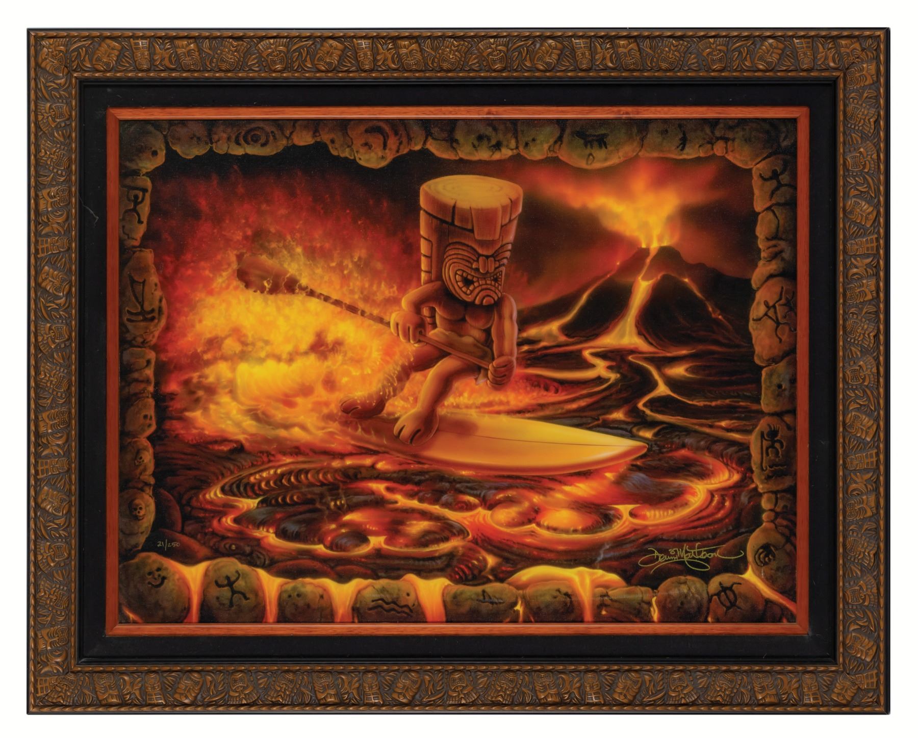 (2015) Totally cool painting of something so hot! Hand painted image of a Tiki idol surfing among the flaming lava of a volcano pit. Amazing border of Tiki symbols and masks on rocks. Signed and inscribed by famed Hawaiian artist Dennis Mathewson on the verso. Canvas on Tiki-themed carved wood frame. 37.5"x30" VG+.
