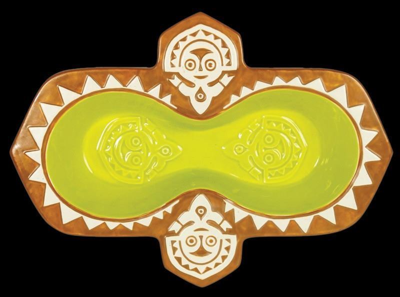 (2013) A beautiful Polynesian luau bowl created by artists Kevin Kidney and Jody Daily in celebration of the 50th anniversary of the Enchanted Tiki Room. Although this bowl celebrates the 50th anniversary of the Disneyland attraction, it is styled after imagery seen at the Polynesian Resort and features the Walt Disney World logo around the base.9"x12.25"x5.25".VG+ with typical wear.