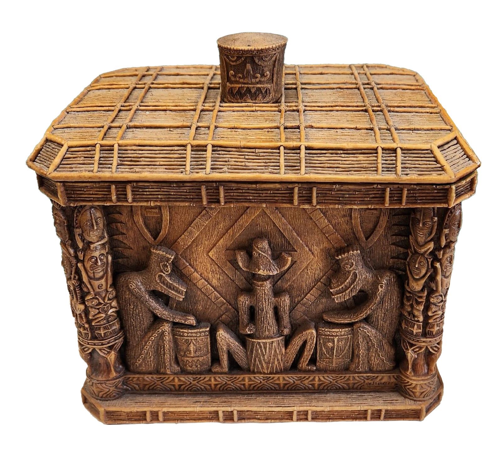 (2007) Rare 2007 Olszewski "Tiki Drums" trinket box released by Disneyland for the 45th anniversary of Walt Disney's Enchanted Tiki Room. This was produced in a limited edition of 1963, in honor of the Tiki Room's debut year. These quickly sold out as do most of the Olszewski miniatures created on park recreations. The sculpt is highly detailed and features the famous Tiki drummers that can be found in each of the four corners of the Tiki Room main show area. 6"x7.25"x5.23". VG+ with minor wear and worn areas of the felt under the base.