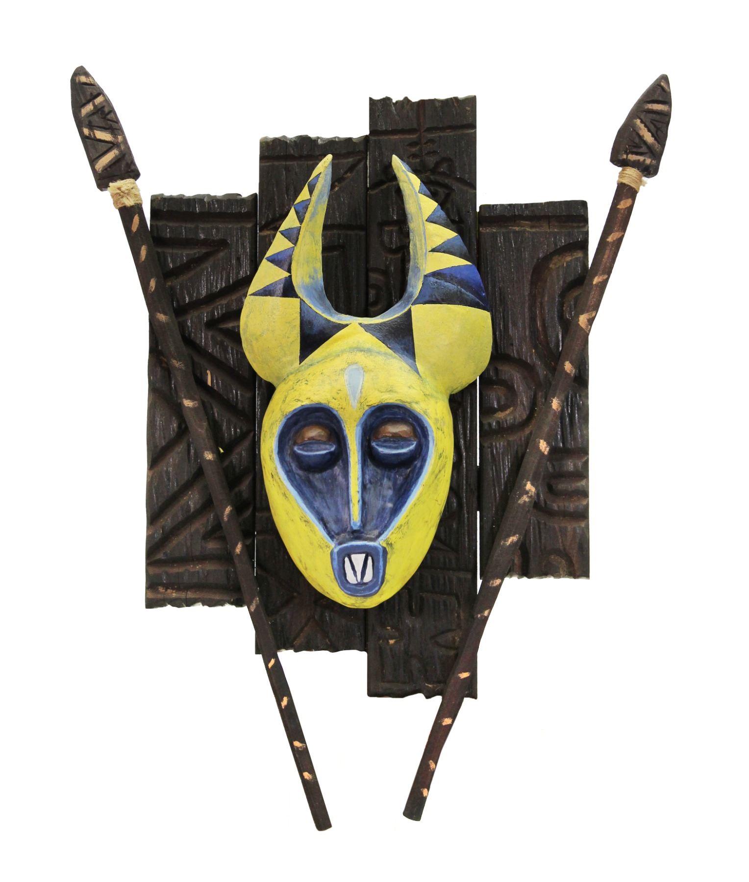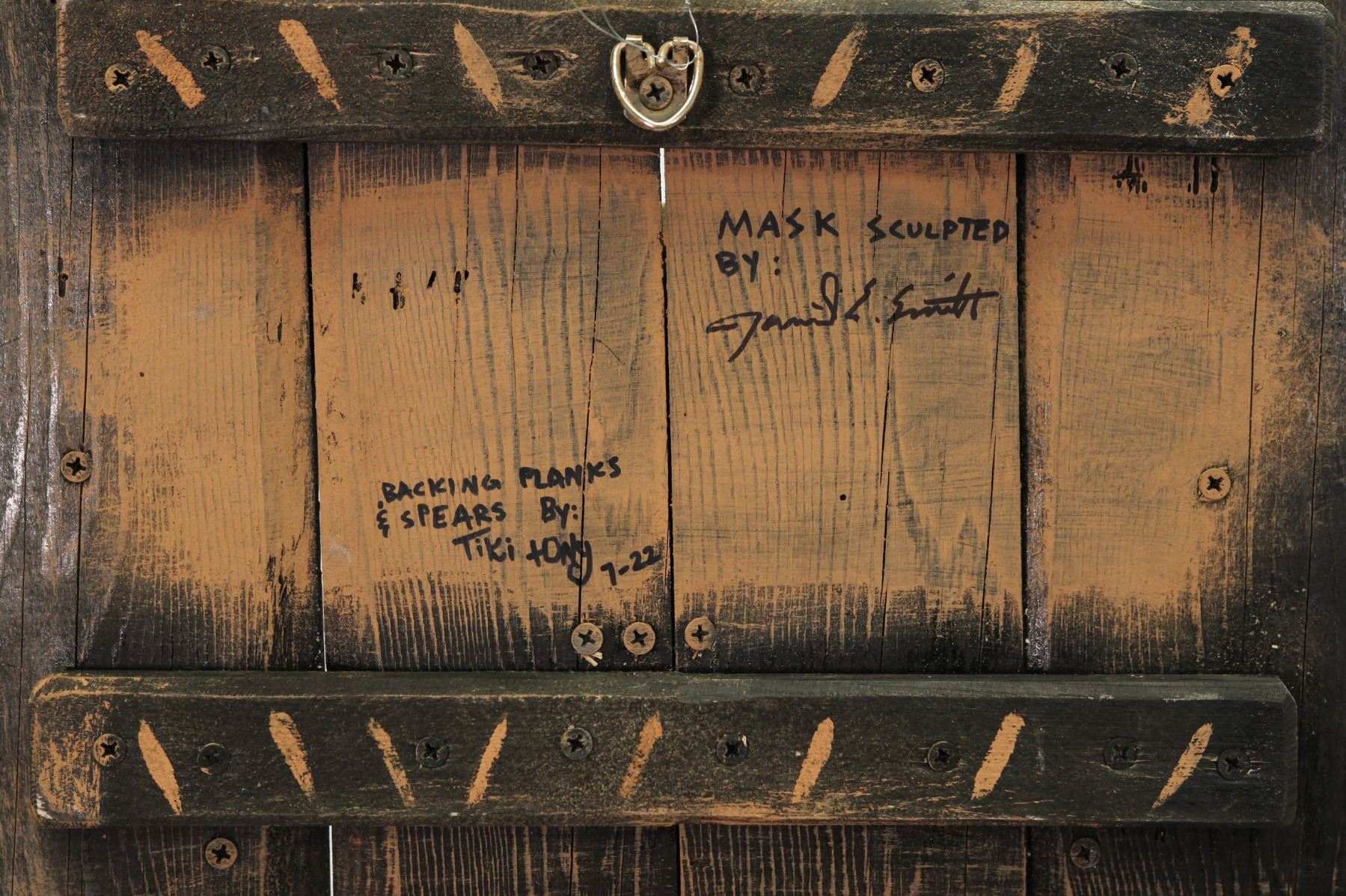 (2022) Here’s an incredible item, from incredible artists for an incredible cause! From Dan Smith and Tiki Tony comes this eye-catching collaboration piece created as an homage to Walt Disney’s ADVENTURELAND in Disneyland, USA! This mask can be seen on the Jungle Cruise attraction and in Adventureland itself in both Walt Disney World and Disneyland, not to mention every other Disney park across the globe! The gorgeous paint job on the mask itself is painted with a nice vintage polychrome patina and the carved spears and backing were fashioned by Tiki carving virtuoso, Tiki Tony! The best part of owning this epic piece of Exotica is that the proceeds go to a most worthy cause, St. Jude’s Children’s Research Hospital. So, go ahead, win this not only for yourself, but to help a cause Walt Disney himself would approve of! Imaginative and creative Tiki mask wall hanging hand carved and painted. Features horned yellow and blue painted mask with crossed spears on tribal carved backing. Solid wood. Signed by artists. 25"x19". VG+. PROCEEDS FROM THIS LOT GO TO ST. JUDE"S CHILDREN'S RESEARCH HOSPITAL.