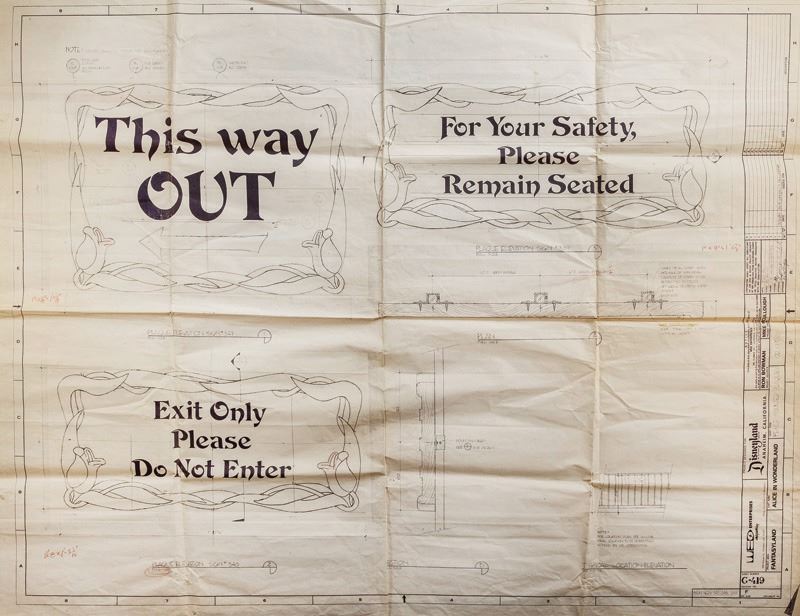 (1983) Signage blueprint for the New Fantasyland project at Disneyland. Carved by Oceanic Arts.36"x48".VG+ fold creases and general wear from use.