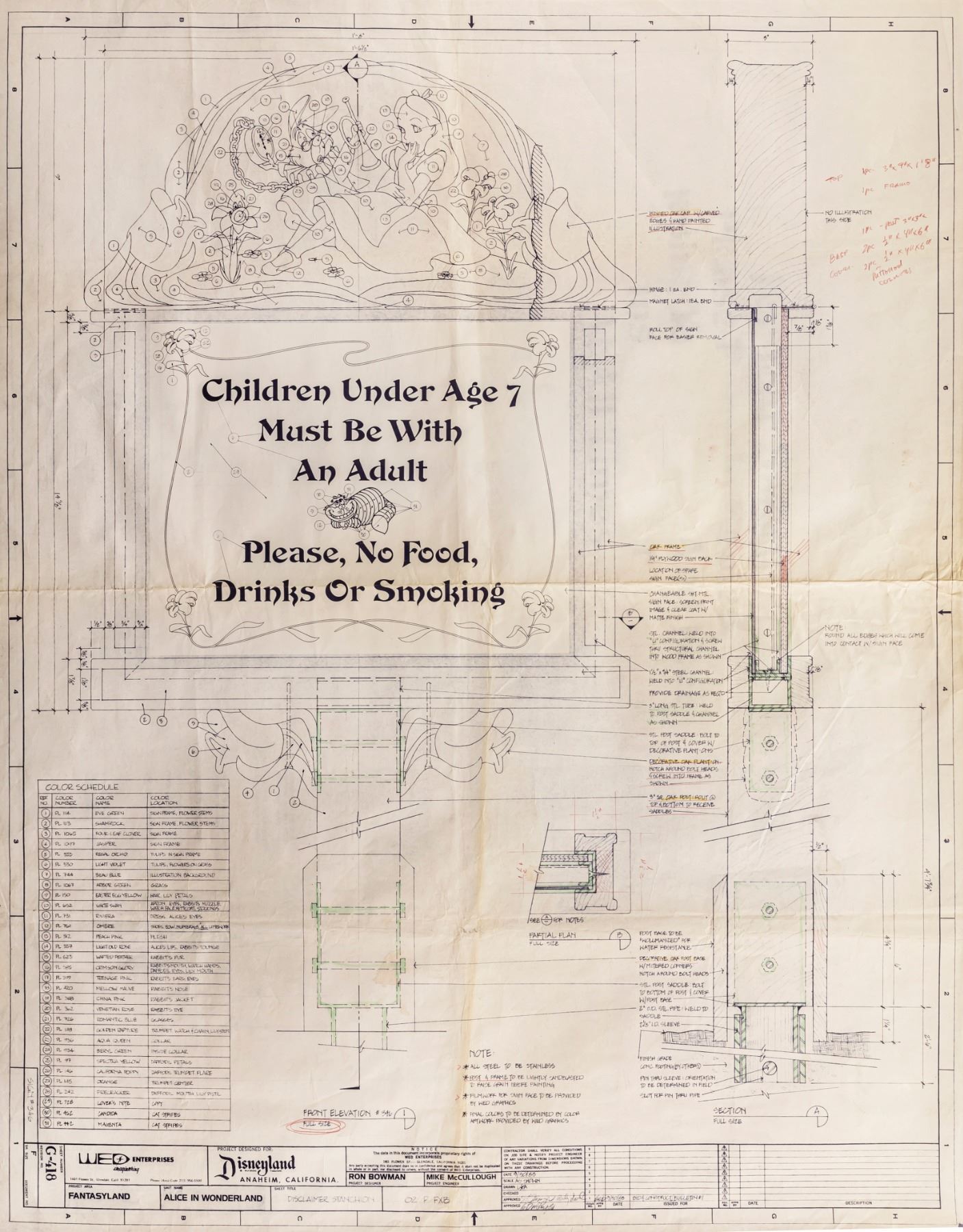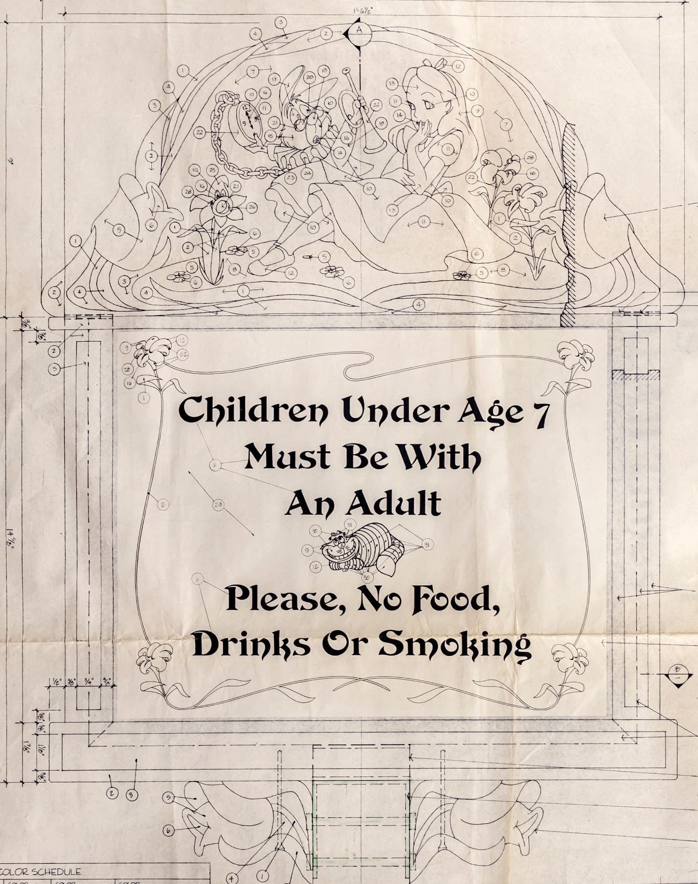 (1983) A classic Disneyland informational safety sign that stood at the entrance to the Alice in Wonderland dark ride entrance for decades. The sign was carved in wood by LeRoy Schmaltz. Later, that wood sign was cast in fiberglass. A nice slice of Disneyland history! 48"x36". VG+, folded with edge creasing and general wear.