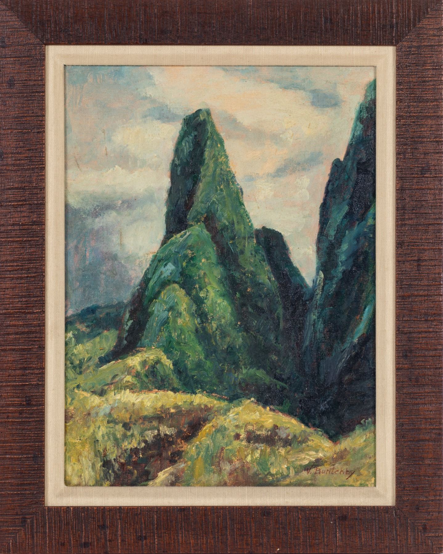 (1950s) A dramatic oil painting of the Iao Needle mountain on Maui. Surely, the painter was taken with inspiration for this oil on canvas painting. Dreamy sky background. White mat with carved faux wood frame. 16.25"x20". VG+.