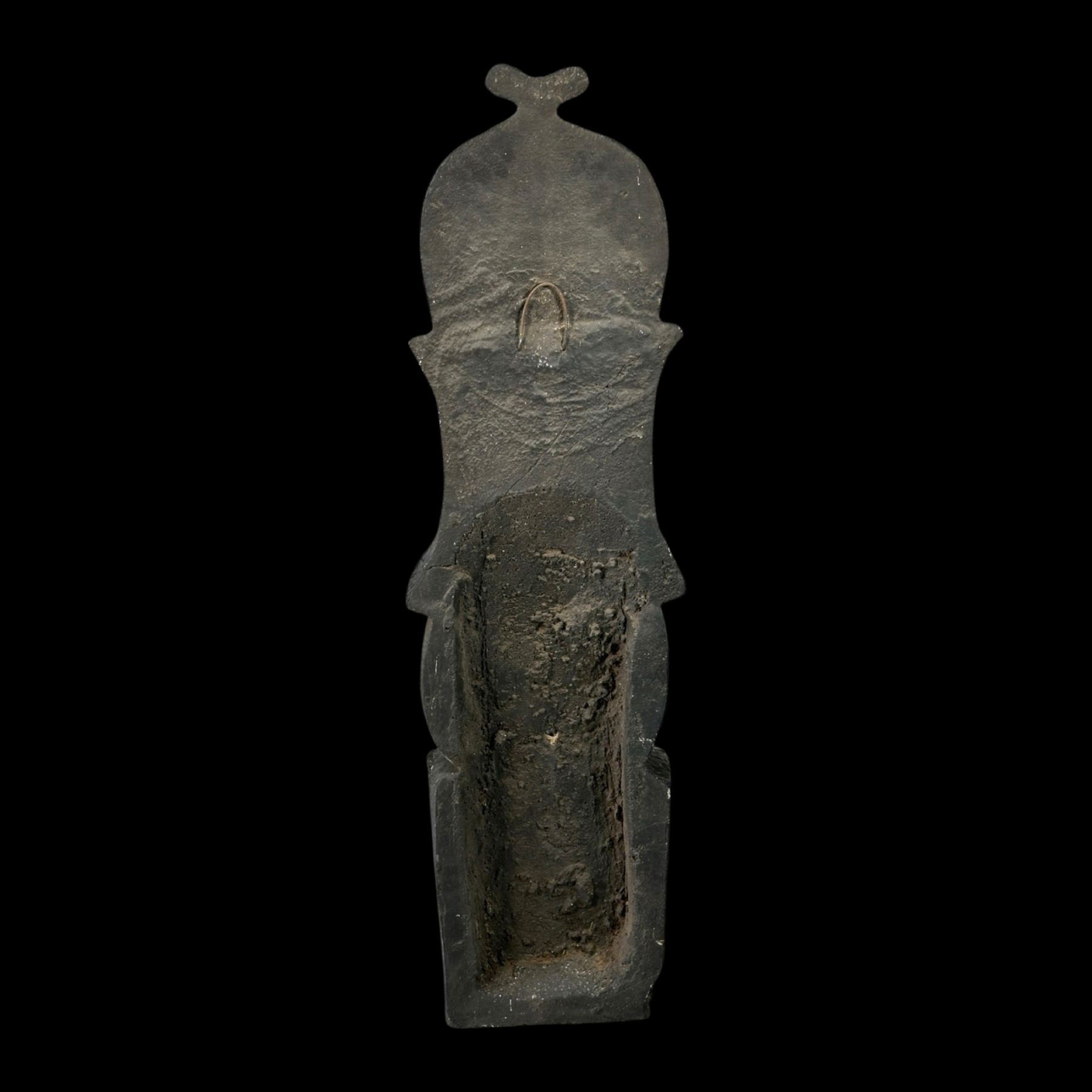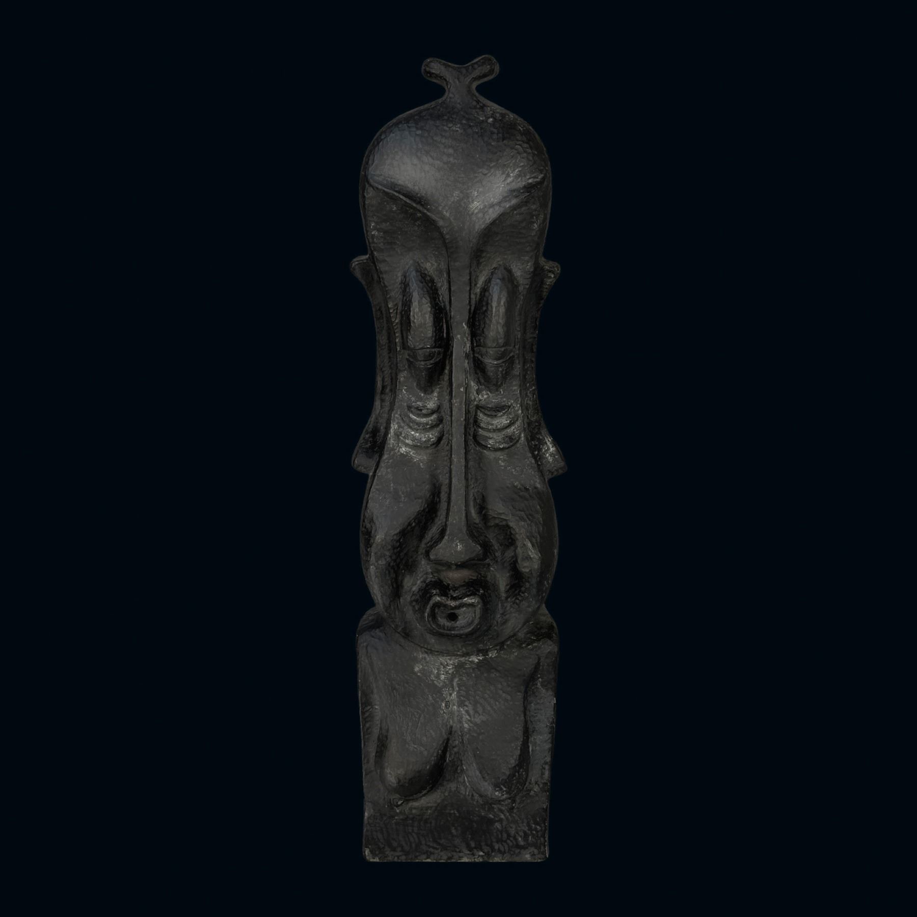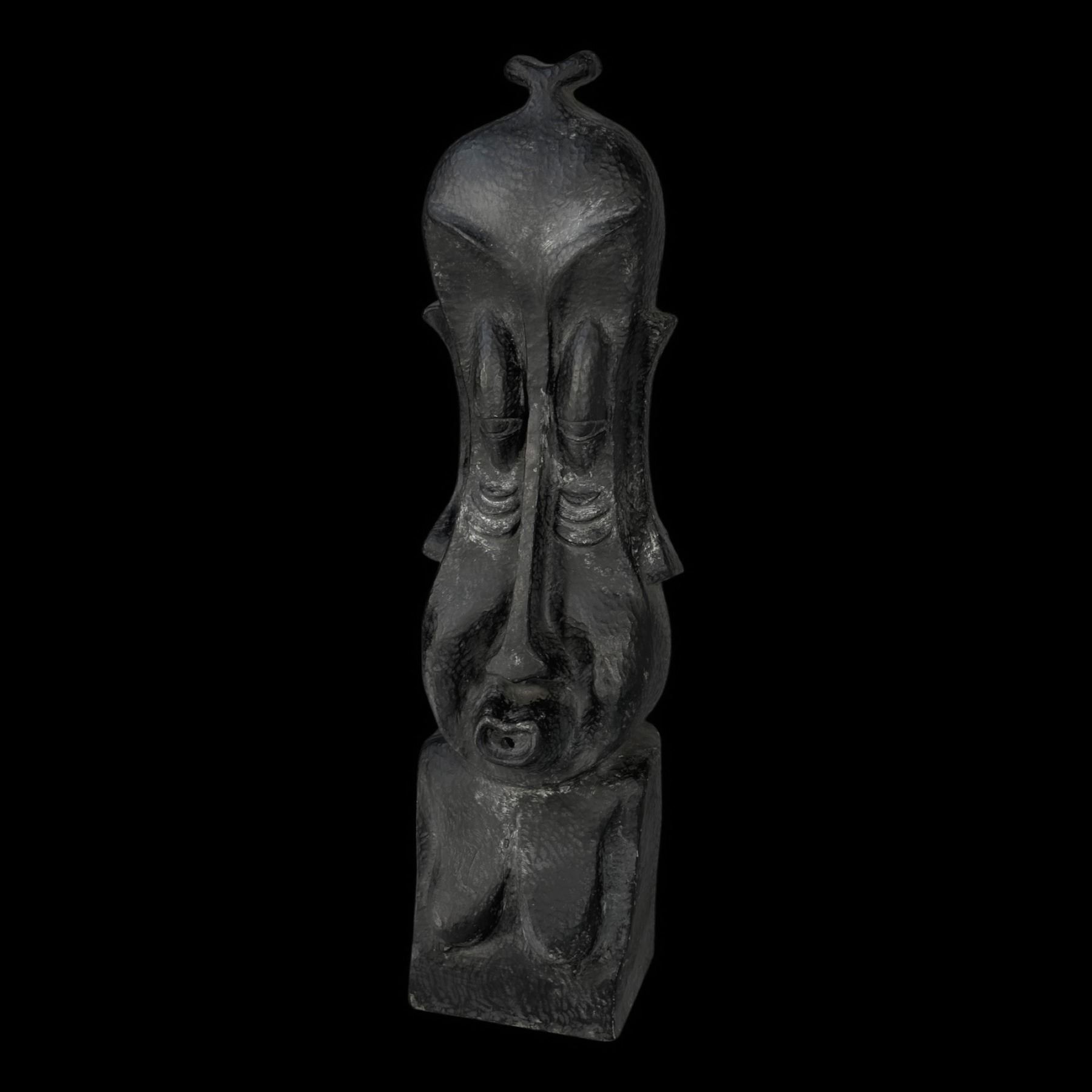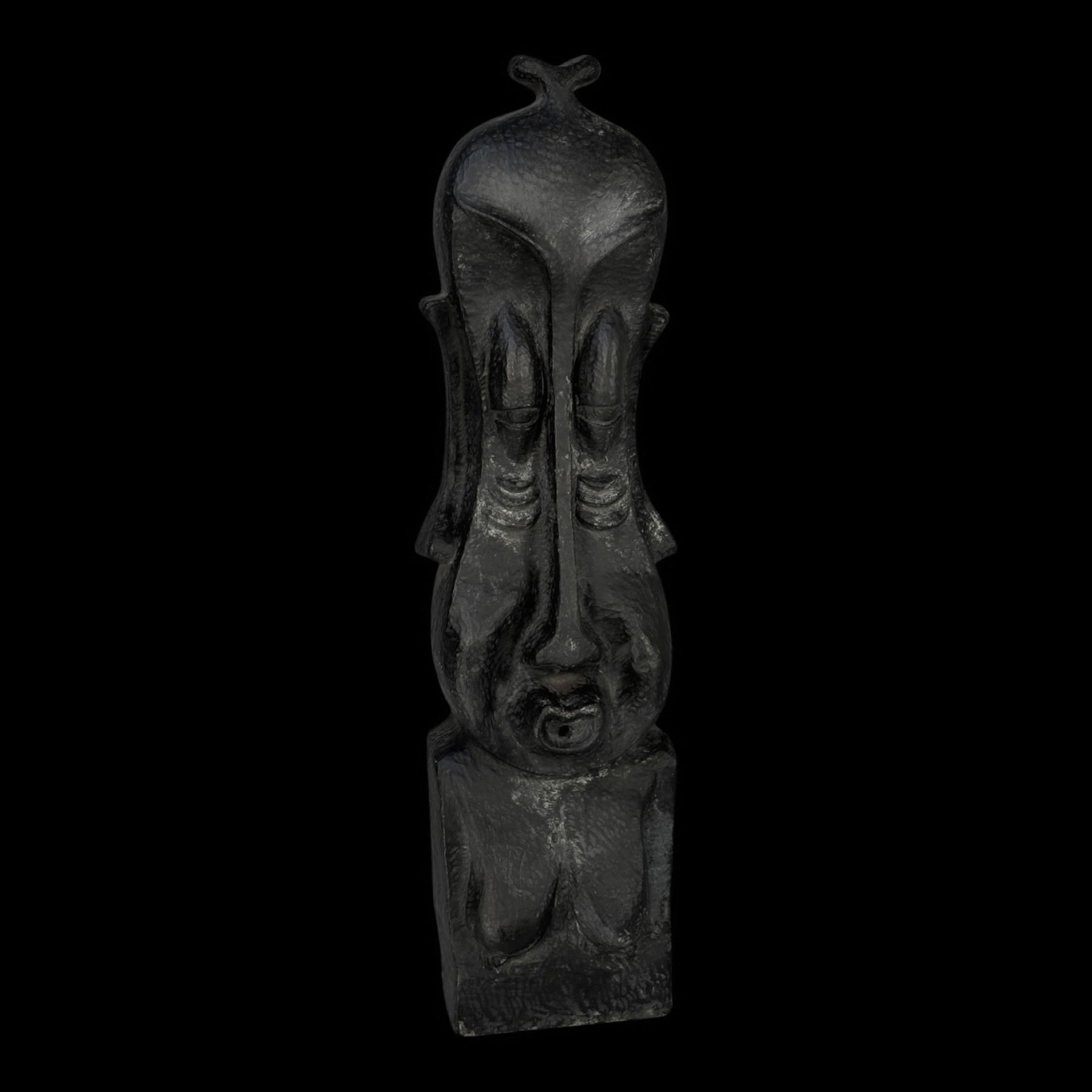 (1960s)* Another paradigm of cartoony pop primitivism. Sven discovered the first example at the Kona Kai Mobile Village in Canoga Park in the 1990s. (as seen in the Book of Tiki page 229) Since then he encountered a white version at the Hale Hawaii bar in Torrance and prominently, another black one at Spike's Breezeway in Costa Mesa. Is equipped with flow port for rigging as a fountain. This heavy item will require special shipping considerations. VG+. 12.5"x47"x8.75".