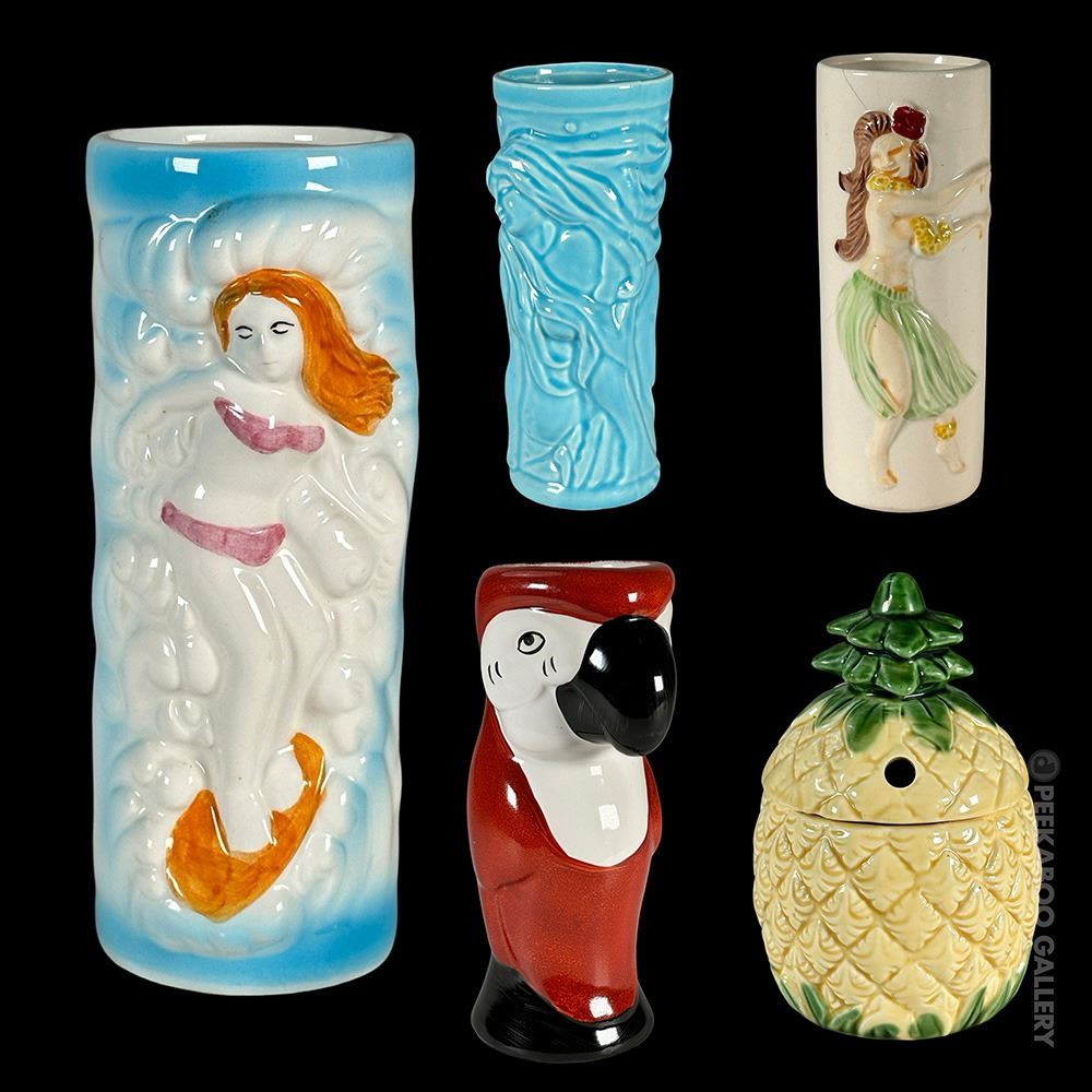 (1970s) VG+ with typical wear. Hula Girl mug has climate cracks. See photos. Surfing-6.75"x2.75"dia, Mermaid-6.75"x3"dia, Pineapple-6"x4"dia, Parrot-8"x4.25"dia, Hula Girl-6.5"x2.5"dia.