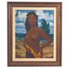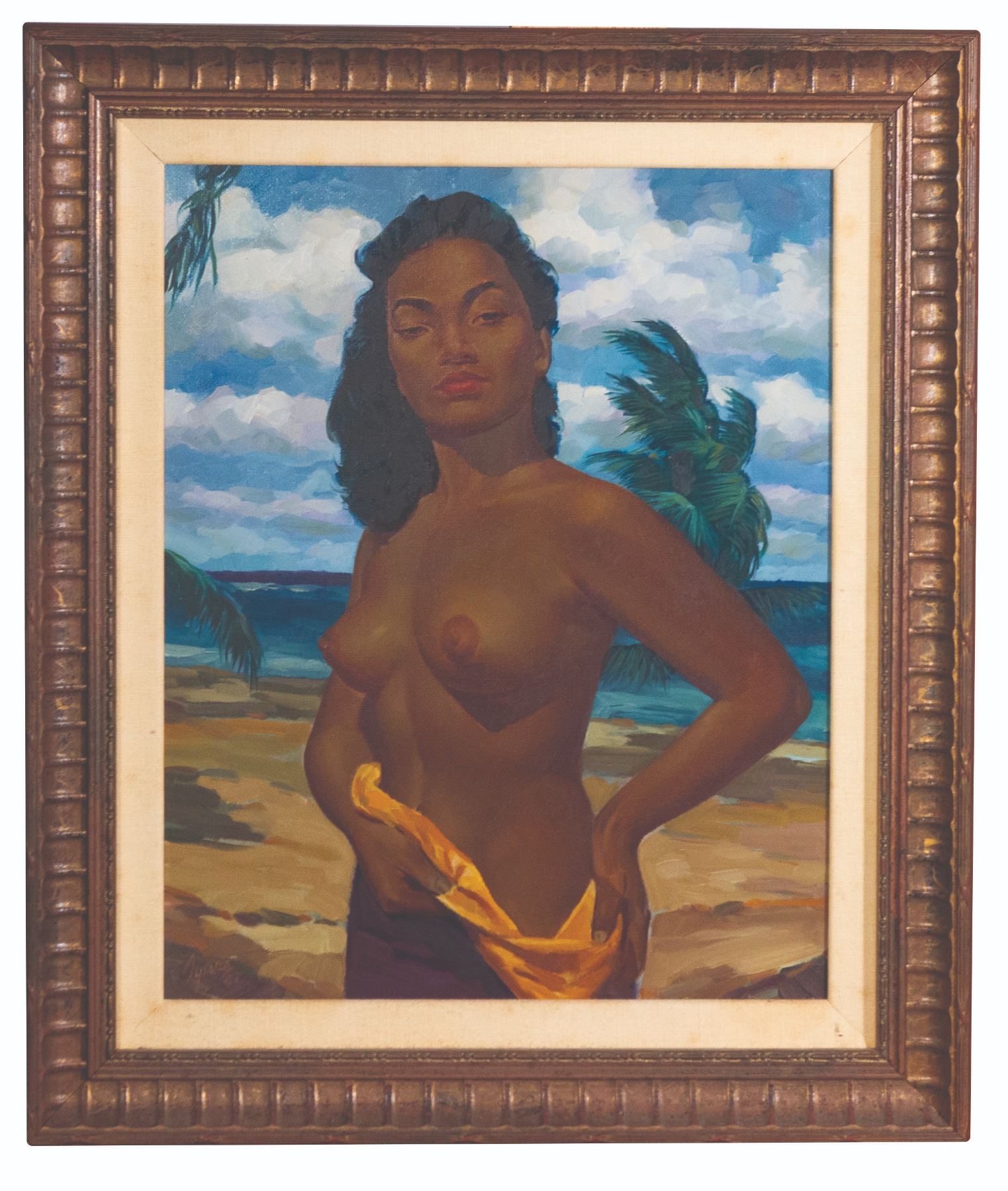 (1961). Swaying palm trees, a muted colored sandy beach, and white clouds against a bright blue sky provide a brilliant backdrop for this hand painted topless island woman. A classic, early rendering from the famed apprentice to Leeteg, Ralph Burke Tyree (1921-1979). This is an original oil as offered at Tyree's studio, personally overpainted of a canvas print. Framed with a thick canvas matting and carved wood frame as sold at the Tyree studio. 20.75"x24.5". VG+.