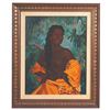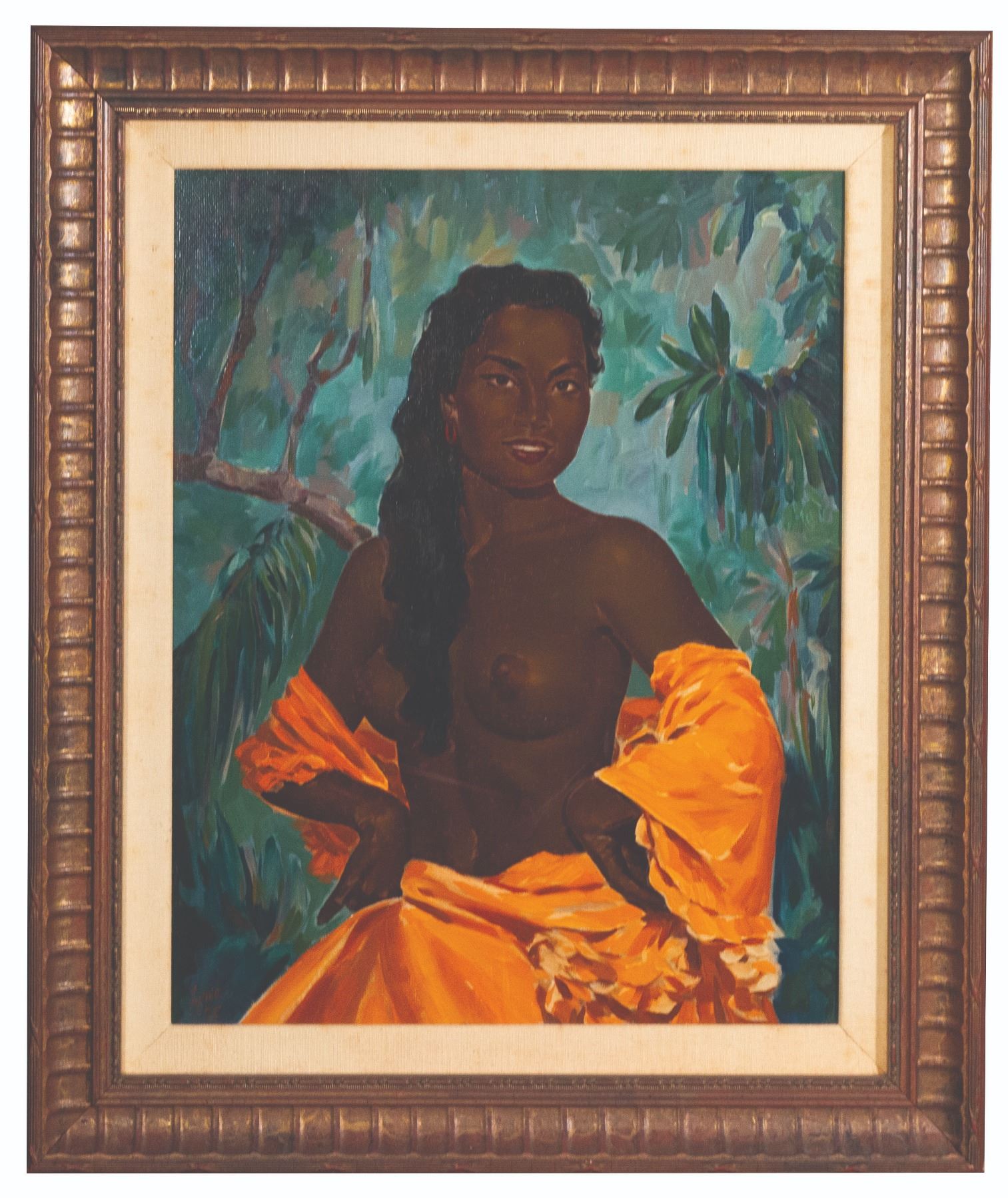 (1955). Wonderful contrast of colors depicted in this painting of a topless island woman. The vivid orange wrap along with the deep skin tones set against a lush, muted tropical background makes an eye capturing image. A classic, early rendering from the famed apprentice to Leeteg, Ralph Burke Tyree (1921-1979). This is an original oil as offered at Tyree's studio, personally overpainted of a canvas print. Framed with a thick canvas matting and carved wood frame as sold at the Tyree studio. 20.75"x24.5". VG+.
