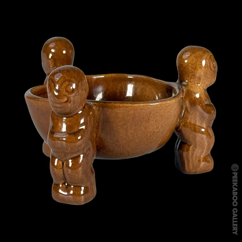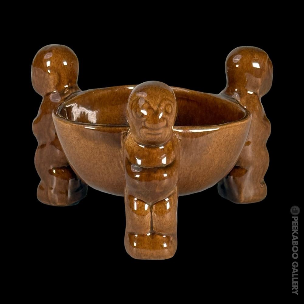 (1960s) Early Desert Ceramics version of classic tri-Marquesan figural Scorpion bowl, originally by Spurlin Ceramics. This came into production at DC shortly after their buyout of Spurlin. This version is slightly smaller than the later Orchids of Hawaii bowl of the same type. VG+. 4.5"x6.75"dia.