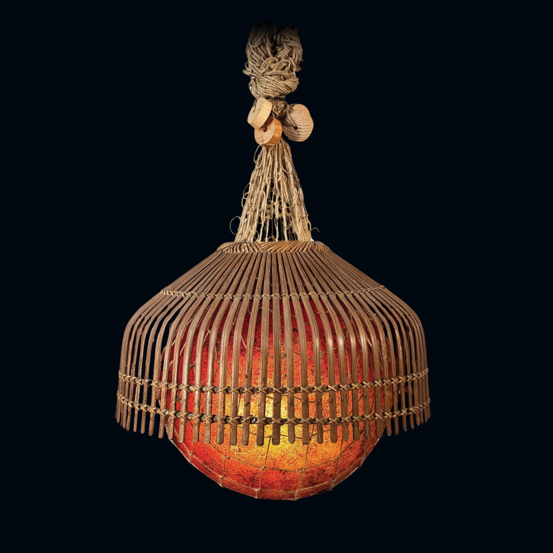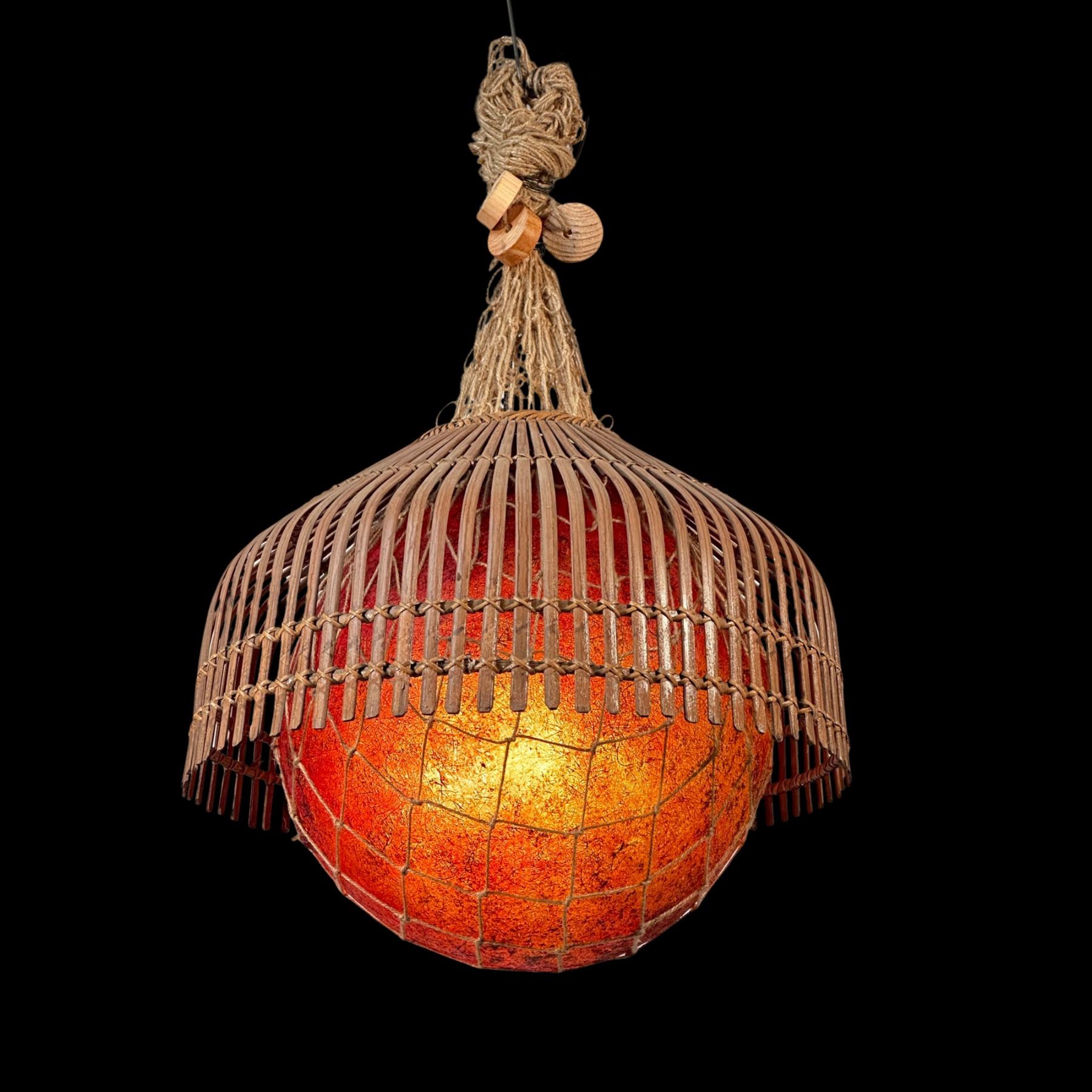 (1950s)* A very special lamp in the 'beachcomber' style of a netted plastic red fishing float topped with a rattan fishtrap shade. Acquired by Sven from Kelbo's upon their closure. VG+ with typical wear. 16"dia x 14".