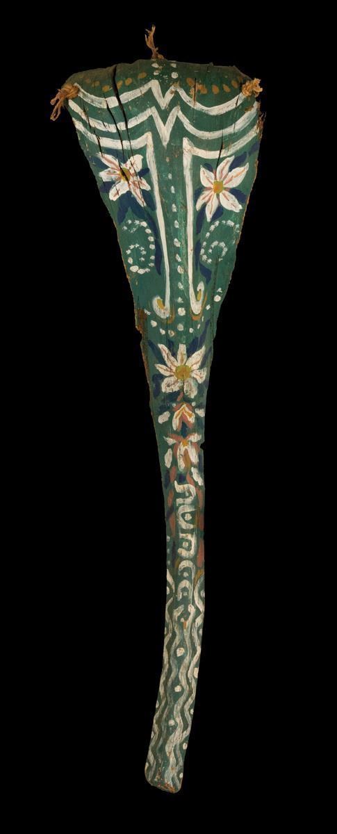 (1950s) An early LeRoy palm mask painted with a floral pattern.41"x12".VG with paint wear.