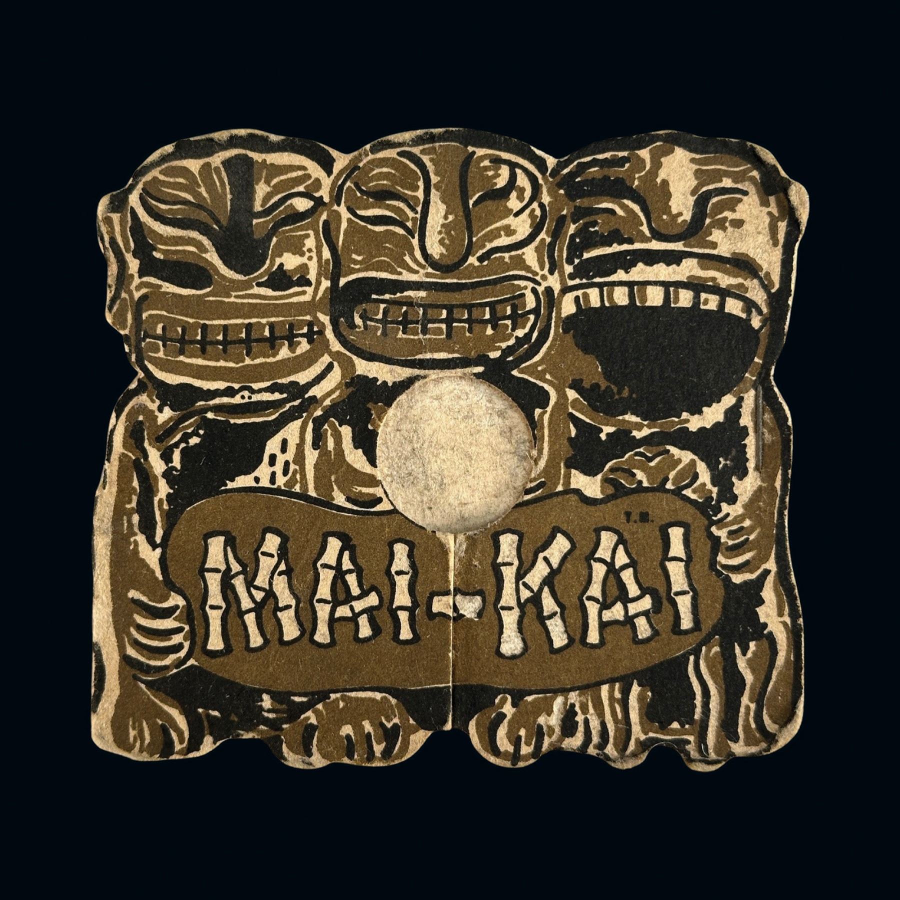 (1950s)* Attention to detail was a cornerstone of the Thornton brothers mantra at the MAI-KAI. One can see the pride in this artifact of the MAI-KAI's early years: A graphic coaster that slipped over the base of stemware drinks featuring the famous signature MAI-KAI Cannibals logo. VG+ with wear. 4"x3.5".