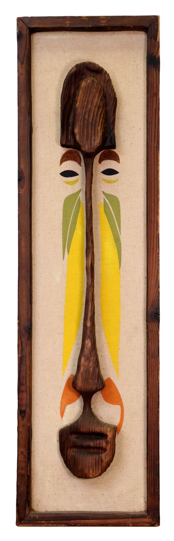 (1960s) Vintage WITCO catalog offering. This primitive-moderne masterpiece is one of the early pieces created by William Westenhaver. Stylized Tiki wall art features elongated wood carved facial features with painted facial enhancements on textured canvas backing to create a multi-dimensional look. Wood frame. 10"x36". VG+ with some minor wear wear to frame and foxing.