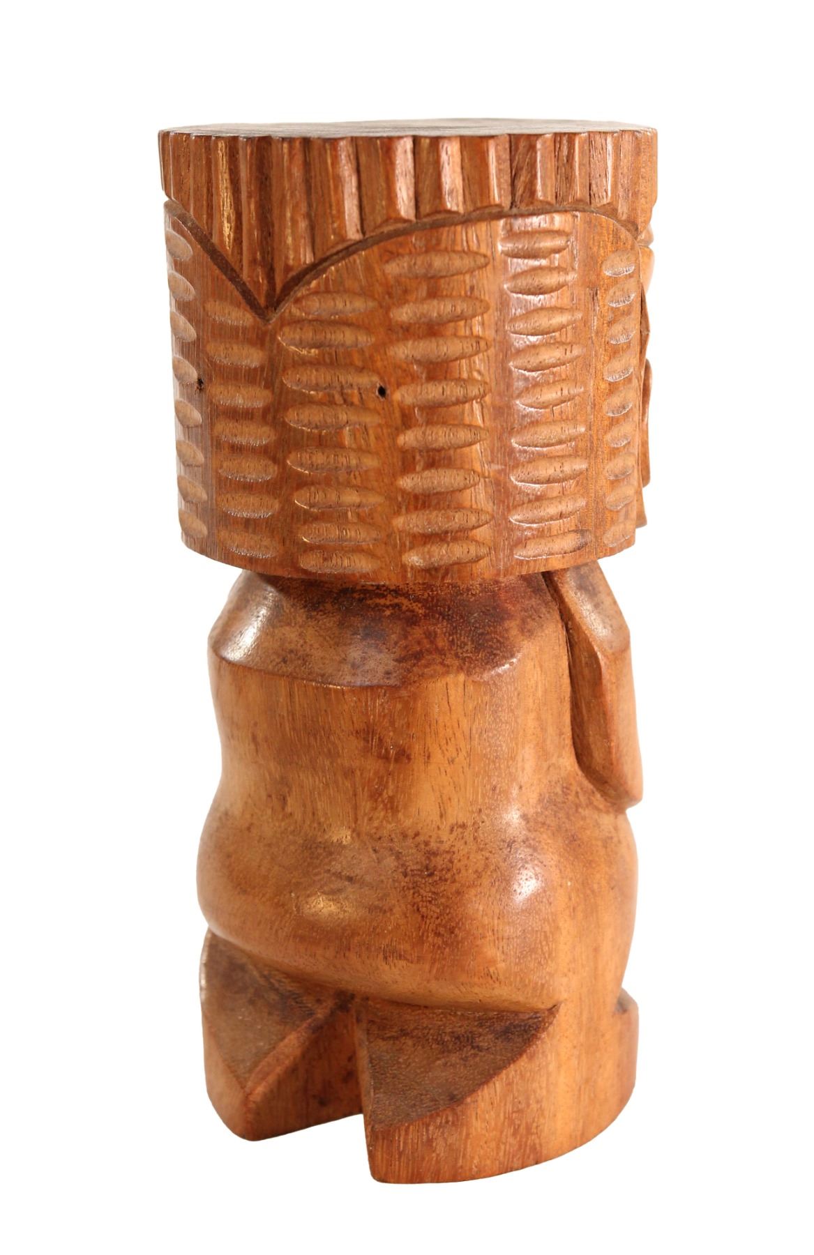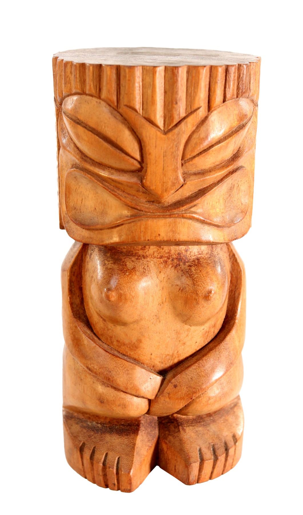 (1960s) An early version of #201 by Oceanic Arts, this polished wood Tiki idol is a stylized representation of the Goddess, Pele. Hand carved female Tiki figure features obvious breasts and detailed traditional Hawaiian Tiki idol face. Handsome carving. Solid wood. 10"x4.75". VG+ with typical wear.