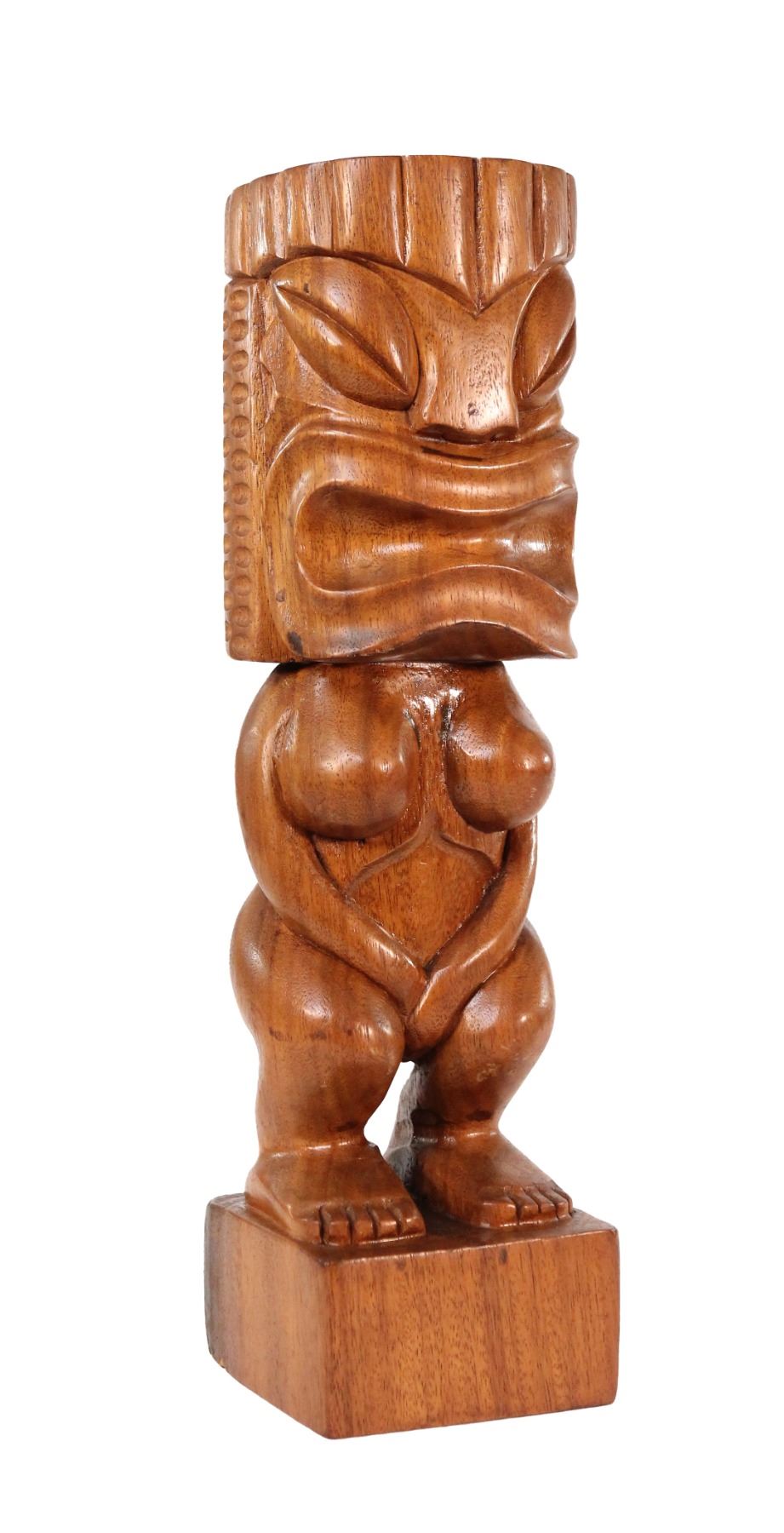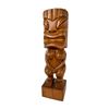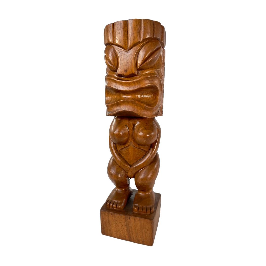 (1960s) An early version of #201 by Oceanic Arts, this polished wood Tiki idol is a stylized representation of the Goddess, Pele. A stark contrast from the myth that the Tiki idol was predominately male. Female idols, though generally carved to indicate fertility, were also created to represent female power. None more so than the Goddess Pele herself! Represented here in beautiful koa wood, she stands upon a solid wood on base. 17.75"x5". VG+ with typical wear.